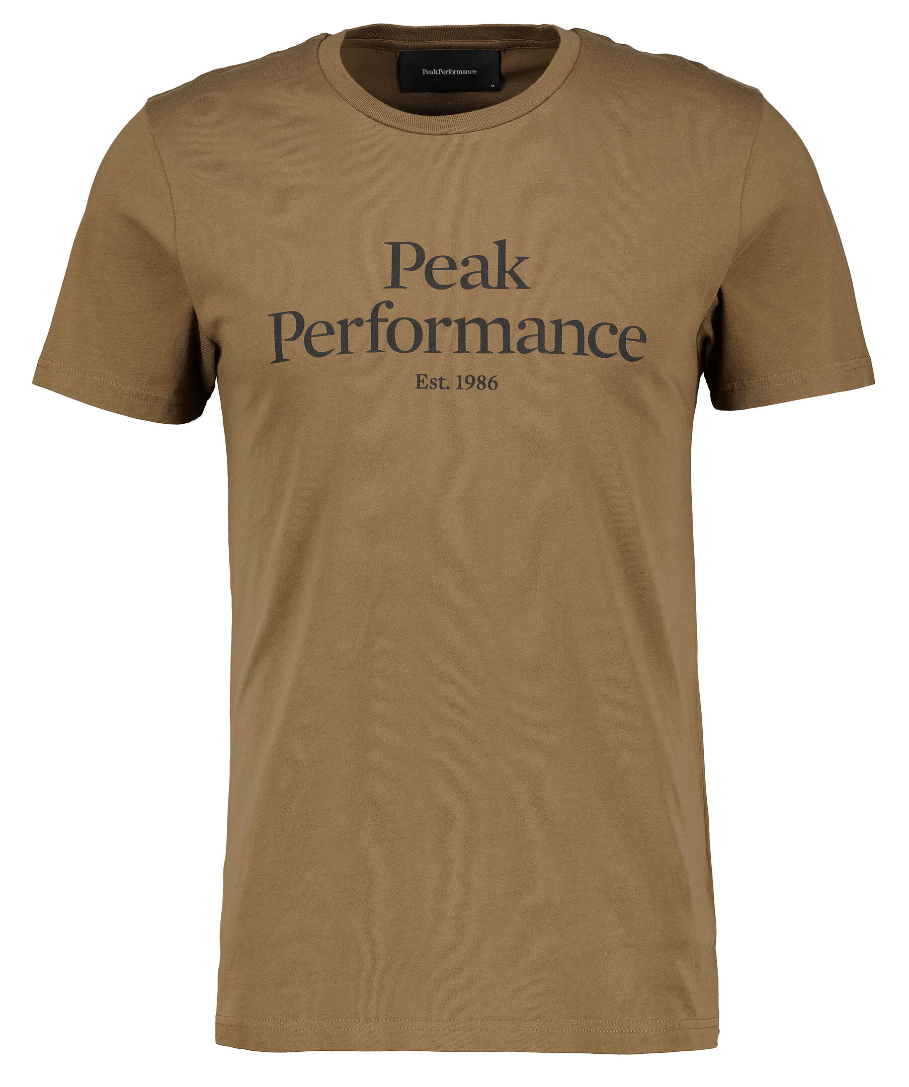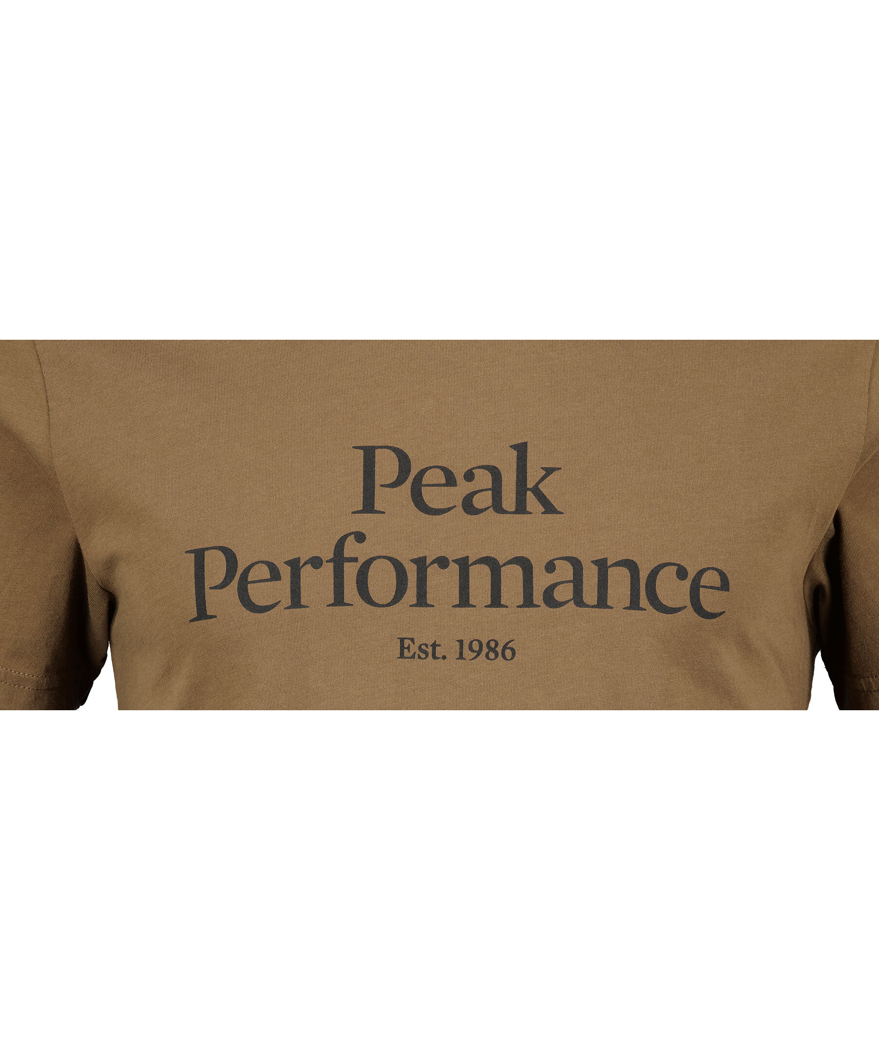 Brun t-shirt från Peak Performance. Stor, svart logotyp printat på bröstet samt tunn ribbad halsringning. Tillverkad i 100% bomull.