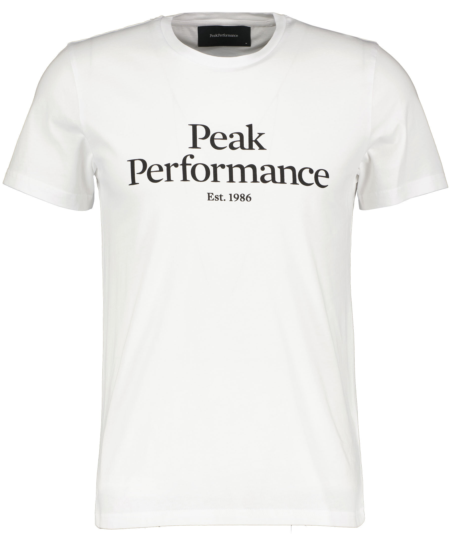 Vit t-shirt från Peak Performance. Stor, svart logotyp printat på bröstet samt tunn ribbad halsringning. Tillverkad i 100% bomull.