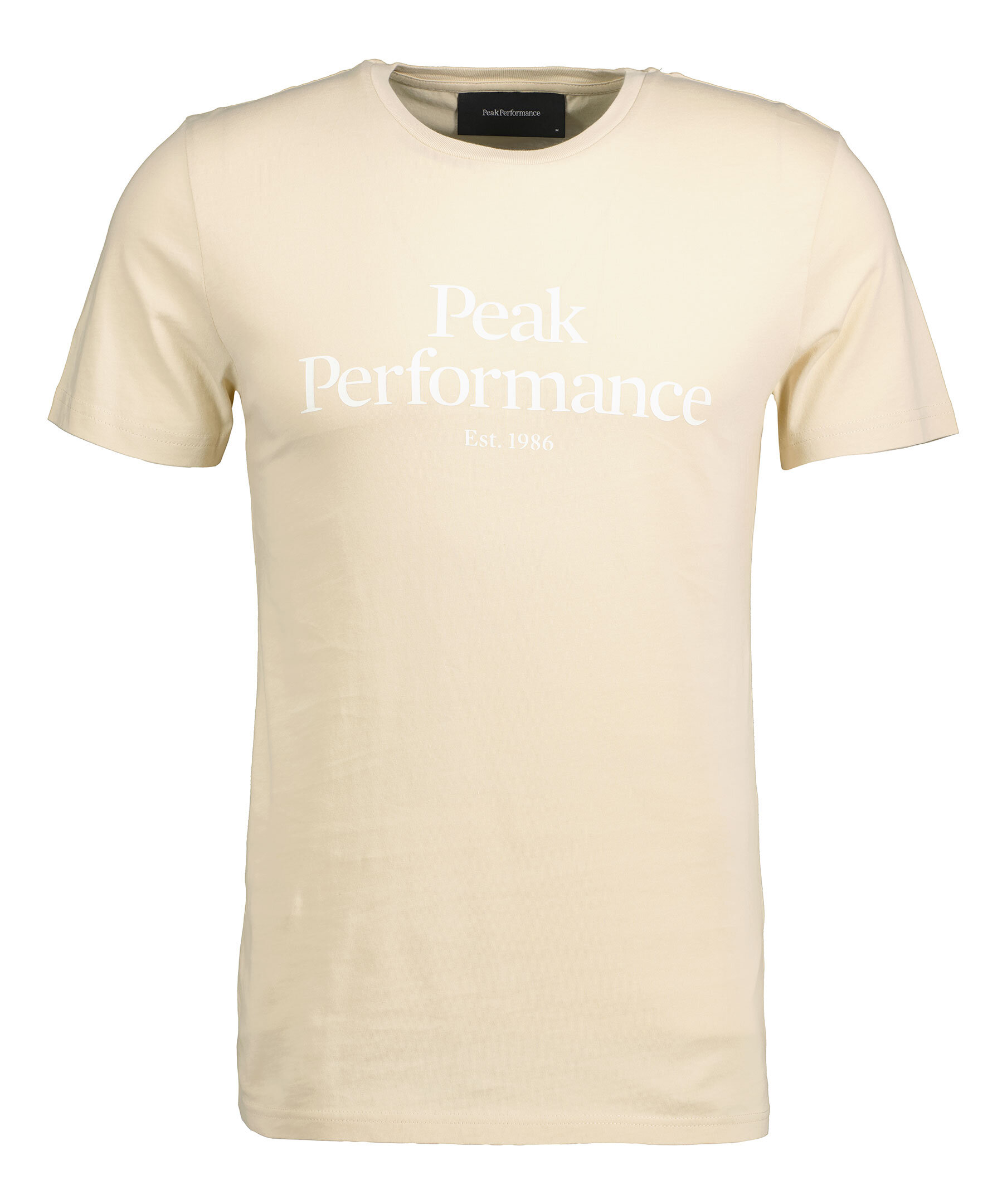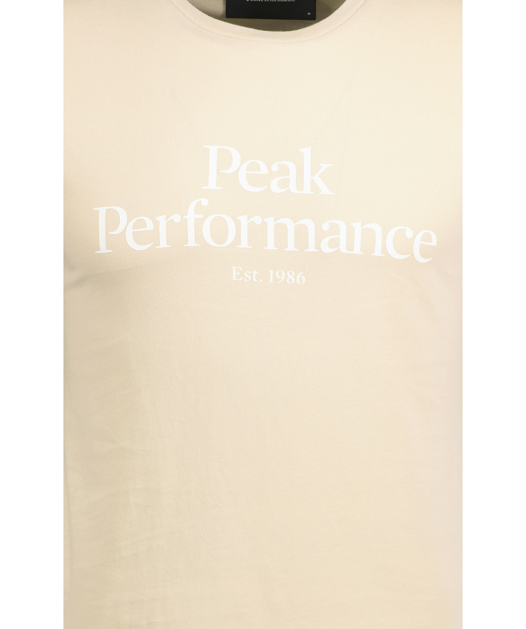 Ljusbeige t-shirt från Peak Performance. Tillverkad i 100% ekologisk med tyg av högkvalitativ bomullsjersey som gör att den känns otroligt mjuk och skön. Rundad halsringning med tunn ribbad kant och en stor, vit logotyp tryckt över bröstet.
