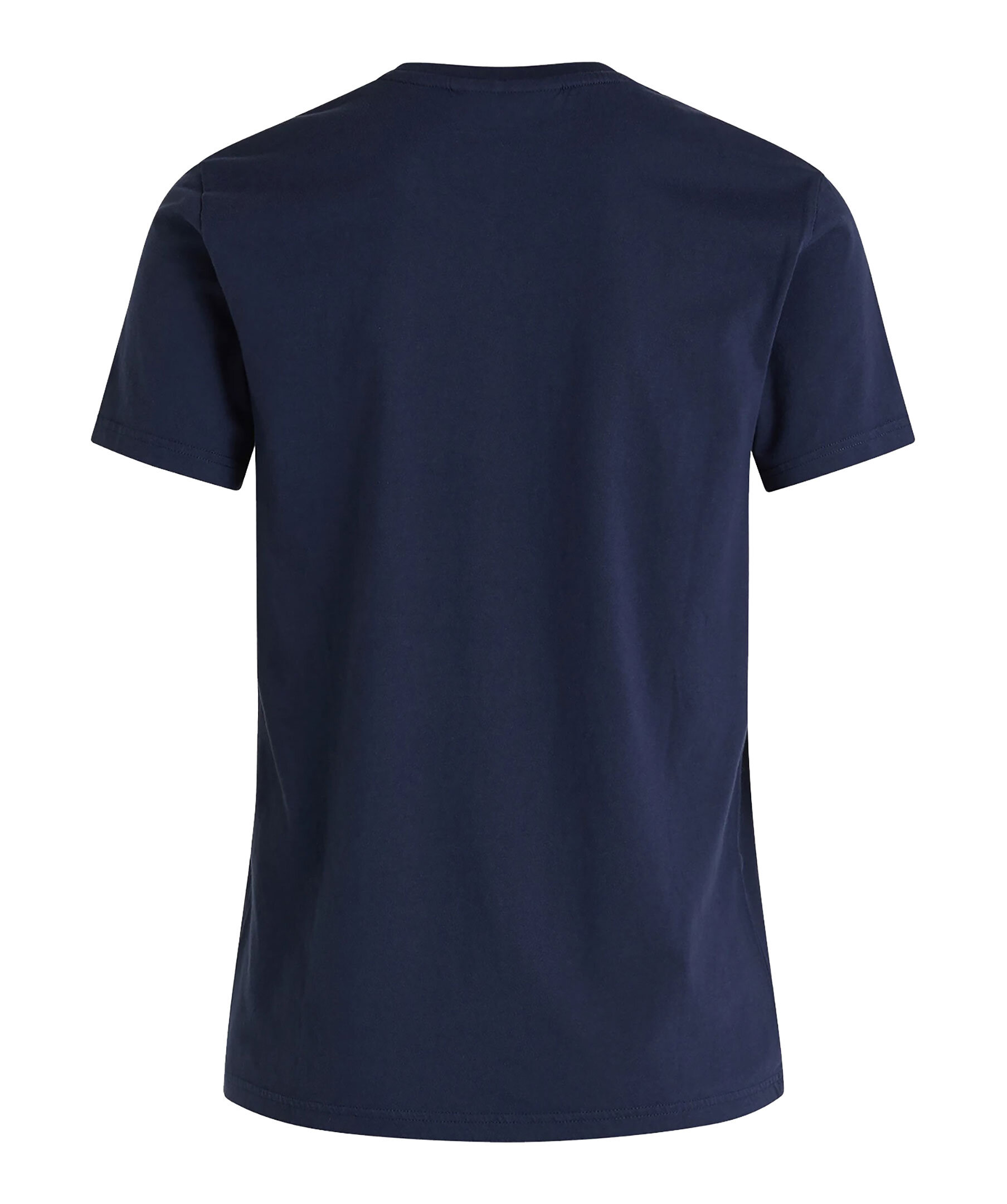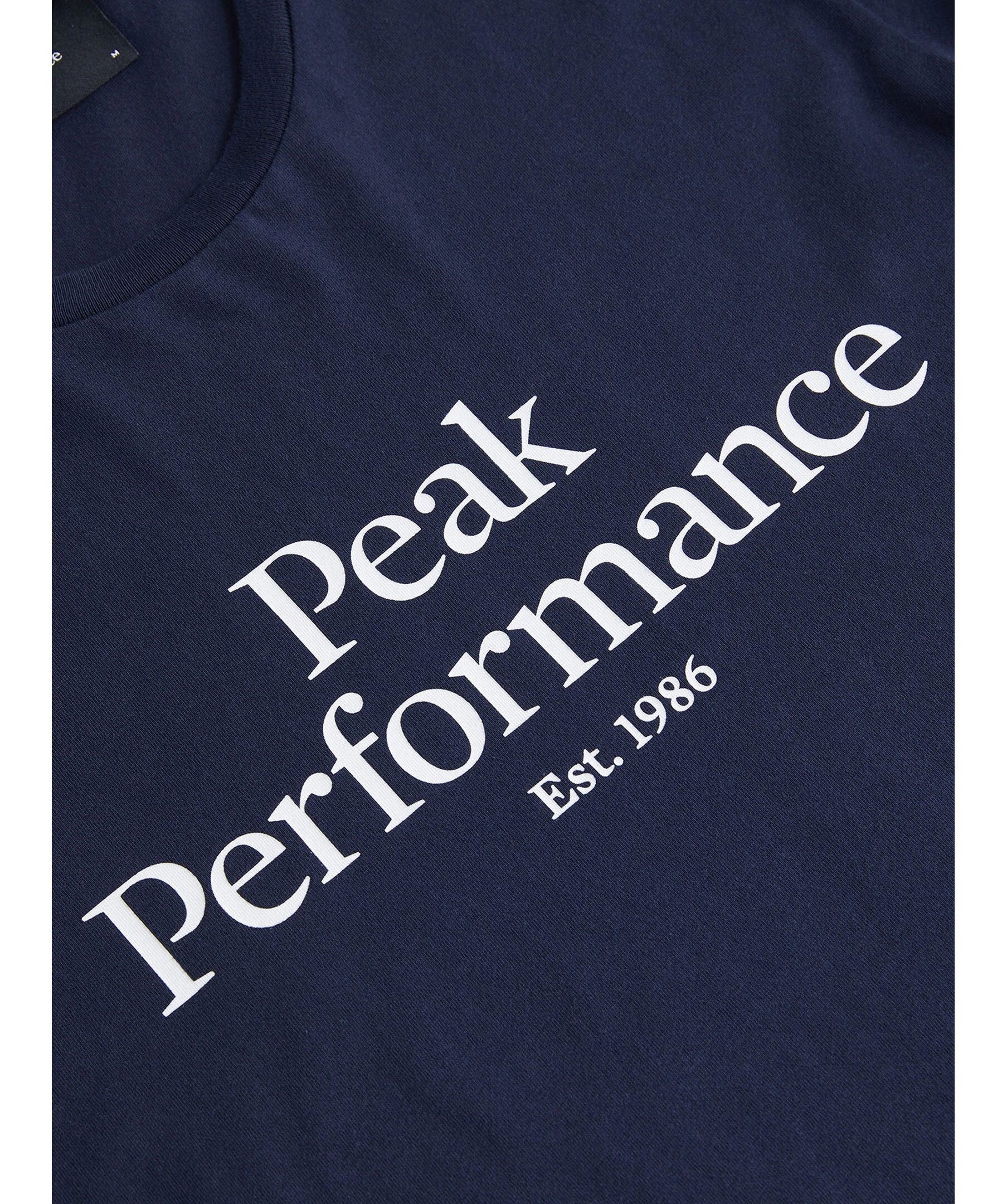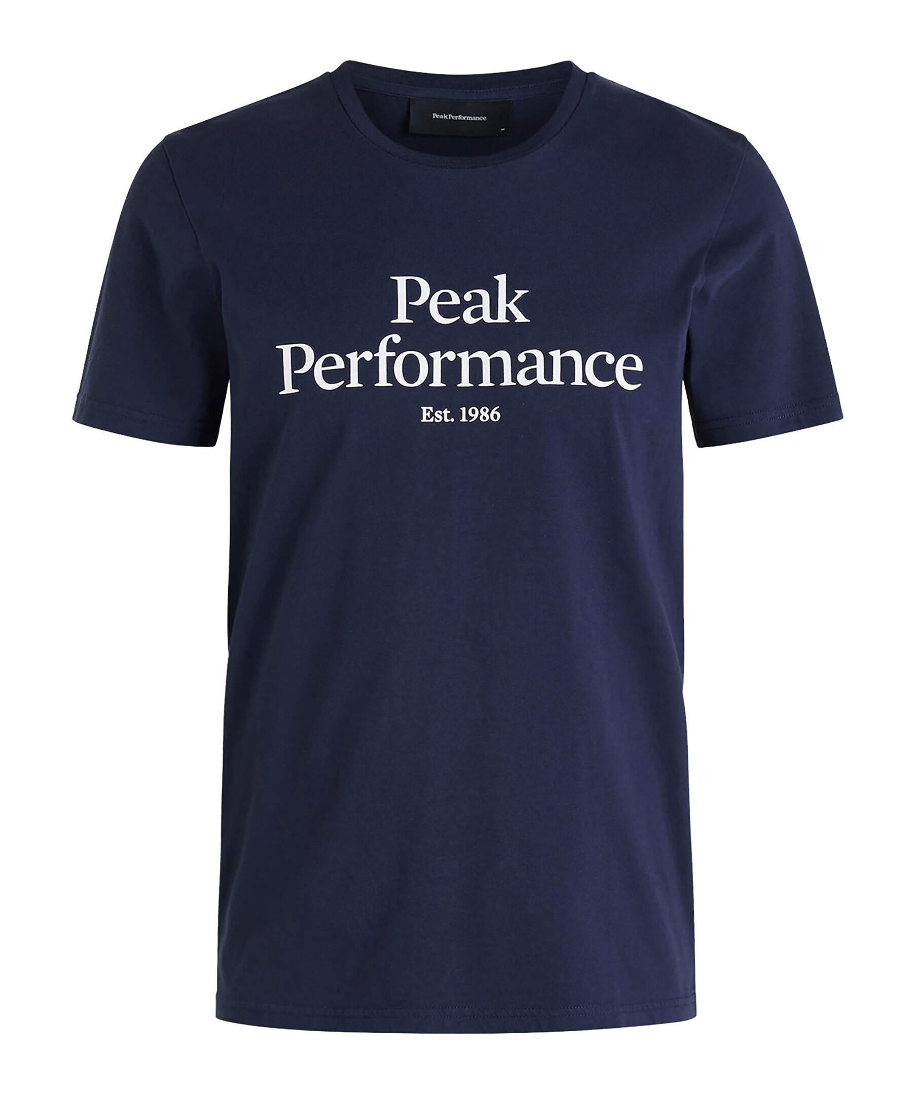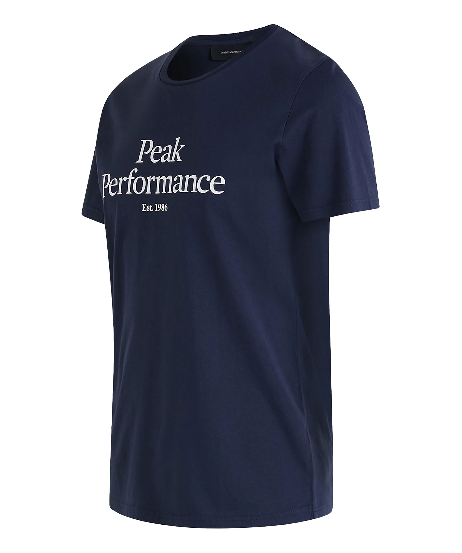 Marinblå t-shirt från Peak Performance. 100% ekologisk med tyg av högkvalitativ bomullsjersey som gör att den känns otroligt mjuk och skön. Rundad halsringning med tunn ribbning och en stor, vit logotyp tryckt över bröstet.