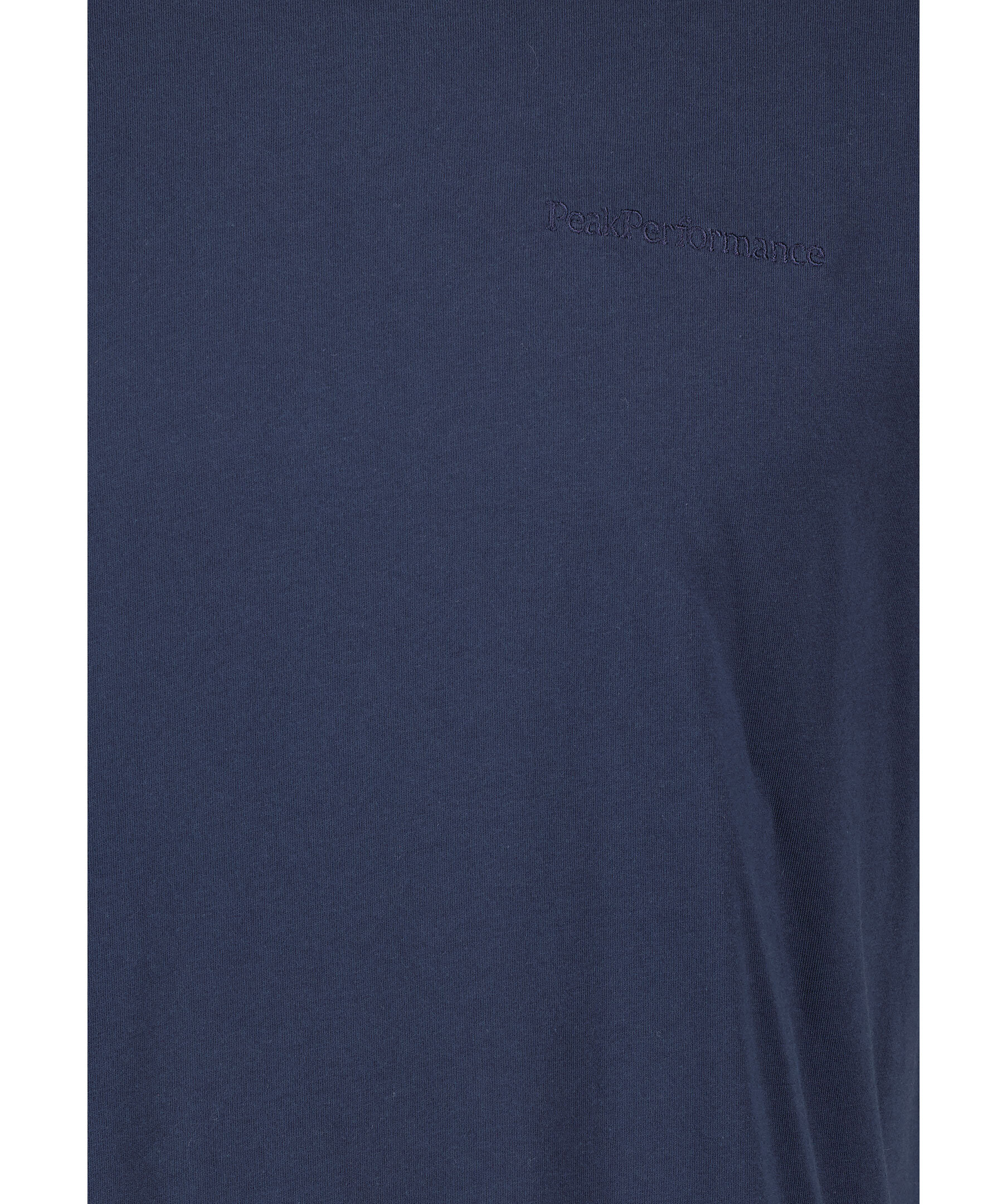 Marinblå t-shirt med rundad halsringning från Peak Performance. Diskret, broderad logotyp i marinblått på vänster sida av bröstet samt tunn ribbad halsringning. Tillverkad i 100% bomull.