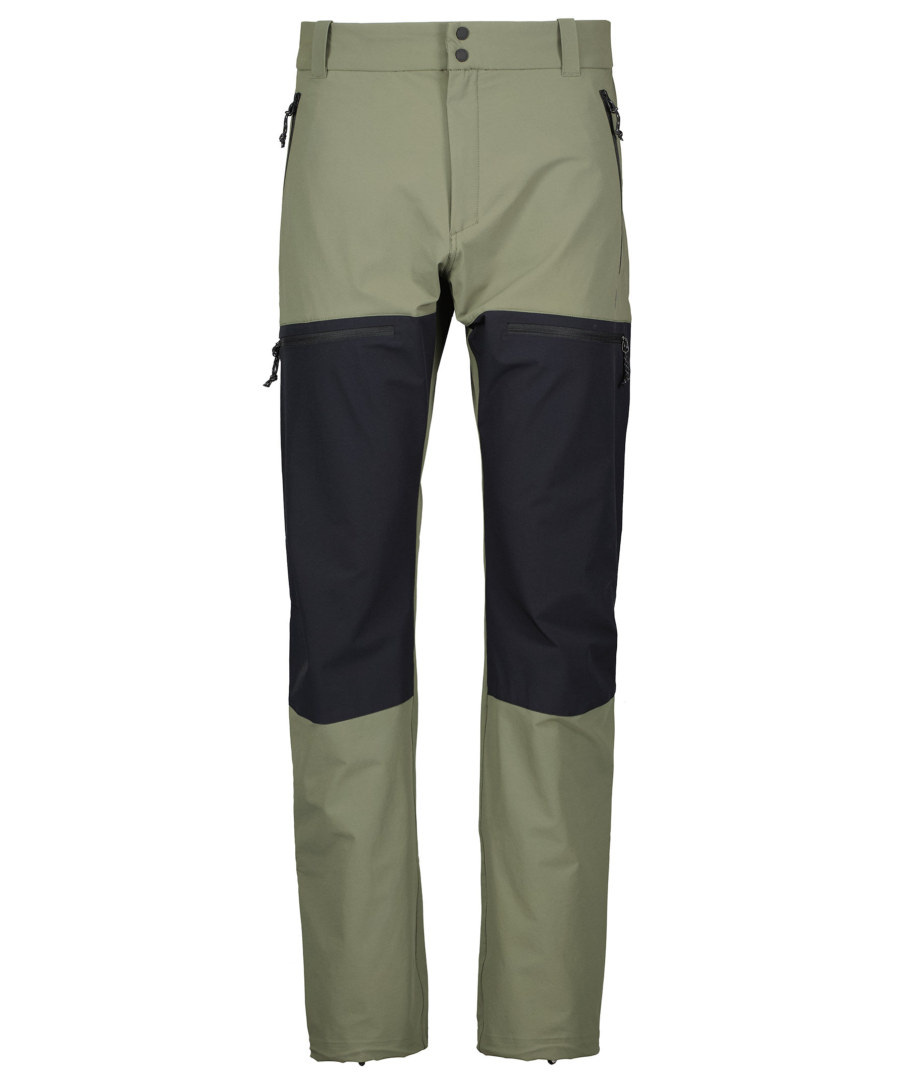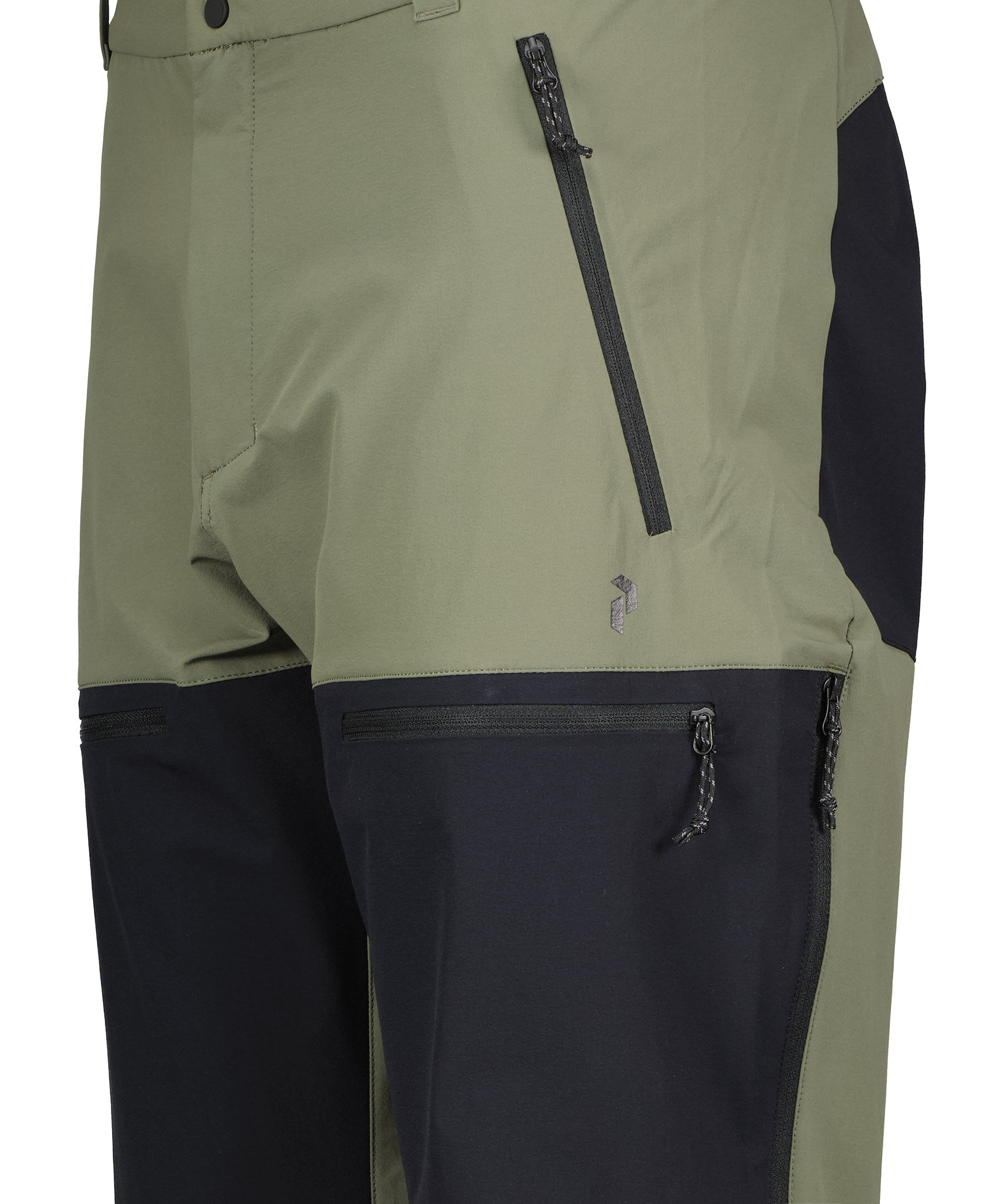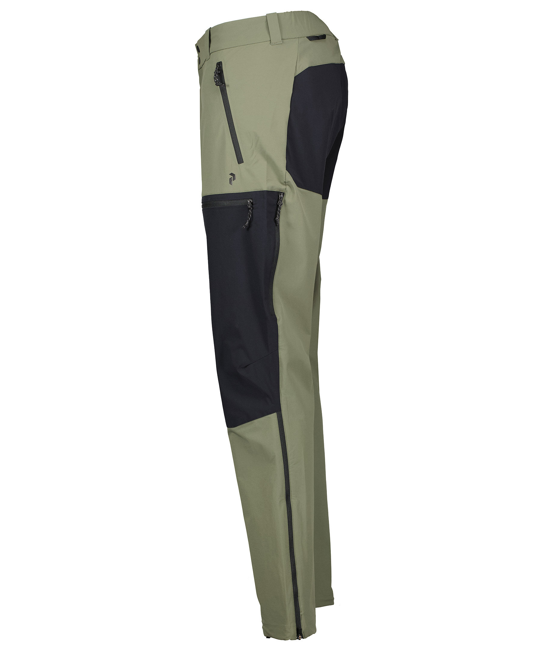 Gröna och svarta softshell byxor från Peak Performance. Vatten och vindavvisande. Justerbart benslut med blixtlås och kil. Hake för kängor. Resår i midjan med hällor för bälte. Fyra fickor framtill som stängs med dragkedja. två fickor baktill som stängs med dragkedja. Tryckt logotyp på byxans framsida och baksida.