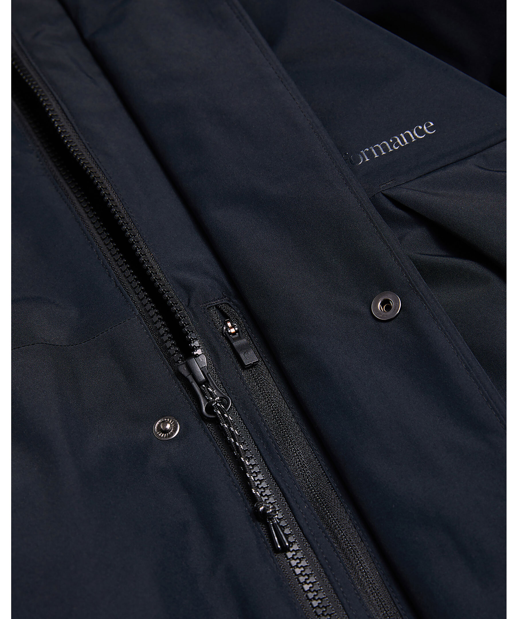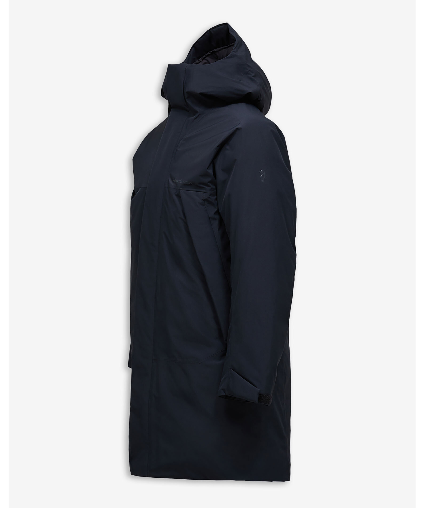 Svart lätt och varm fodrad skalparka från Peak Performance. Jackan stängs med dold tvåvägsdragkedja och tryckknappar och har två sidfickor med lock och dragkedja, dold bröstficka med dragkedja samt inre förvaringsfickor i mesh och huva med dragsko. Det tekniska 2-lagers tyget ger vind- och vattentätt skydd samtidigt som det andas även i de tuffaste förhållandena. Tillverkad i polyester med dunfyllning.