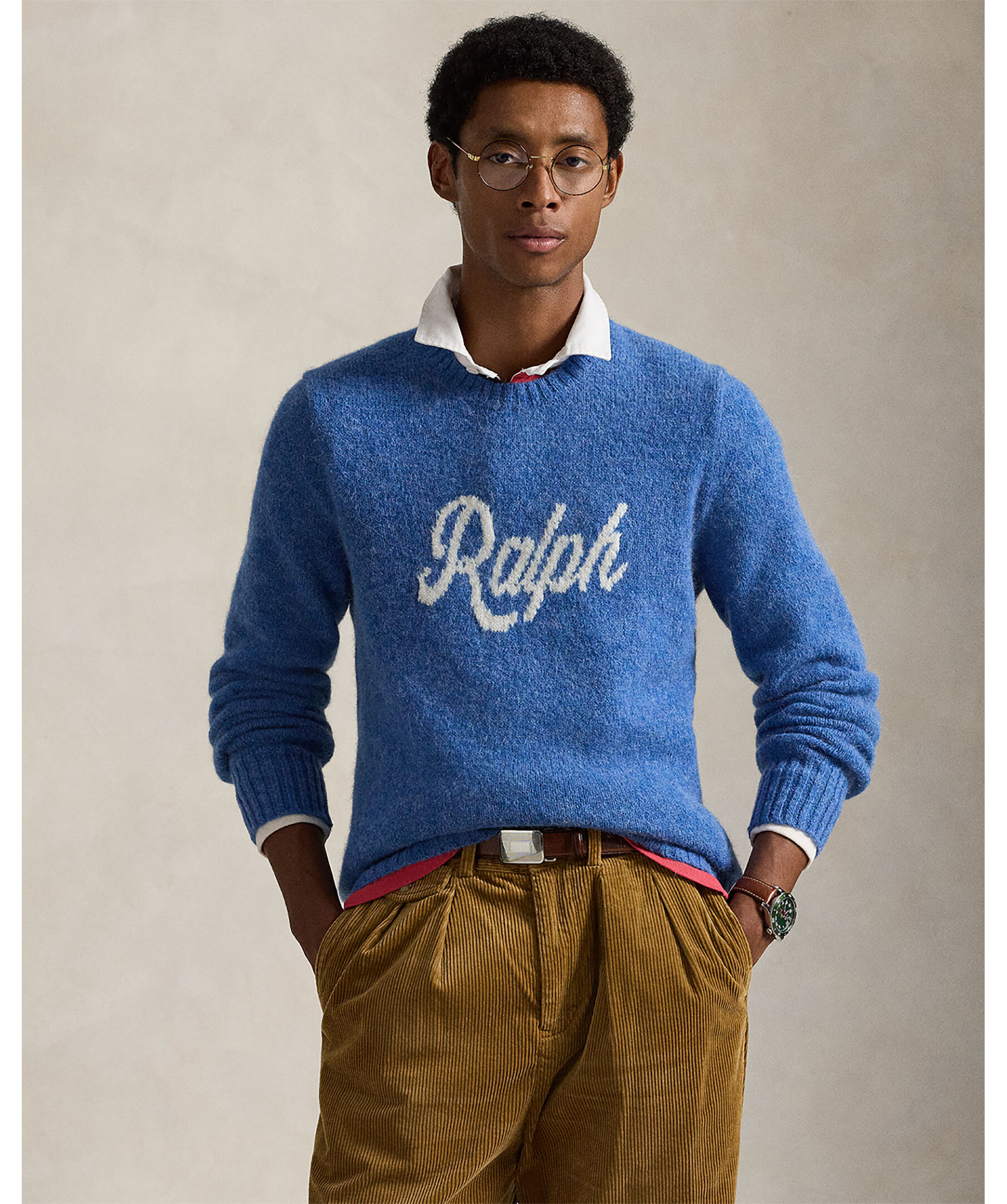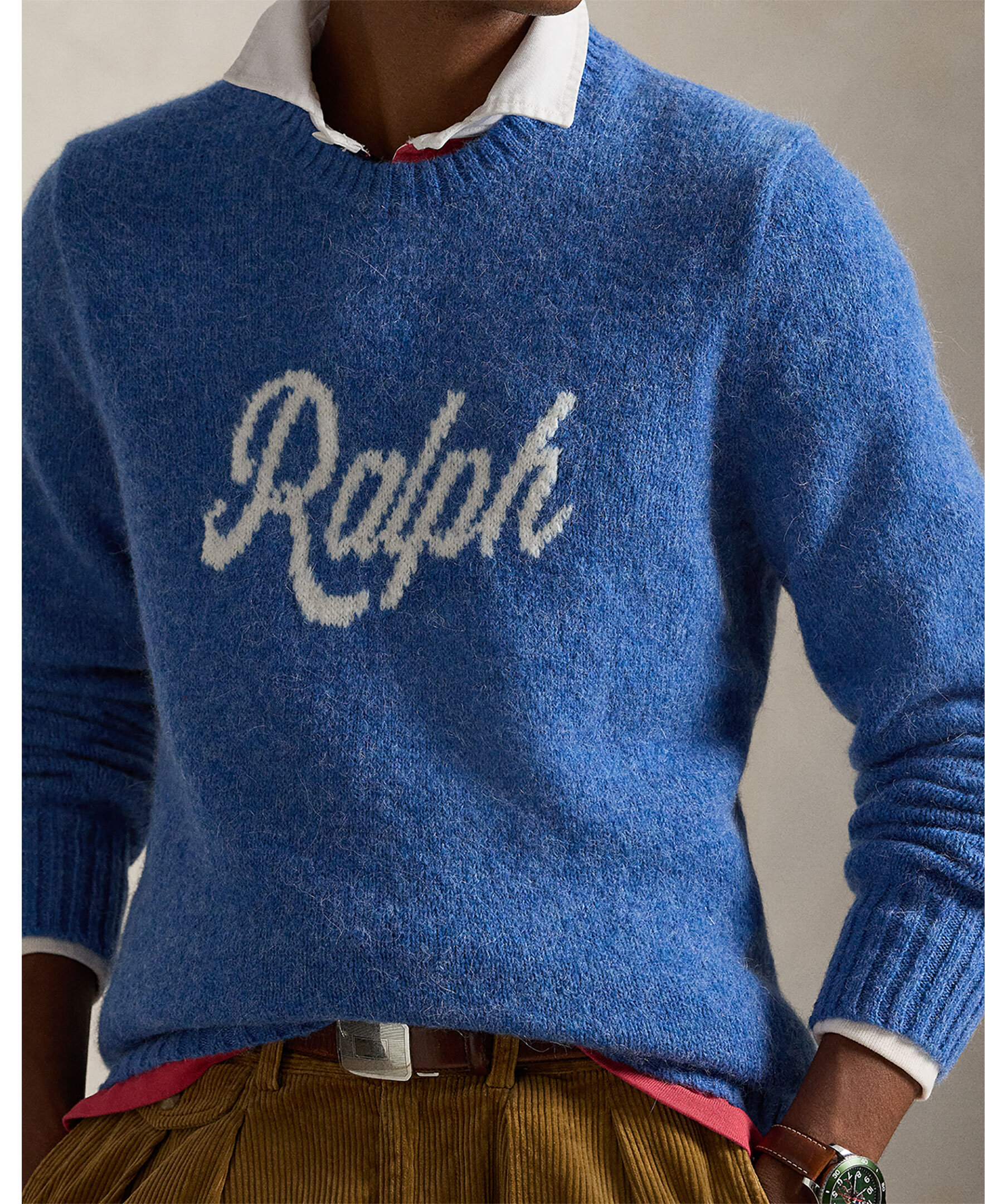 Blå stickad tröja från Polo Ralph Lauren. Gjord i en lyxig blandning av ull och alpacka, med "Ralph" intarsiastickat i skrivstil över bröstet. Tröjan har rund halsringning, ribbstickade muddar och fåll samt en regular fit som ger en rymligare passform över bröstet utan att tappa den moderna siluetten.