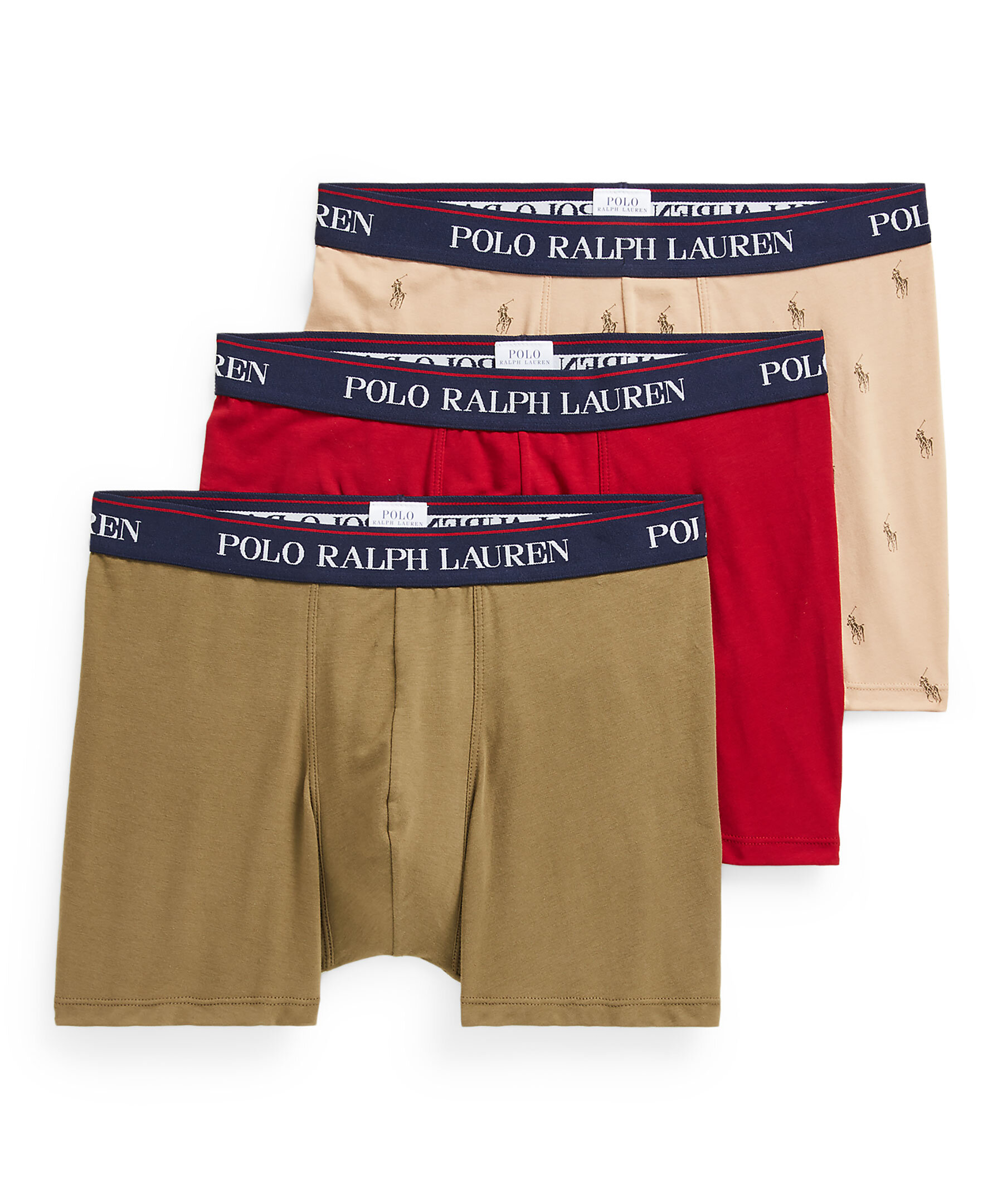 3-pack kalsonger i färgerna röd, militärgrön och beige från Polo Ralph Lauren. Tillverkade i stretchig bomull, marinblå resår med logotyp. De beigea kalsongerna har mönster med logotyper.