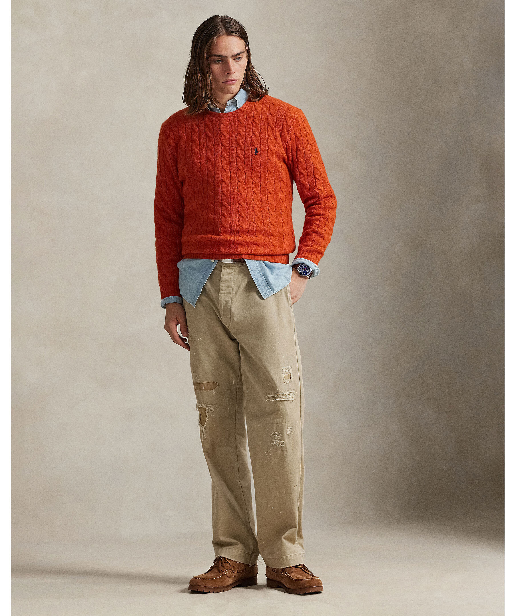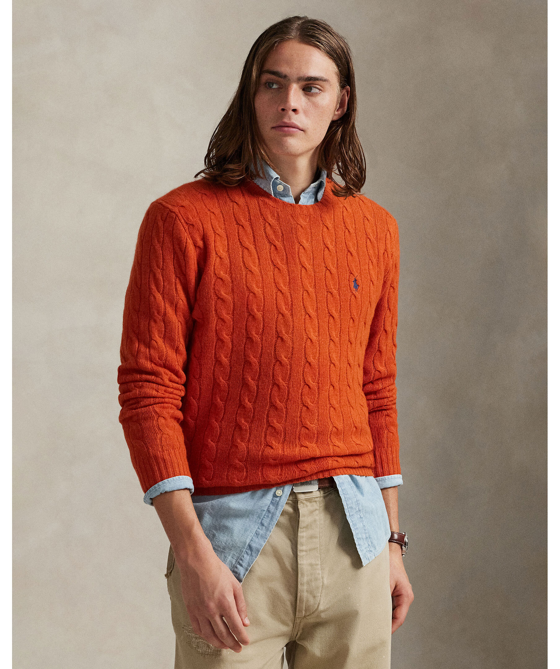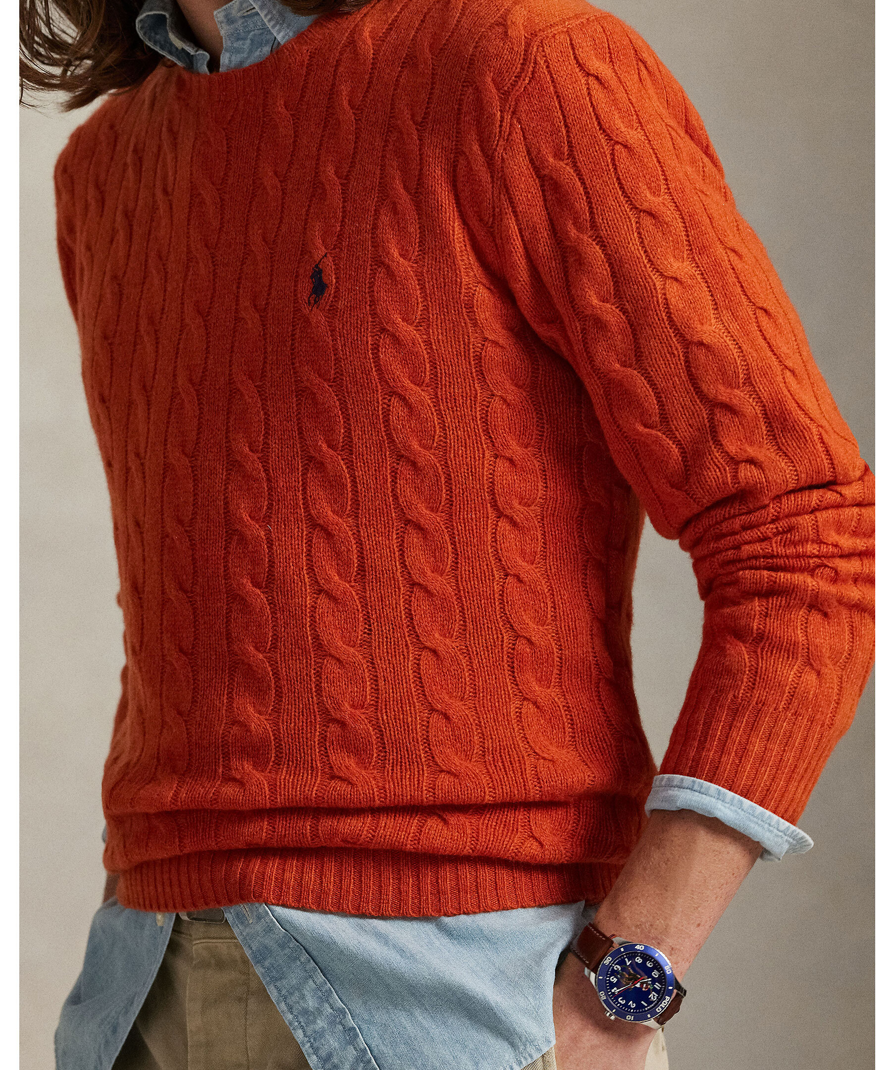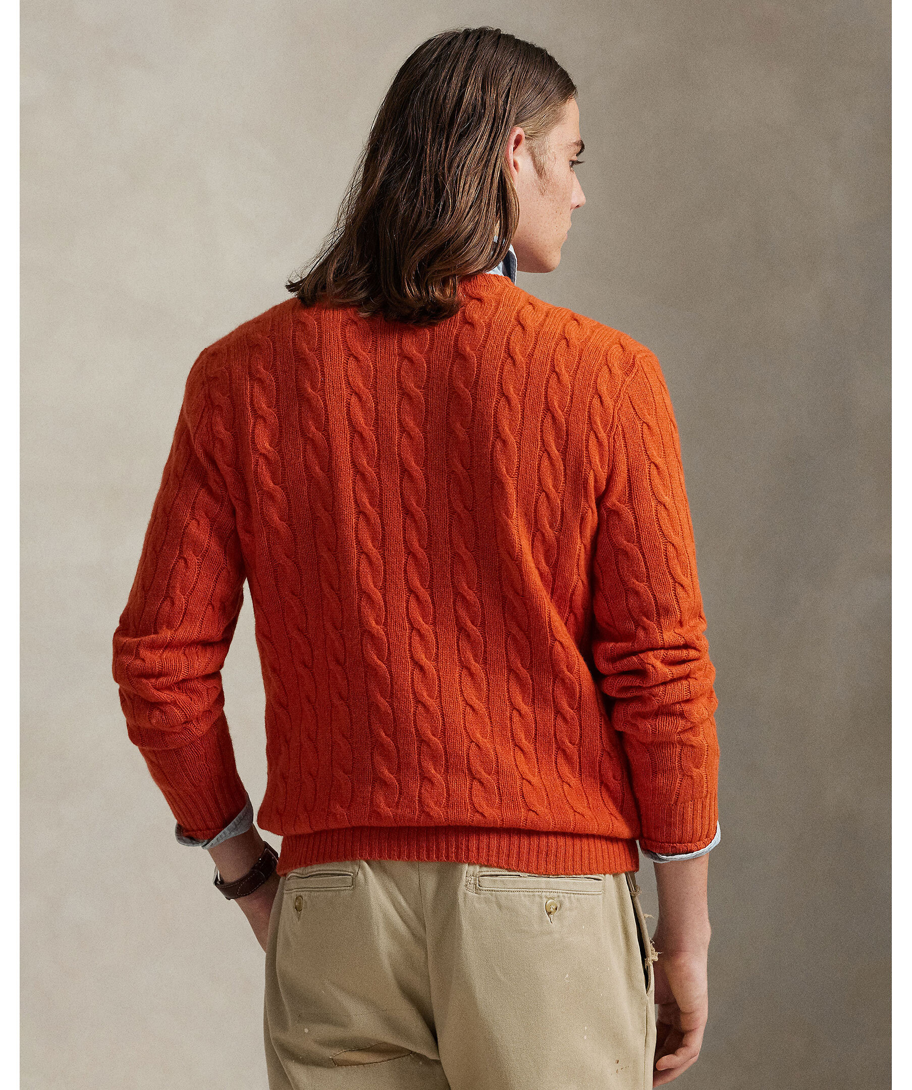 Orange kabelstickad tröja från Polo Ralph Lauren. Denna tolkning av deras ikoniska kabelstickade tröja är gjord av italienskt garn som är spunnet med ull och kashmir. Långa ärmar med ribbstickade muddar samt ribbstickad fåll. Signaturbroderad ponny på vänster bröst.