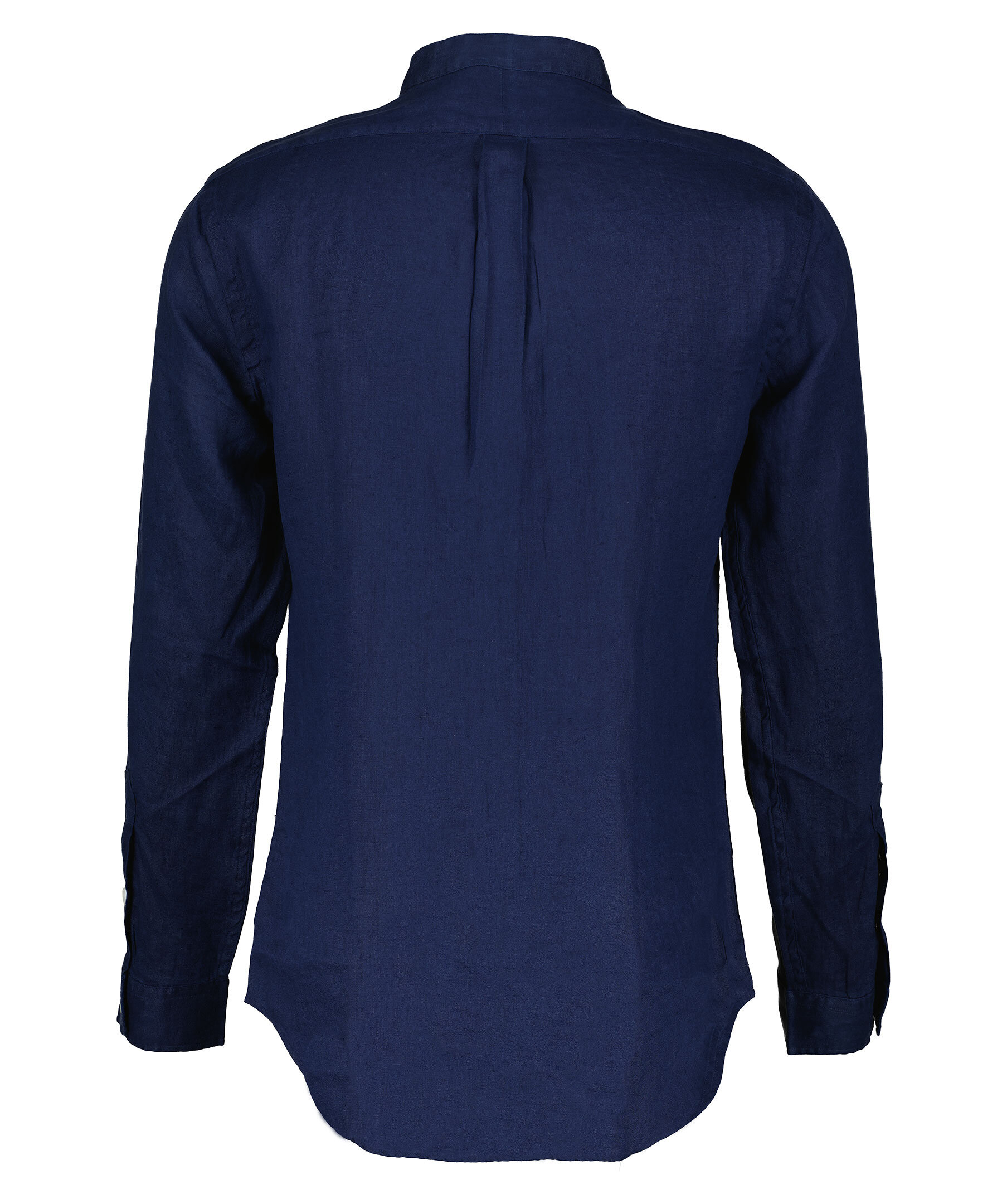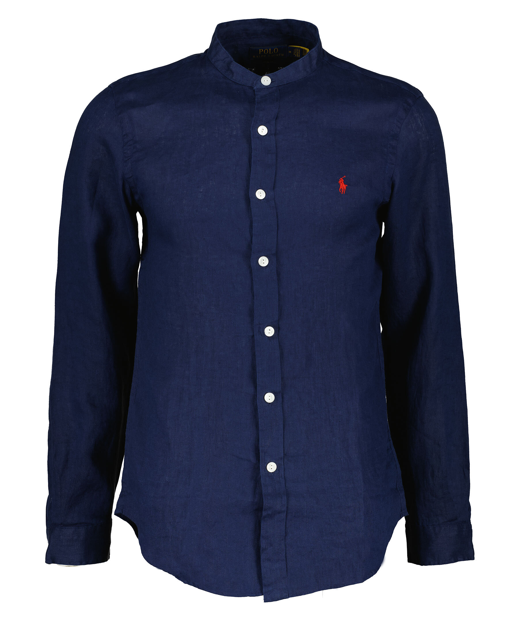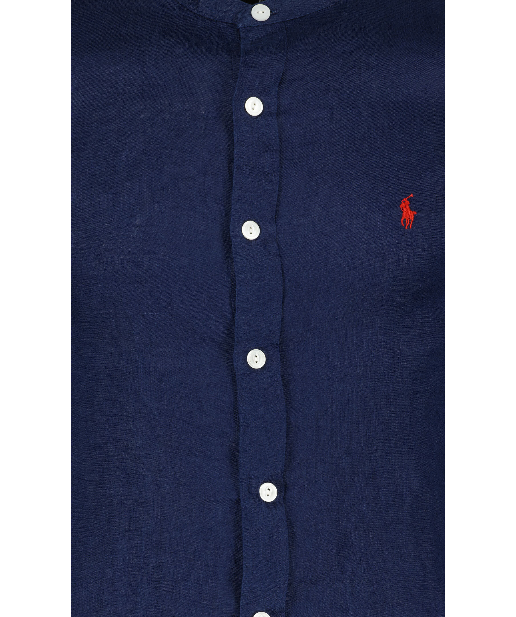 Marinblå linnekskjorta i en slim fit från Polo Ralph Lauren. Skortan är tillverkad i ett luftigt linnetyg. Har en kineskrage, en krage helt utan kragsnibbar och en röd broderad logotyp på bröstet.