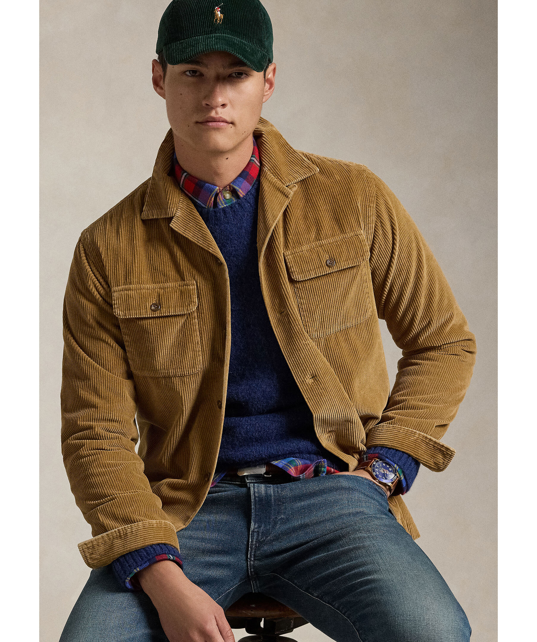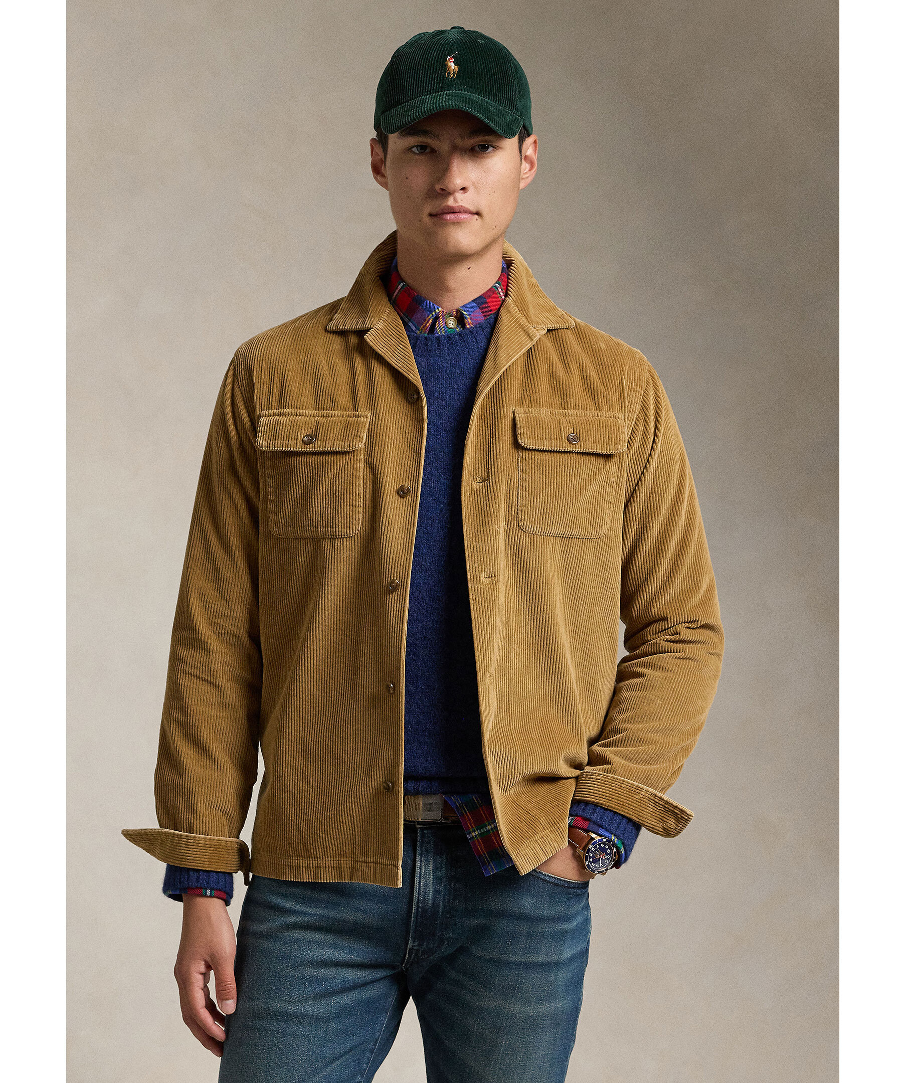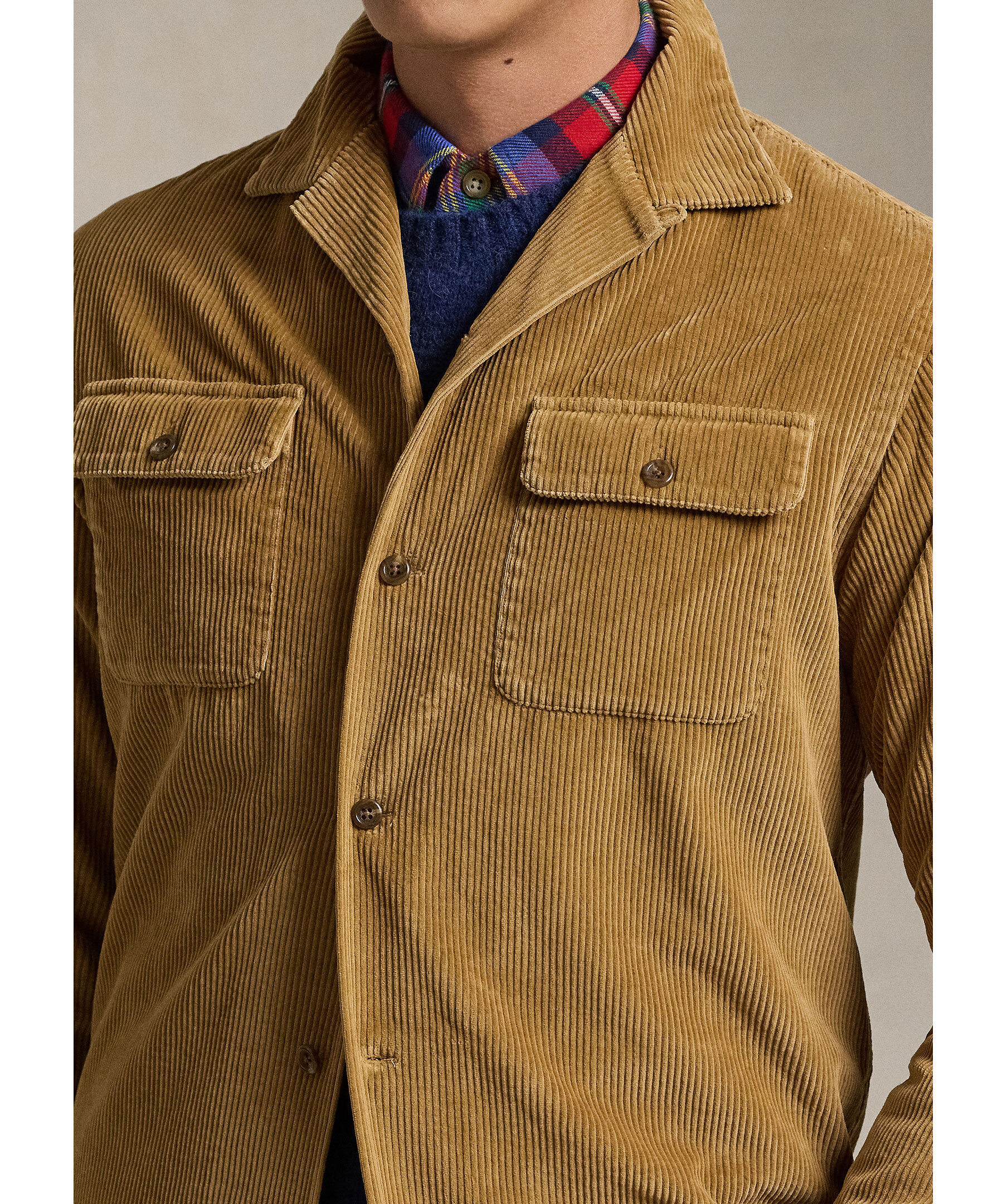 Khakifärgad overshirt i manschestertyg från Polo Ralph Lauren. Overshirten stängs med knappar och har två bröstfickor med lock och knapp. Tillverkad i bomull.