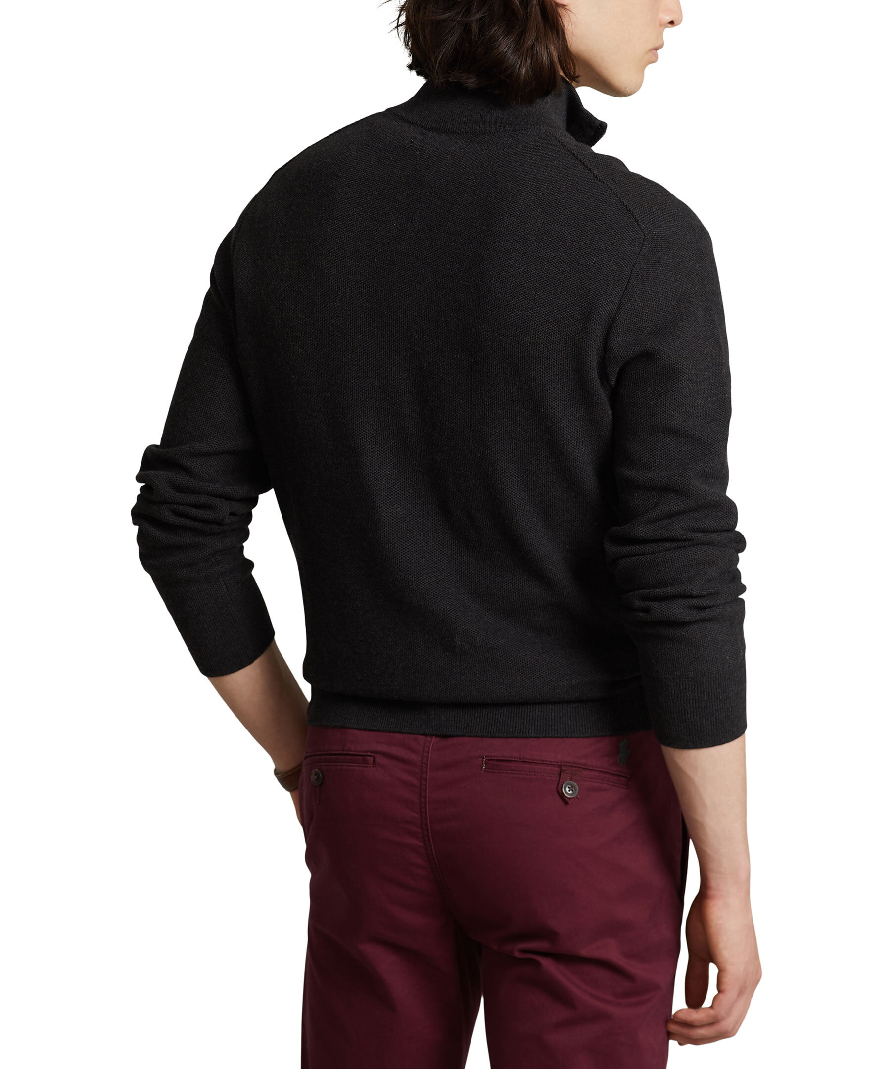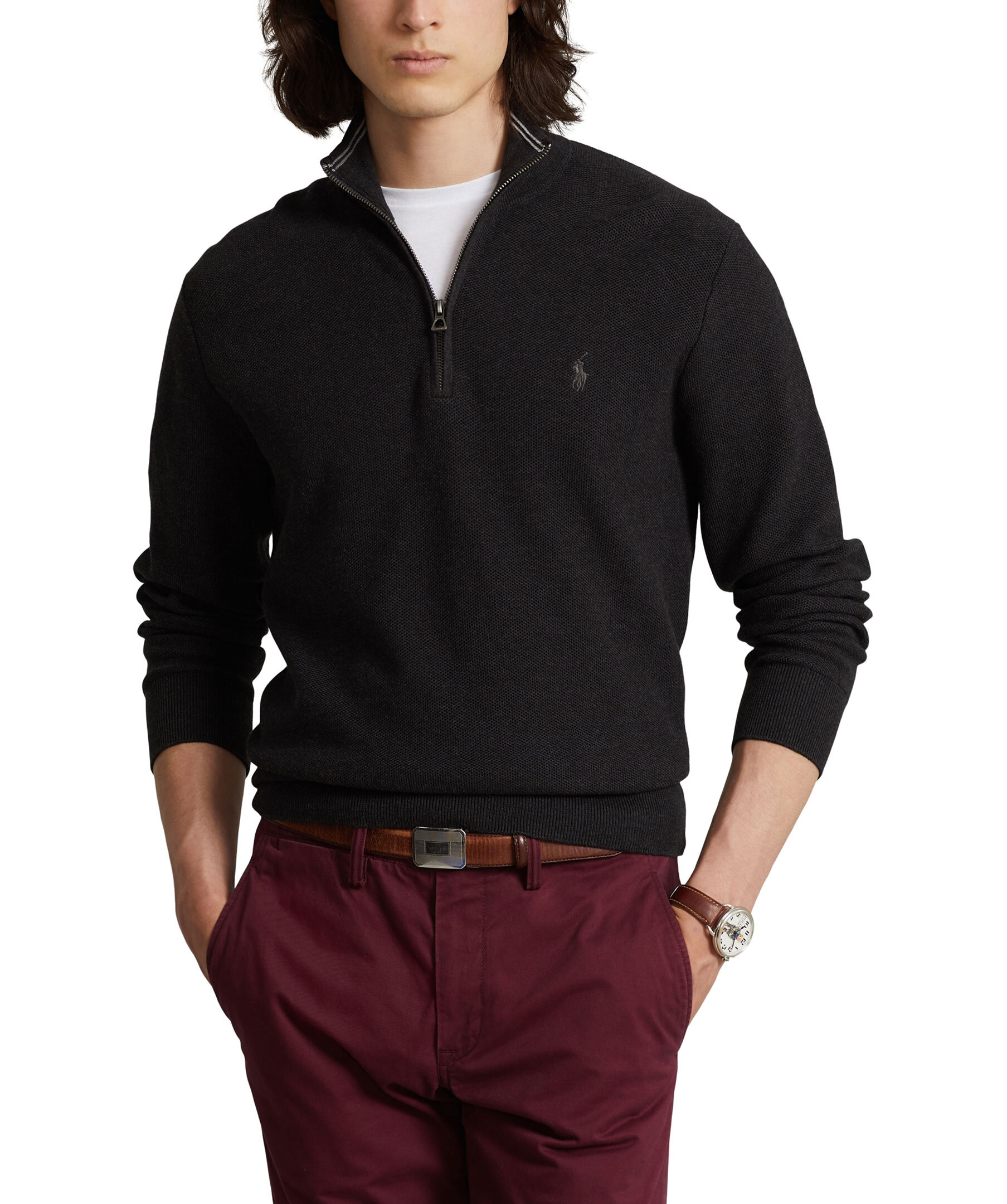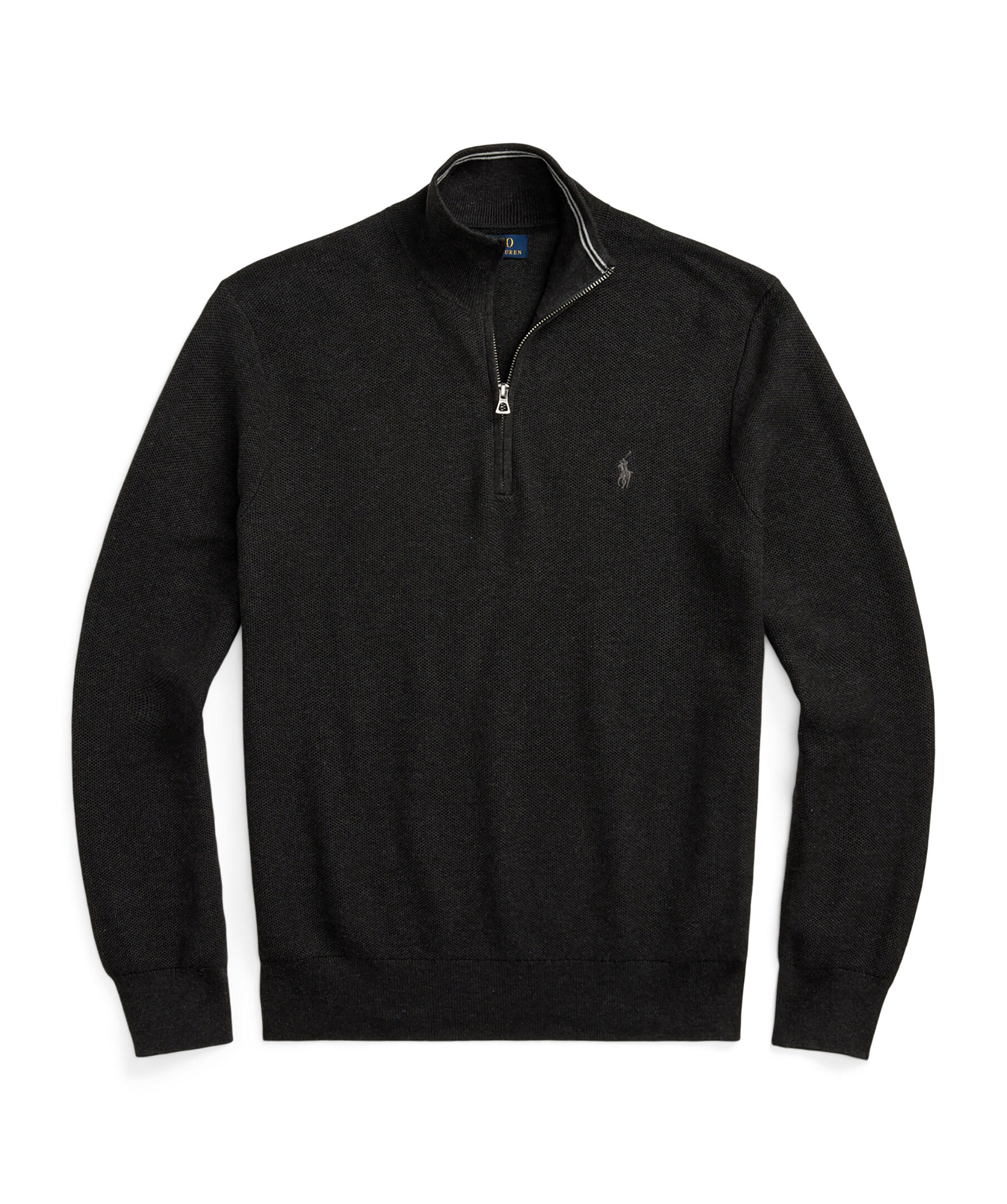 Gråsvart finstickad tröja från Polo Ralph Lauren. Hög krage med halvzip, broderad logga på bröstet, stickade muddar. Tillverkad i 100% bomull.