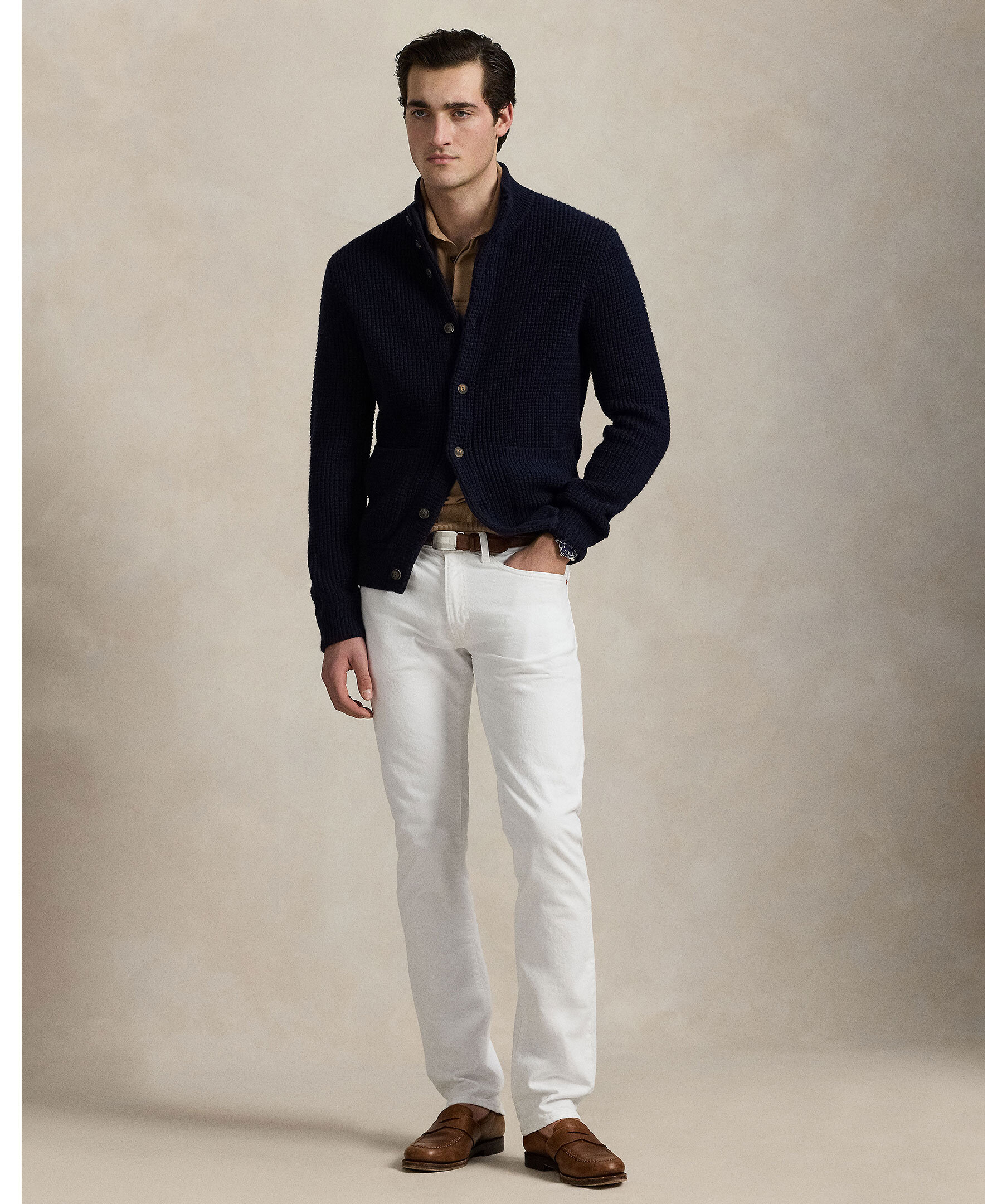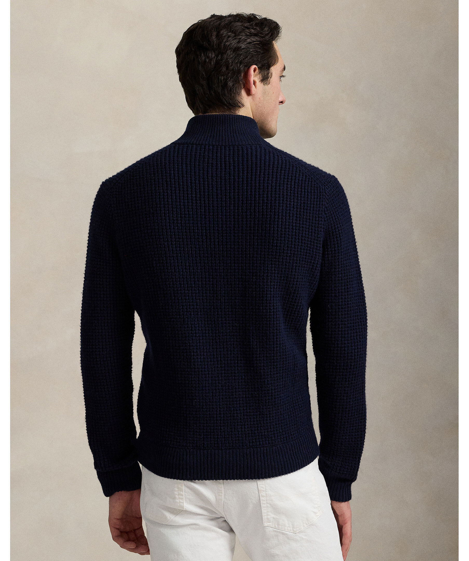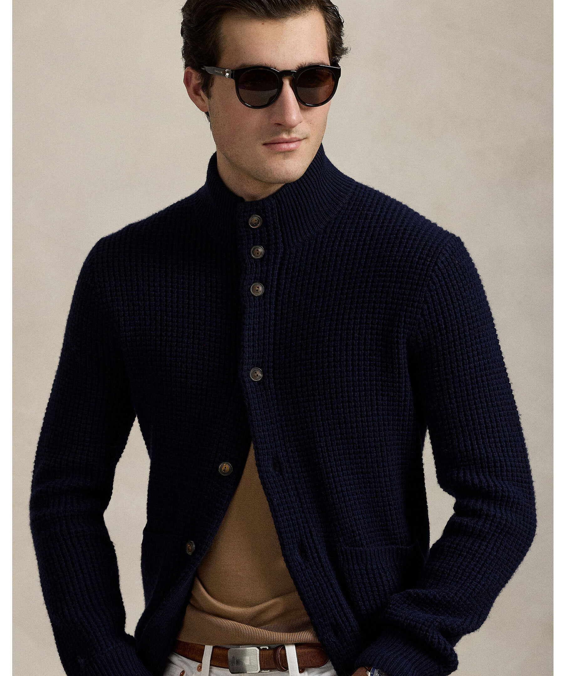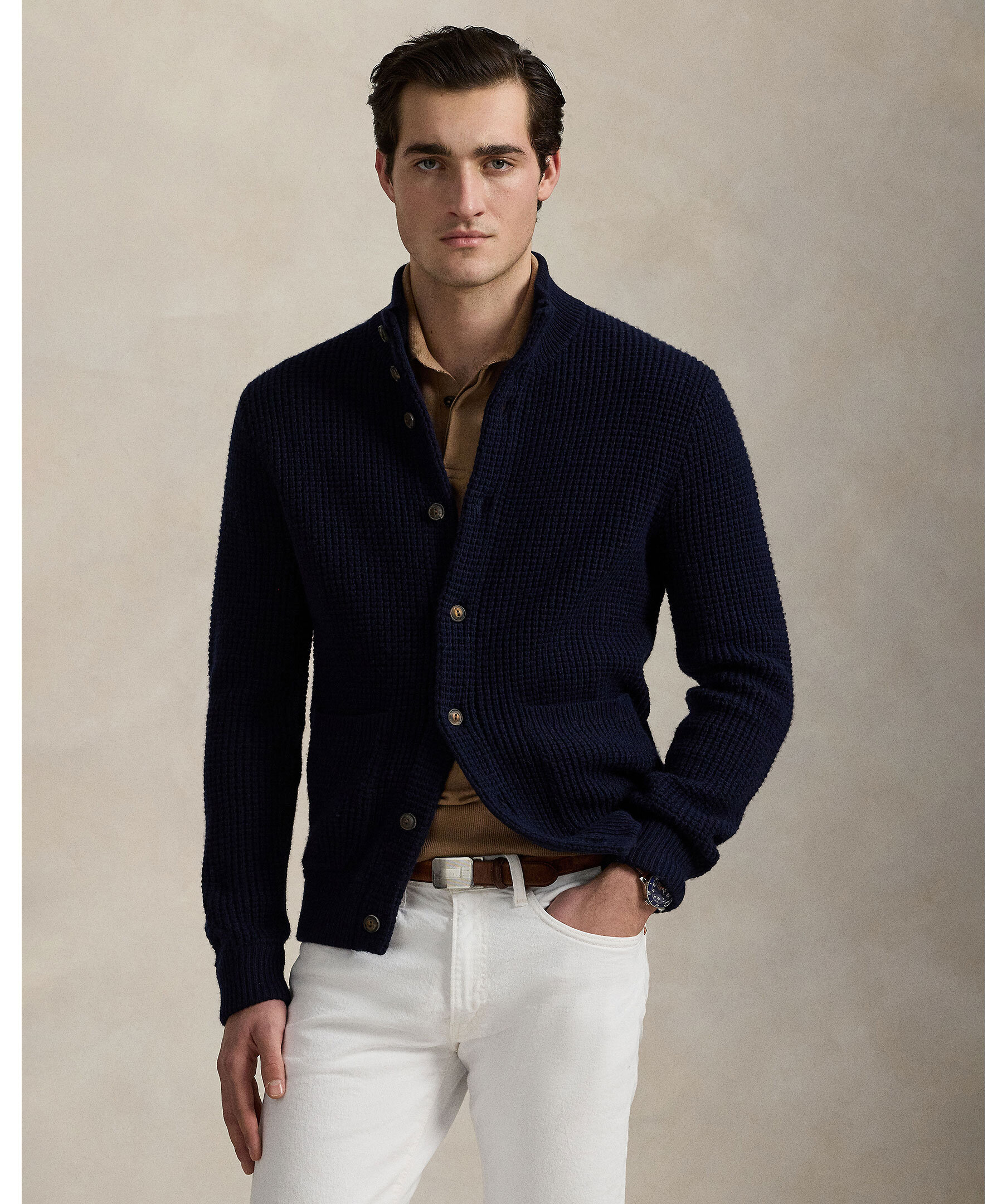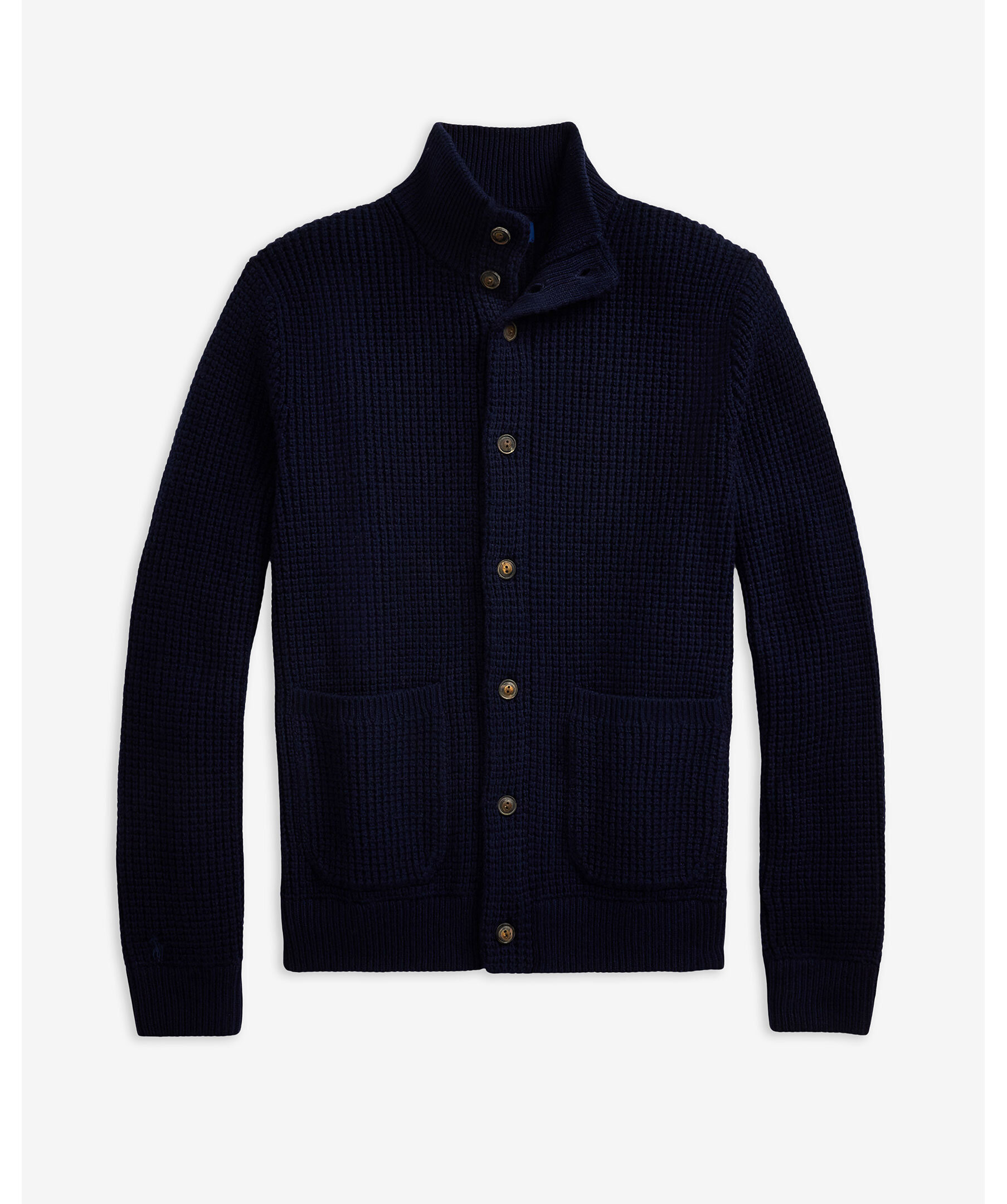 Marinblå stickad cardigan från Polo Ralph Lauren. Tröjan är gjord i en blandning av ull och bomull. Hög krage och stängs med knappar. Två framfickor och broderad polohäst vid ärmslutet.