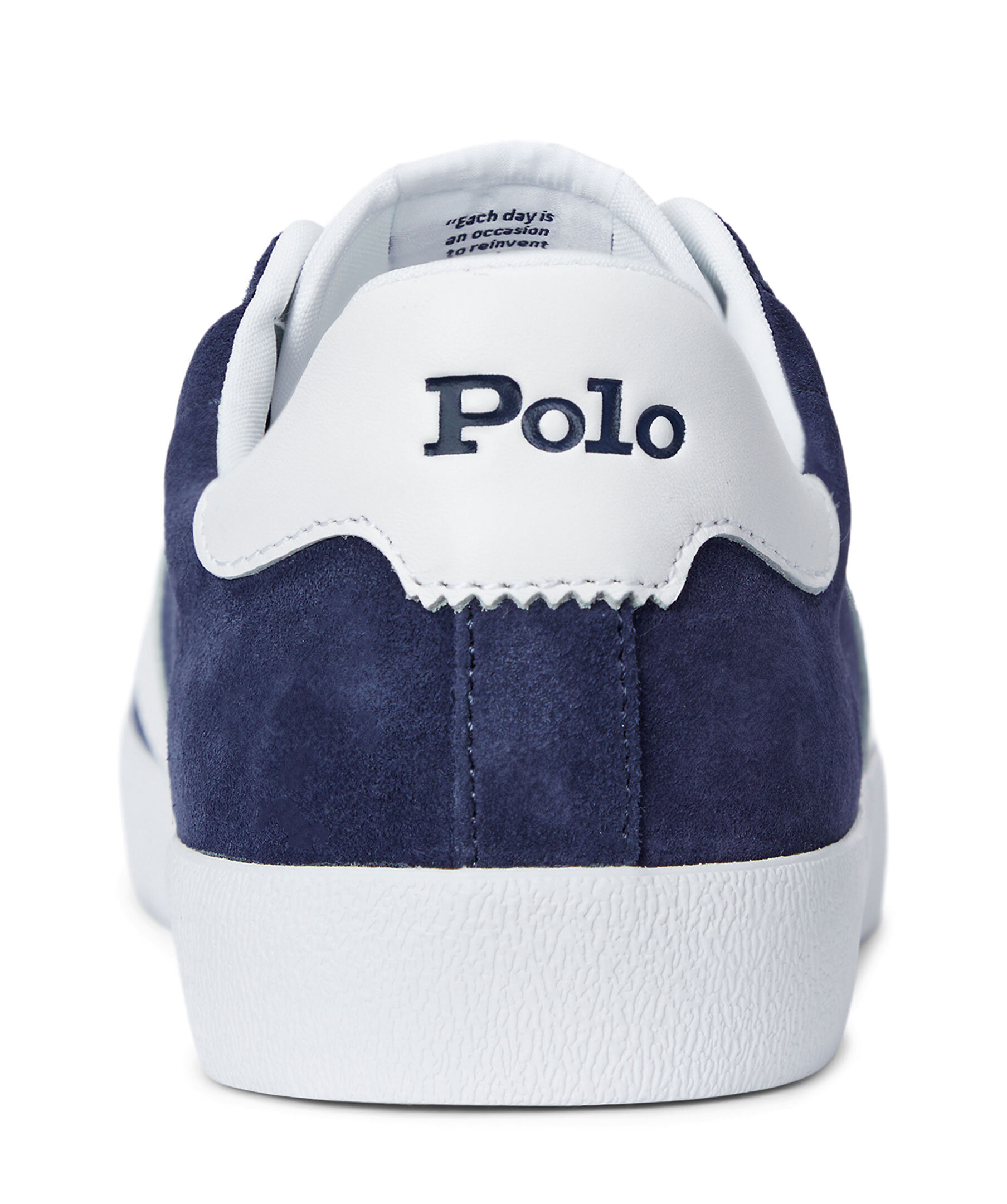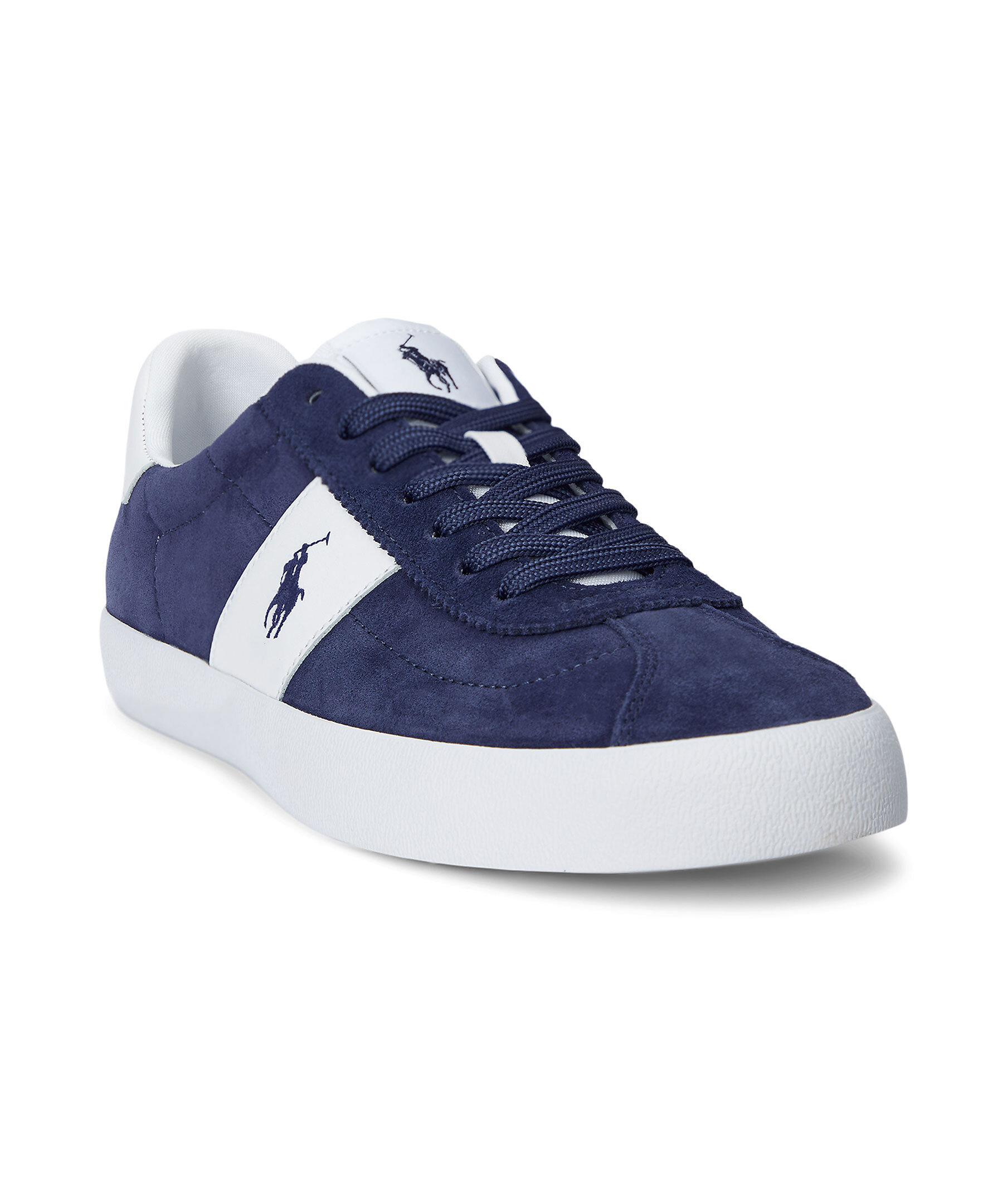 Vita och blåa sneakers från Polo Ralph Lauren. Skorna har en vit sula samt logotyp på hälen, plösen och utsidan. Blåa detaljer i mocka. Tillverkade i läder.