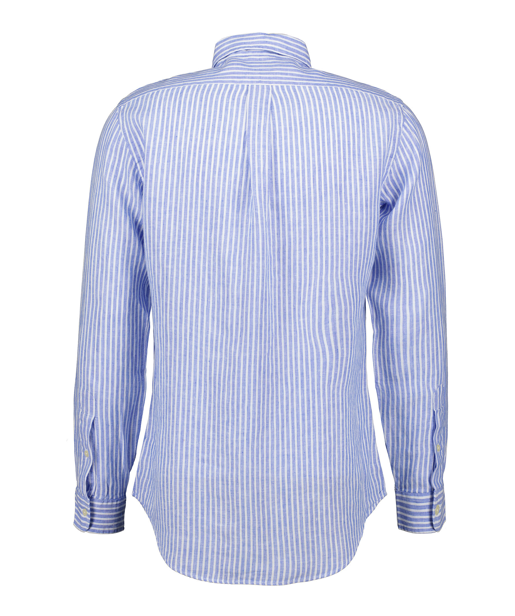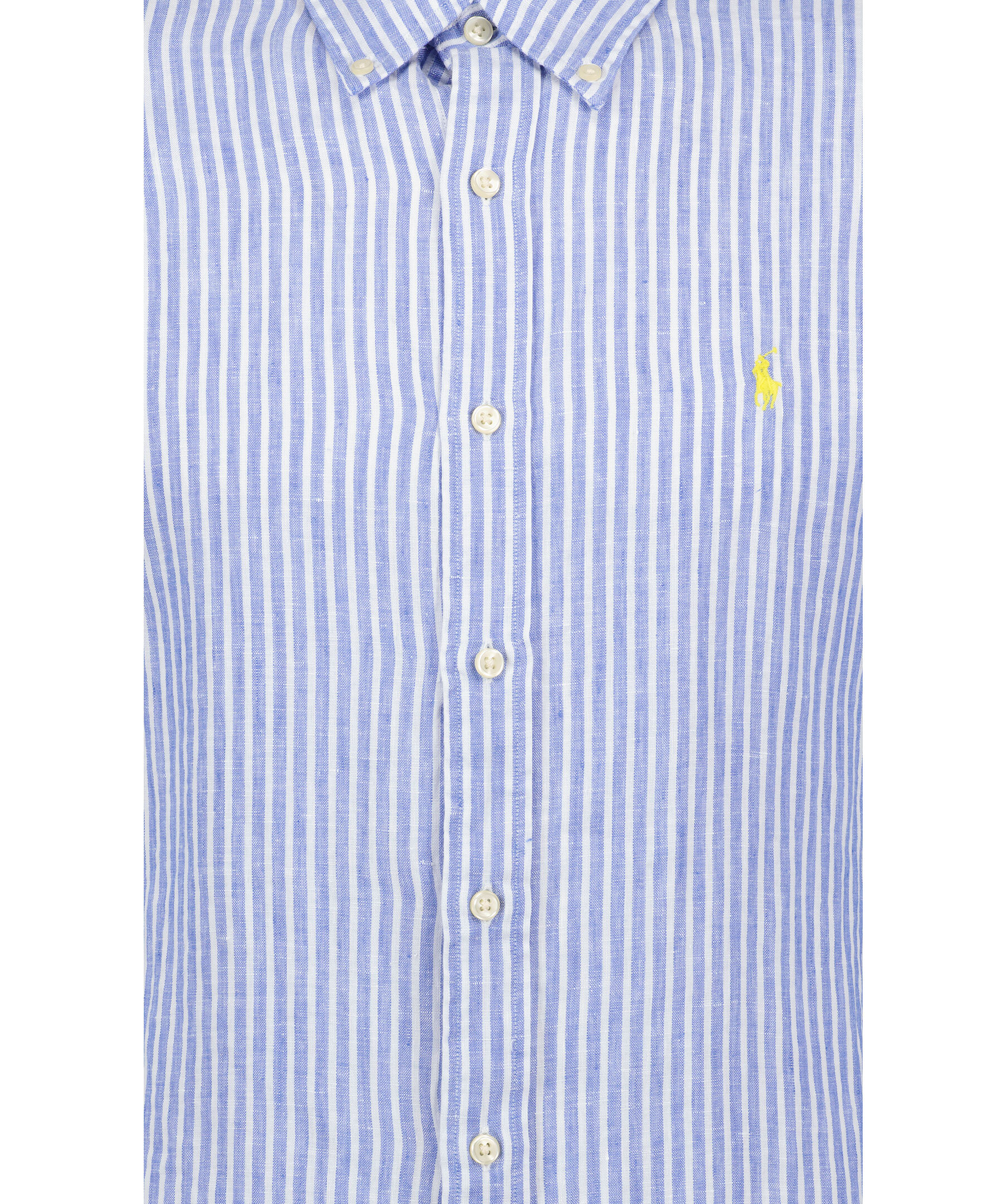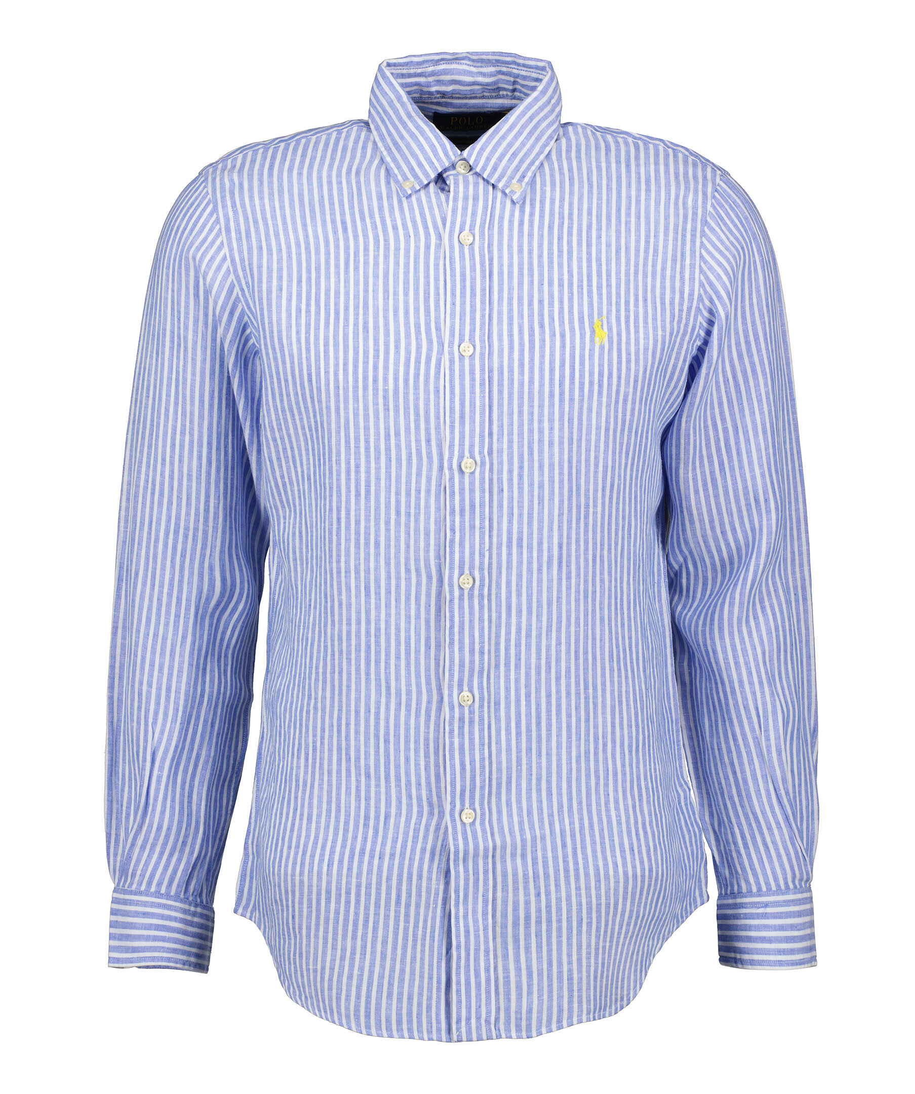 Ljusblå och vit randig skjorta från Polo Ralph Lauren. Broderad logotyp i gult på vänster bröst. Button down krage. Enkla manschetter. Tillverkad i 100% Linne.