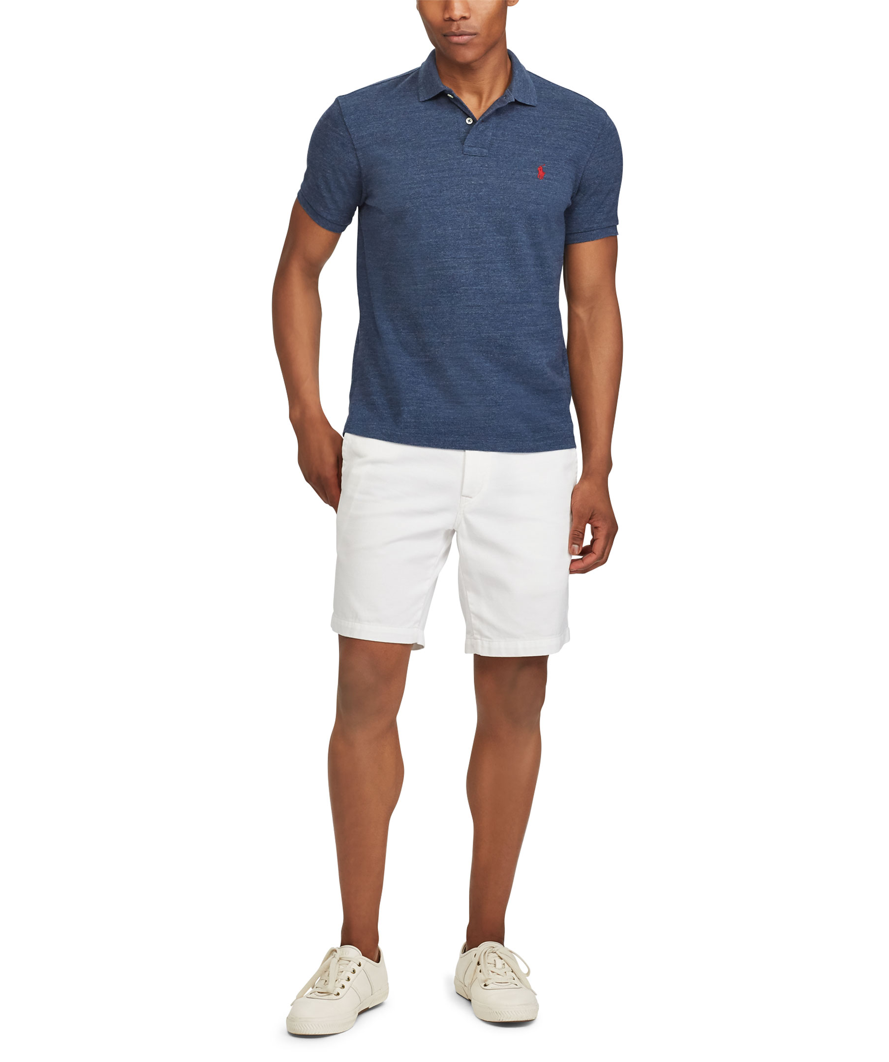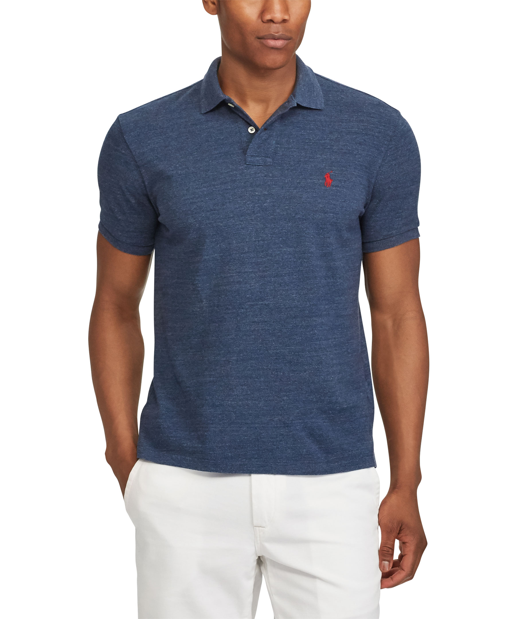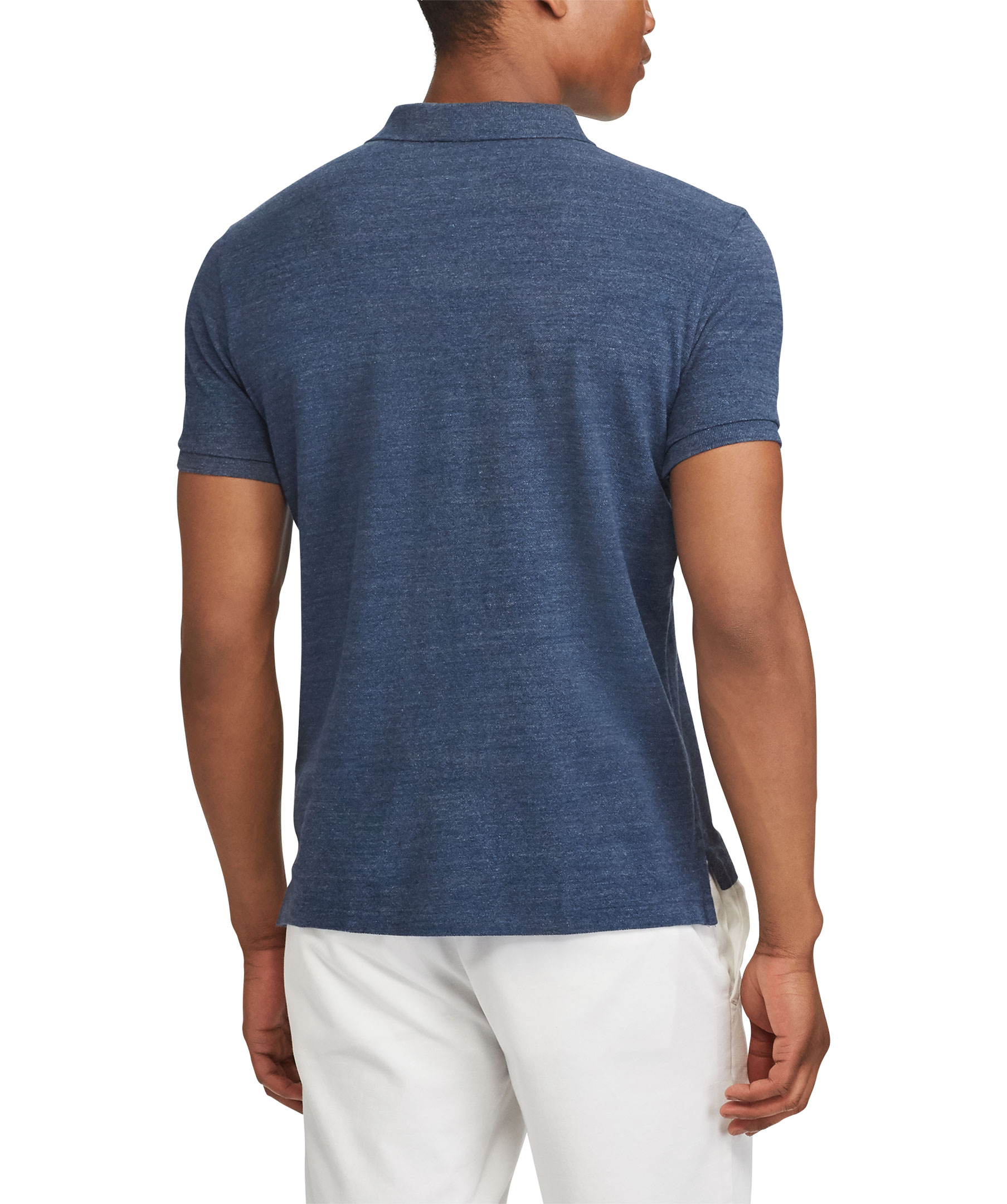 Blåmelerad pikétröja från Polo Ralph Lauren. Röd, broderad logotyp på bröstet. Klassisk krage och knappslå med två ljusa knappar. Custom slim fit modell. Gjord i 100% bomull.