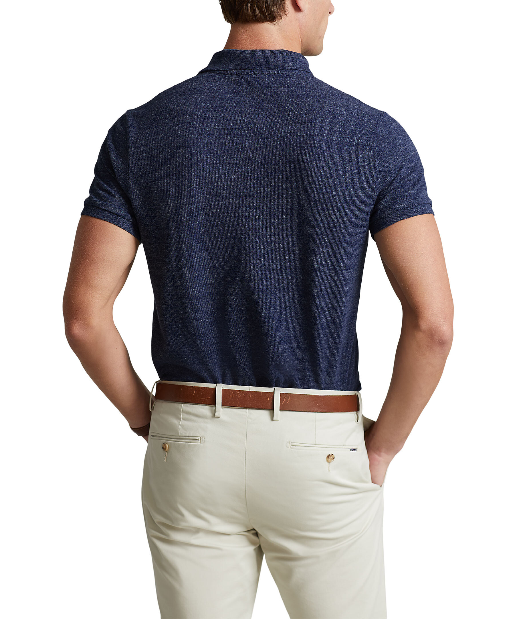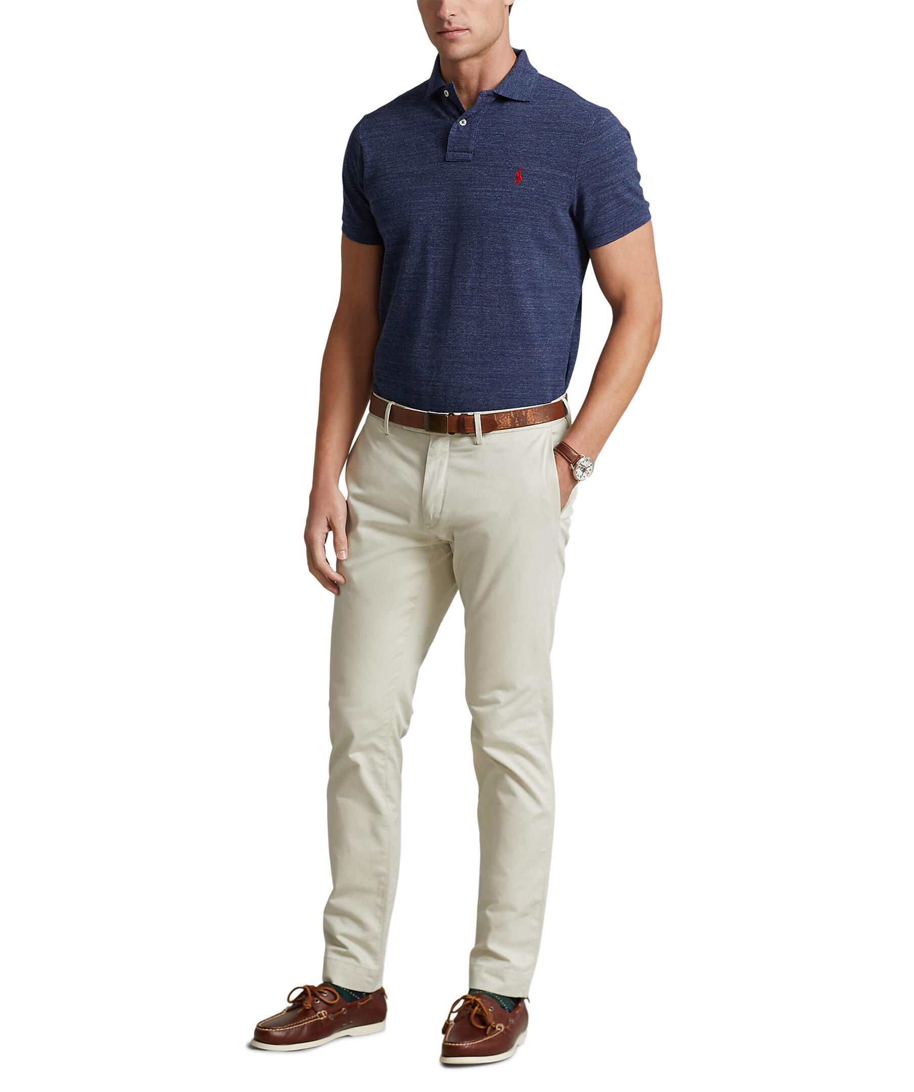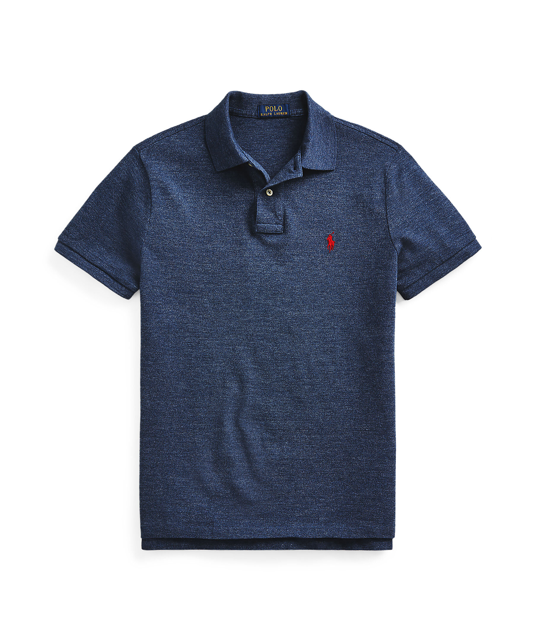 Blåmelerad pikétröja från Polo Ralph Lauren. Röd, broderad logotyp på bröstet. Klassisk krage och knappslå med två ljusa knappar. Custom slim fit modell. Gjord i 100% bomull.