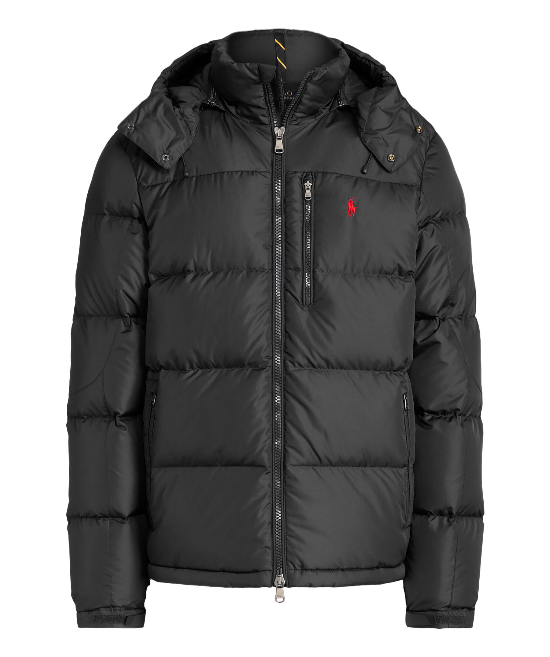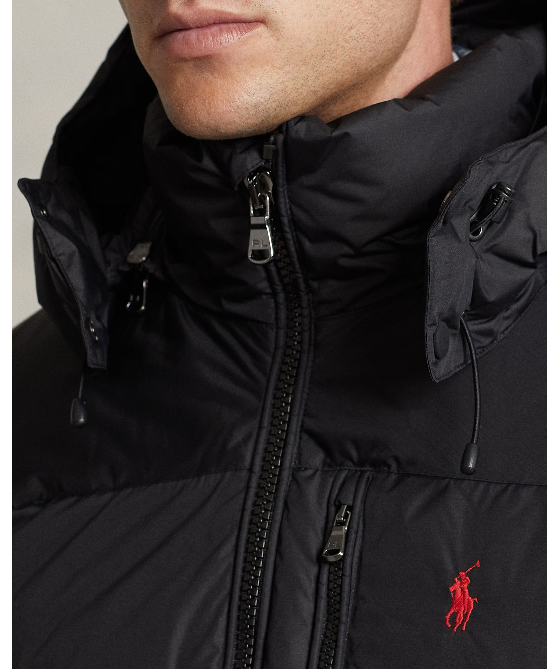 Svart fodrad jacka som har vattenavvisande tyg i återvunnen polyester från Polo Ralph Lauren. Luva med dragsko som är avtagbar med dragkedja. Tvåvägsdragkedja framtill med flik upptill som förhindrar skav på hakan. Justerbara kardborreband vid de elastiska ärmsluten, bröstficka med dragkedja, två framfickor med dragkedja i midjan och en innerficka. Dragsko i fåll, helfodrad och signaturbroderad ponny på vänster bröst. Modellen är 185 cm och bär storlek medium.