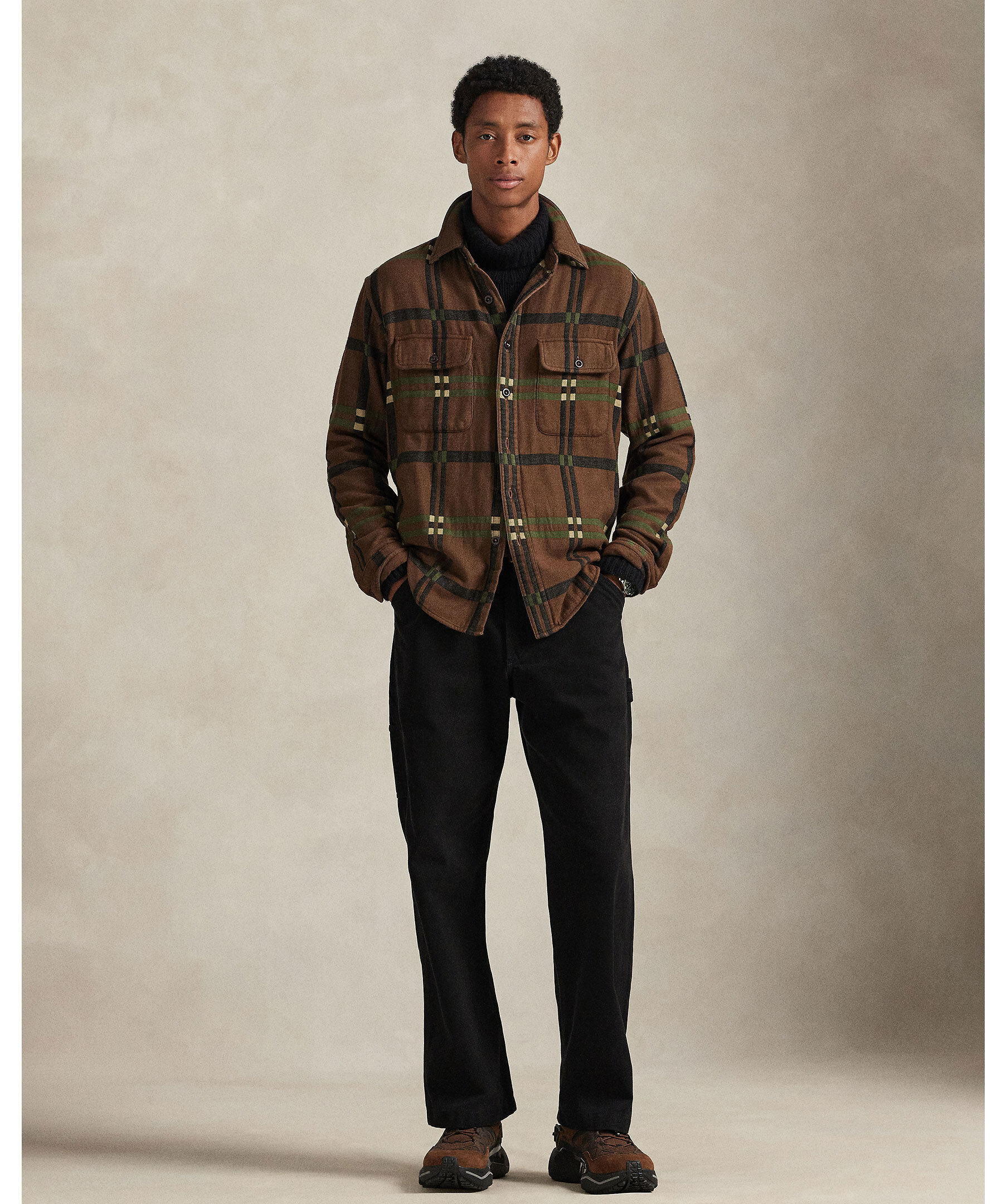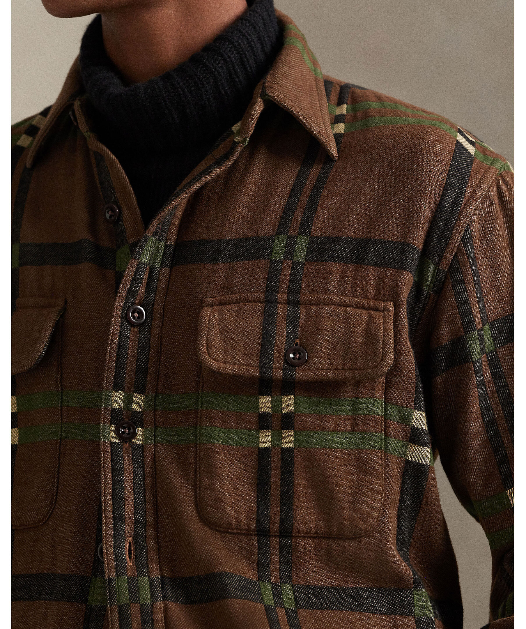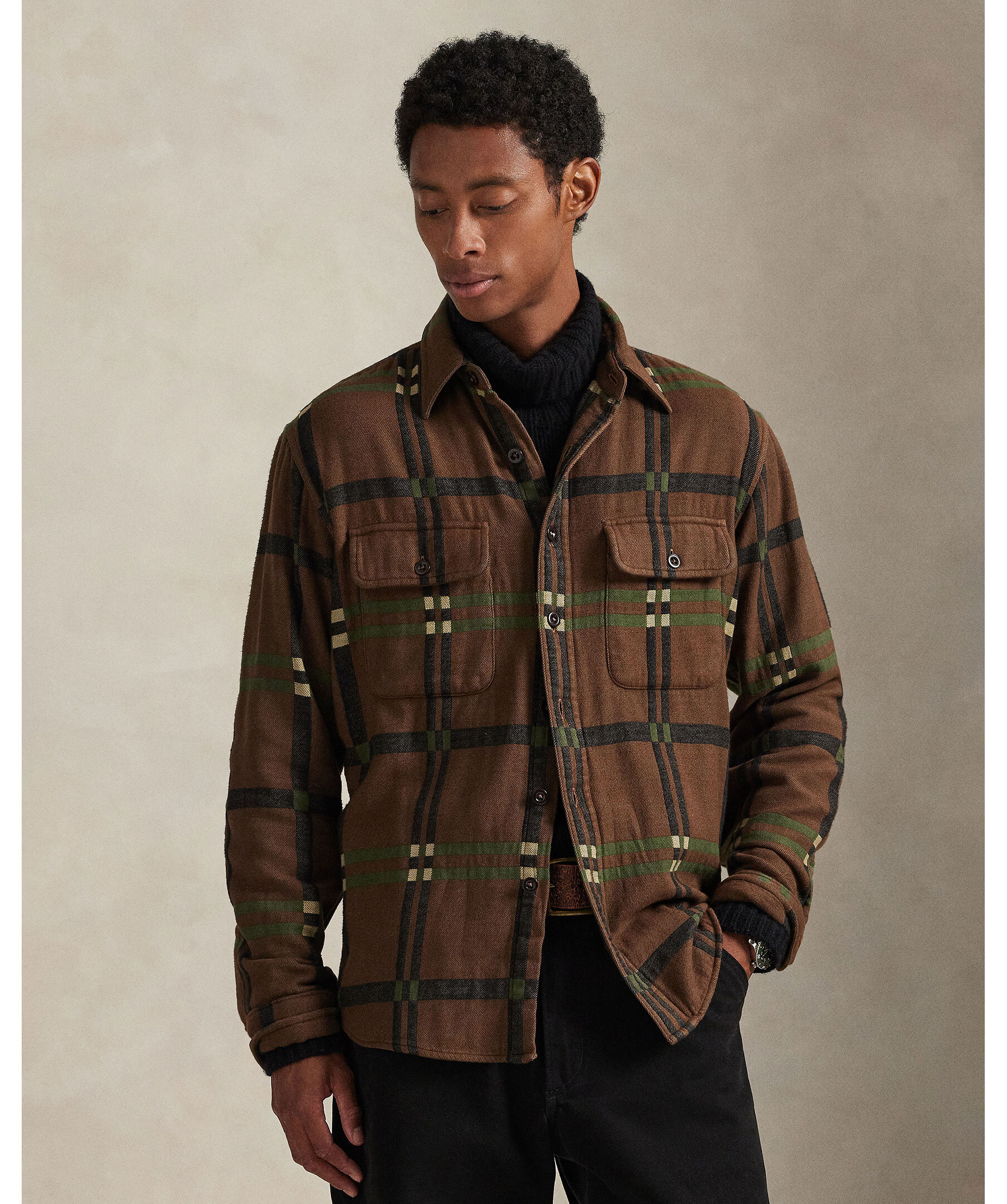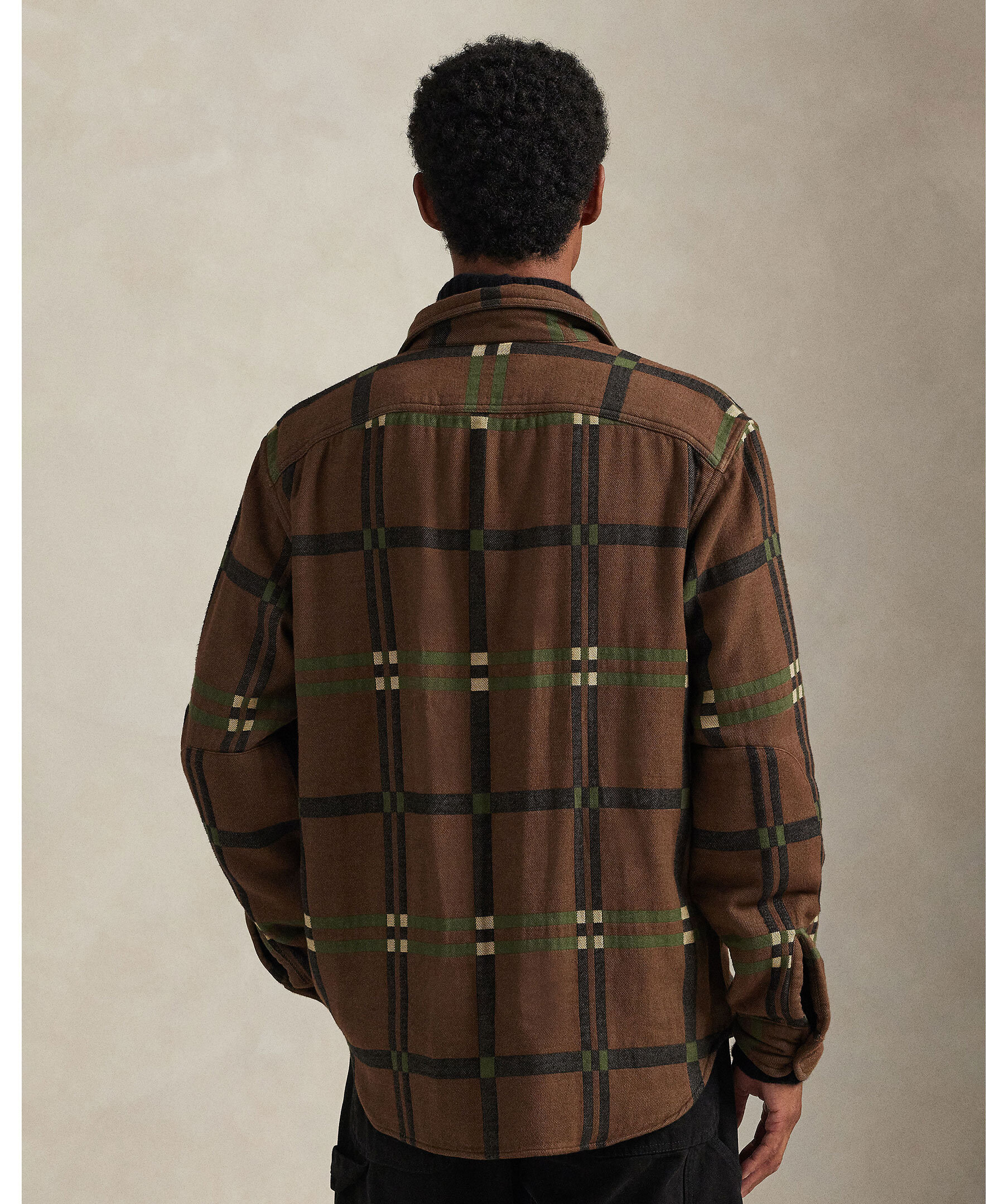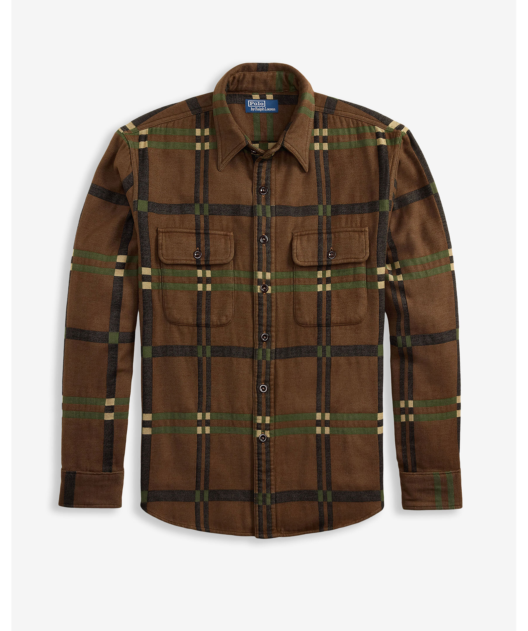 Brun, klassisk flanellskjorta i bomull från Polo Ralph Lauren. Tröjan har en workwear-inspirerad design, förstärkta armbågar och rymlig passform. Perfekt som overshirt eller lagerplagg för en robust och avslappnad stil. Skjortan har ett rutigt mönster som går i beige, grönt och svart.