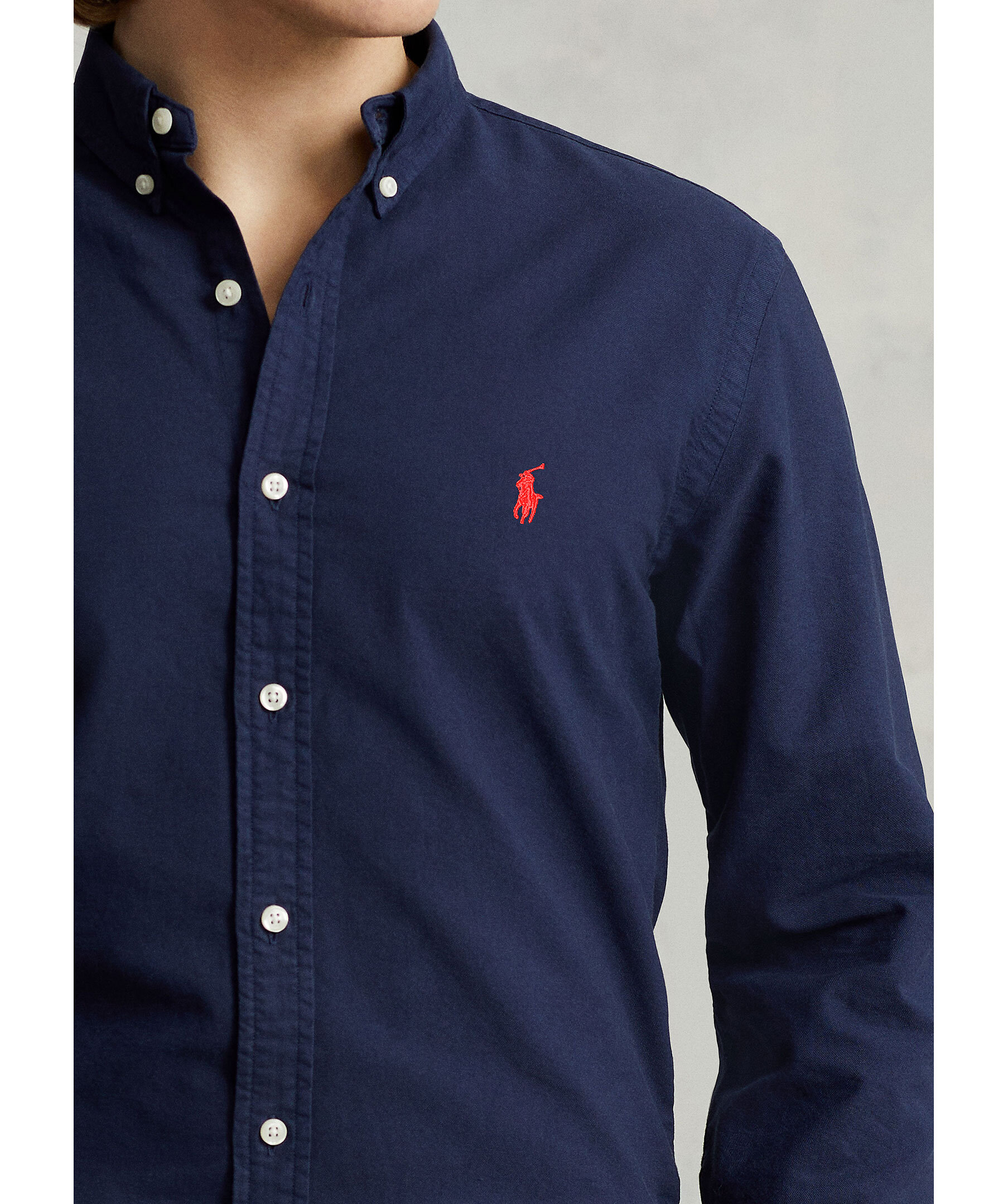 Mörkblå oxfordskjorta från Polo Ralph Lauren. Skjortan är plaggfärgad och stängs med knappar framtill samt har en broderad logotyp på bröstet. Tillverkad i bomull.