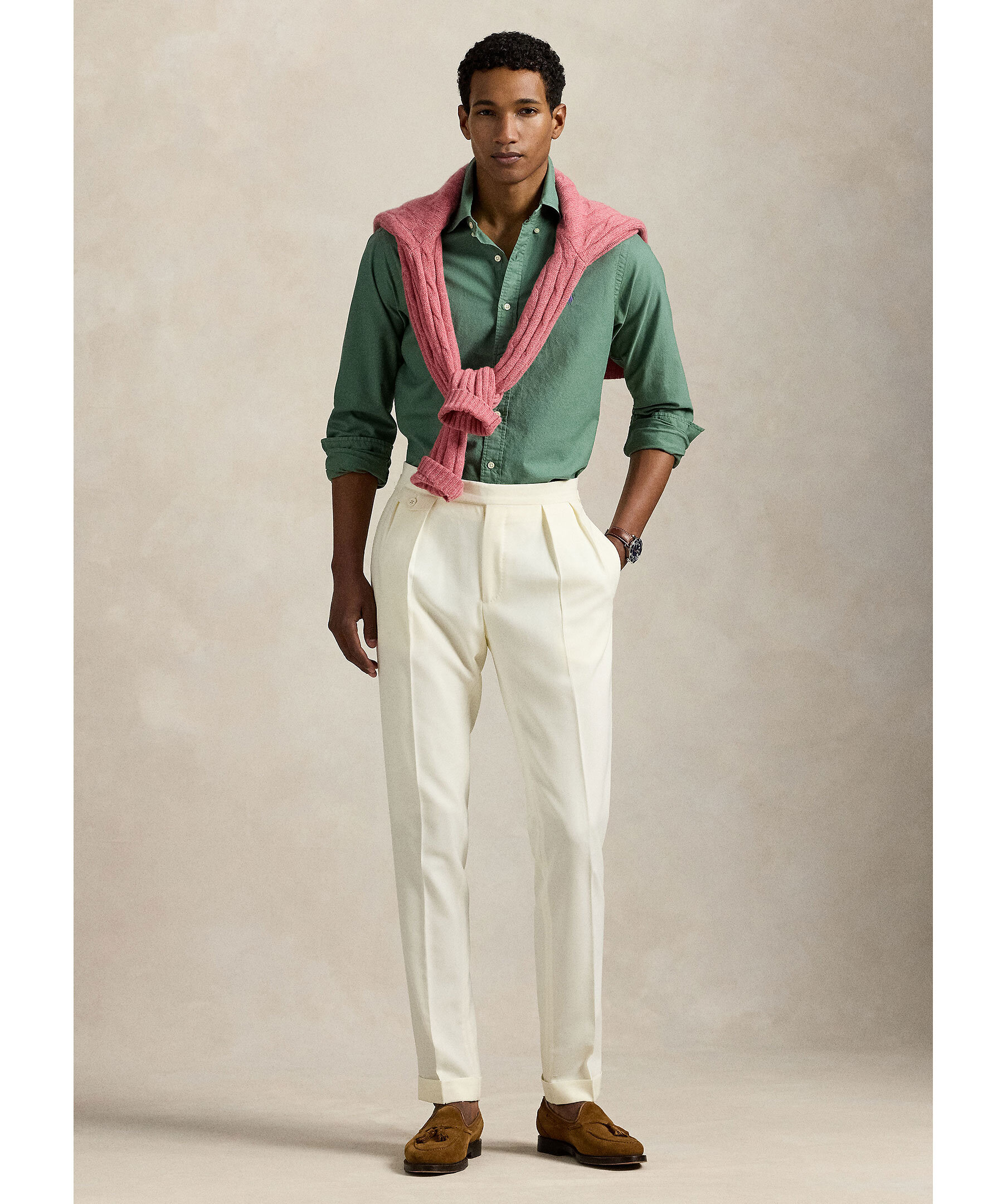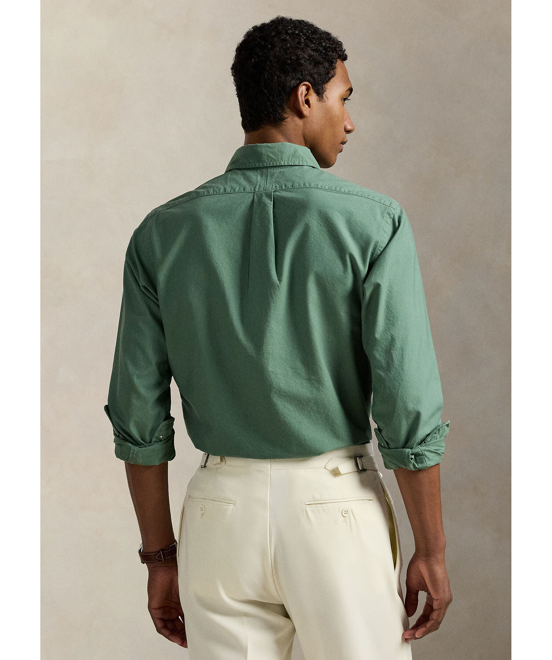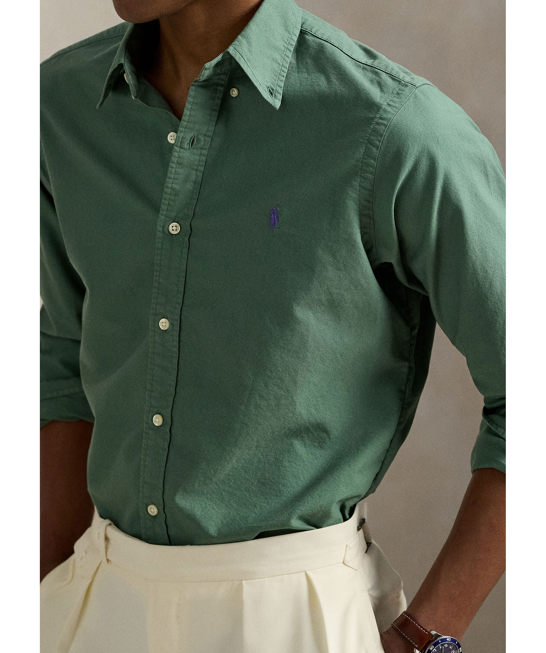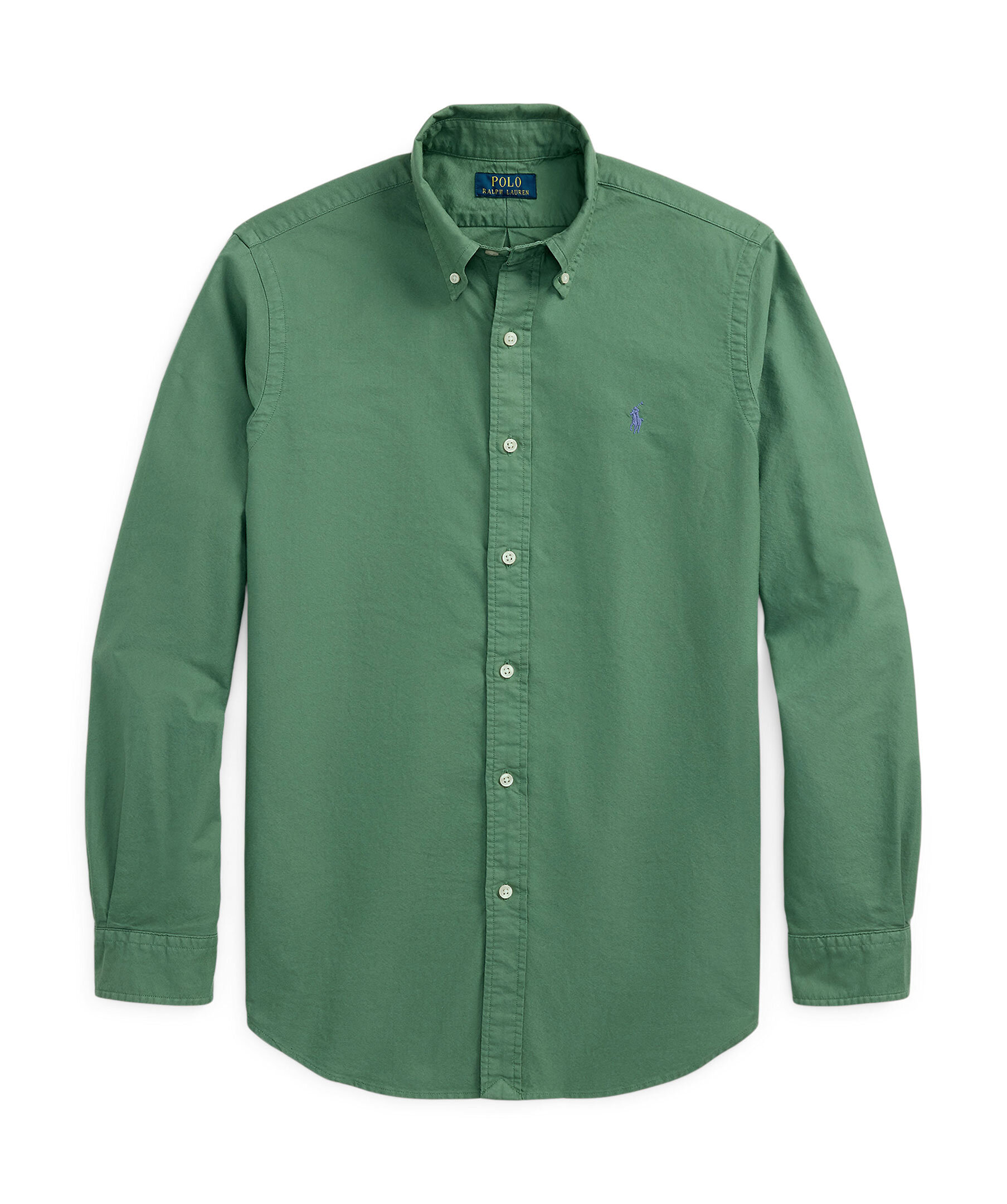 Grön, plaggfärgad skjorta från Polo Ralph Lauren. Skjortan har button-down krage samt broderad logotyp på vänster bröst. Tillverkad i 100% bomull.