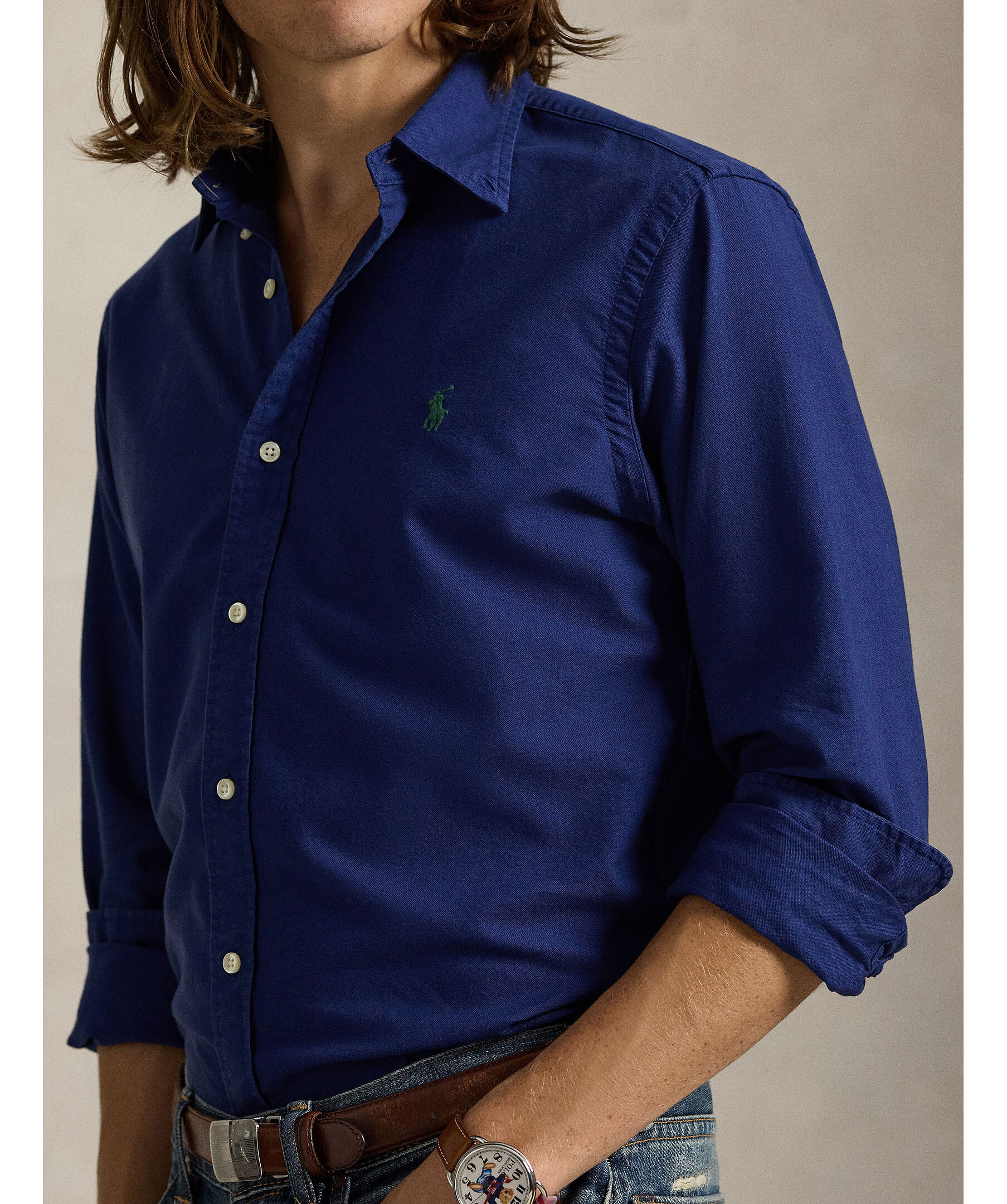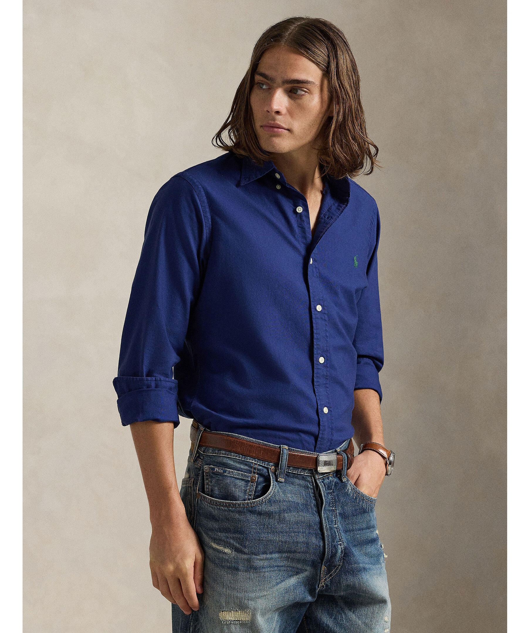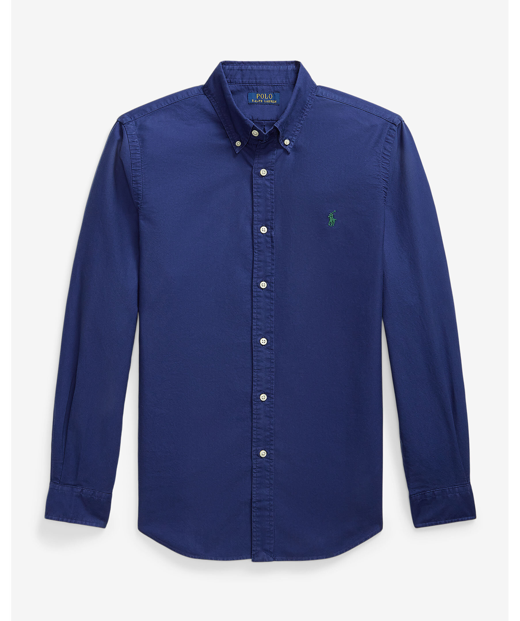 Blå, plaggfärgad skjorta från Polo Ralph Lauren. Skjortan har button-down krage samt broderad logotyp på vänster bröst. Tillverkad i 100% bomull.