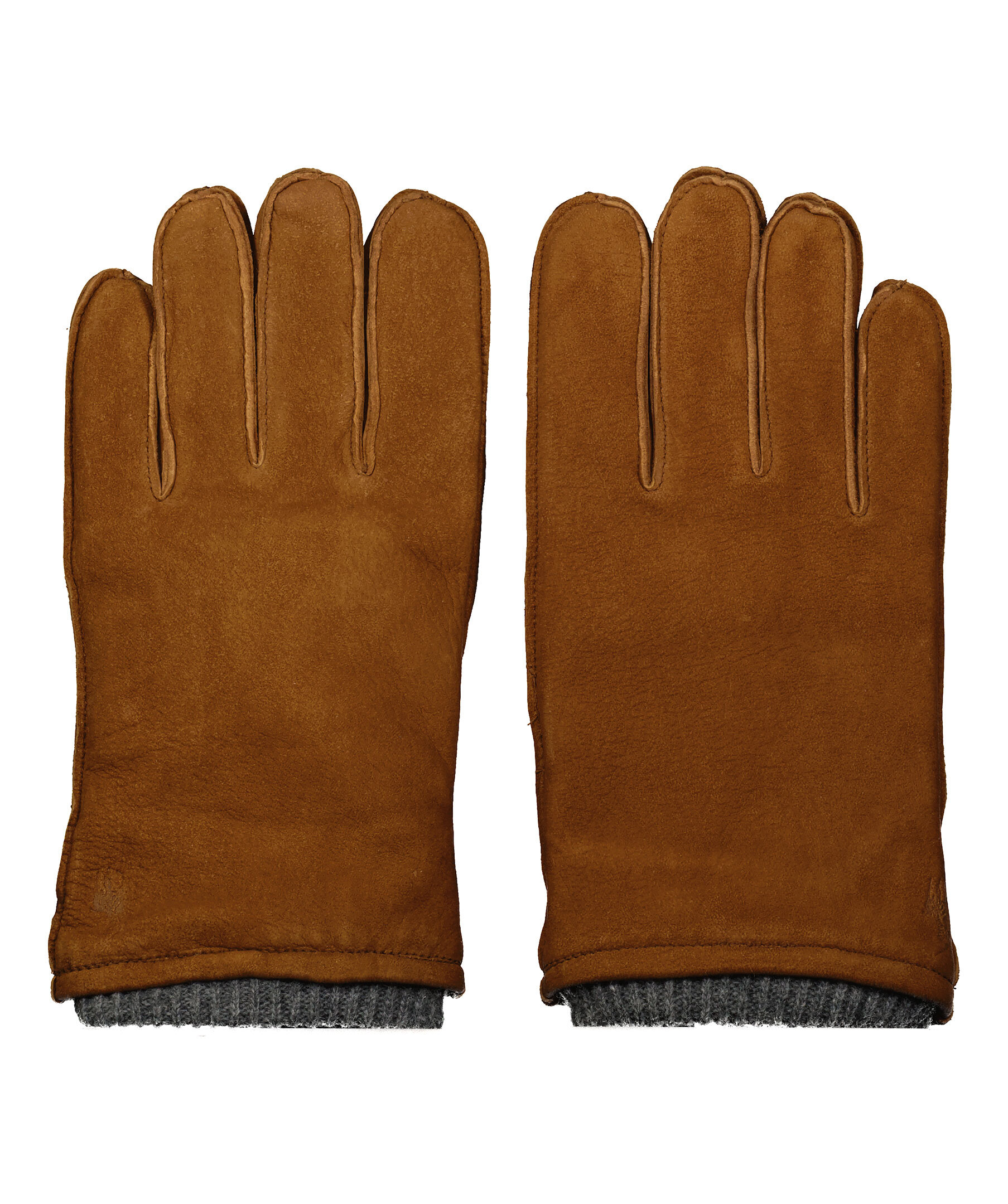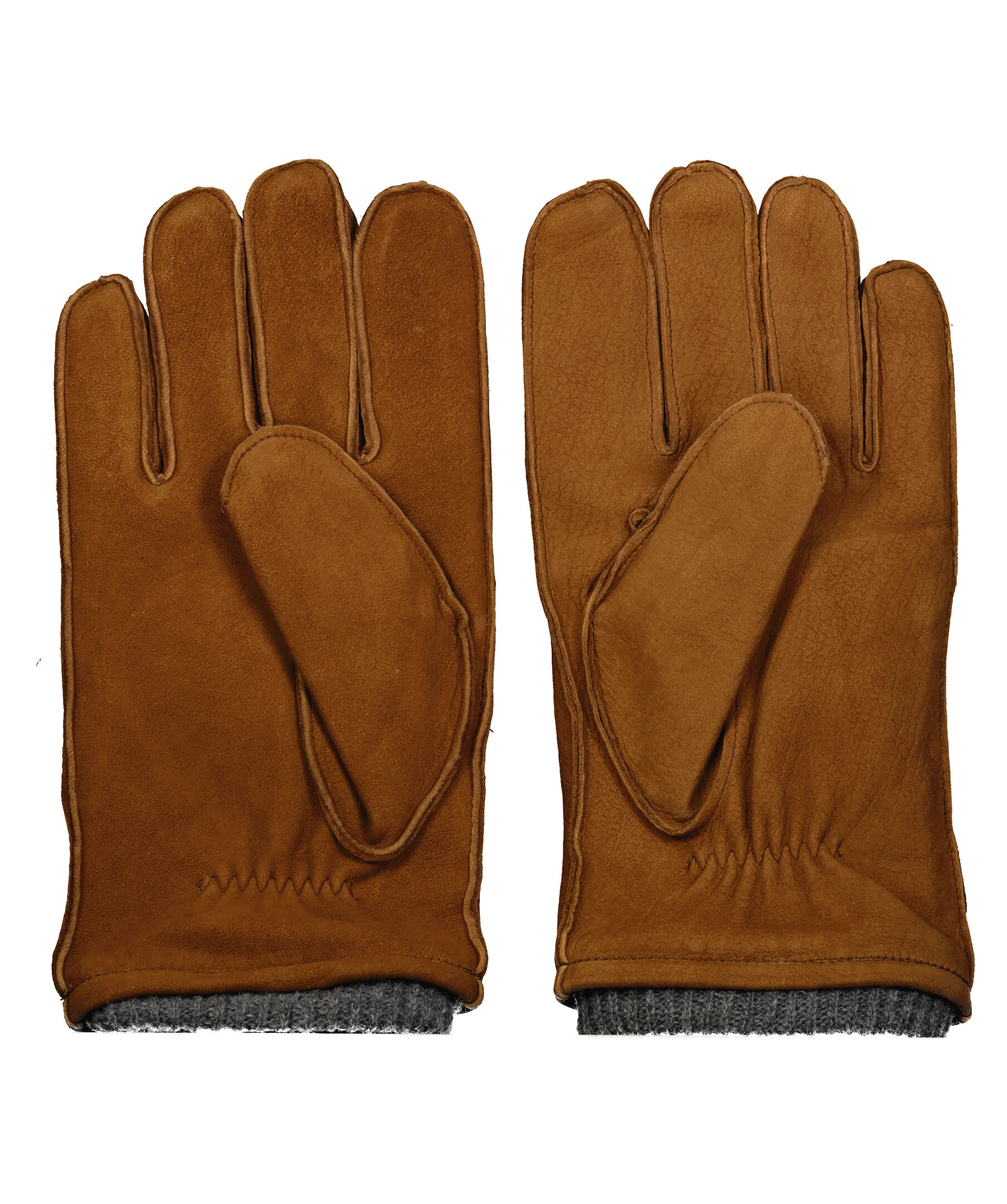 kamelfärgade handskar i mocka från Polo Ralph Lauren. Kabelstickade muddar i grått. Resår på insidan handleden.