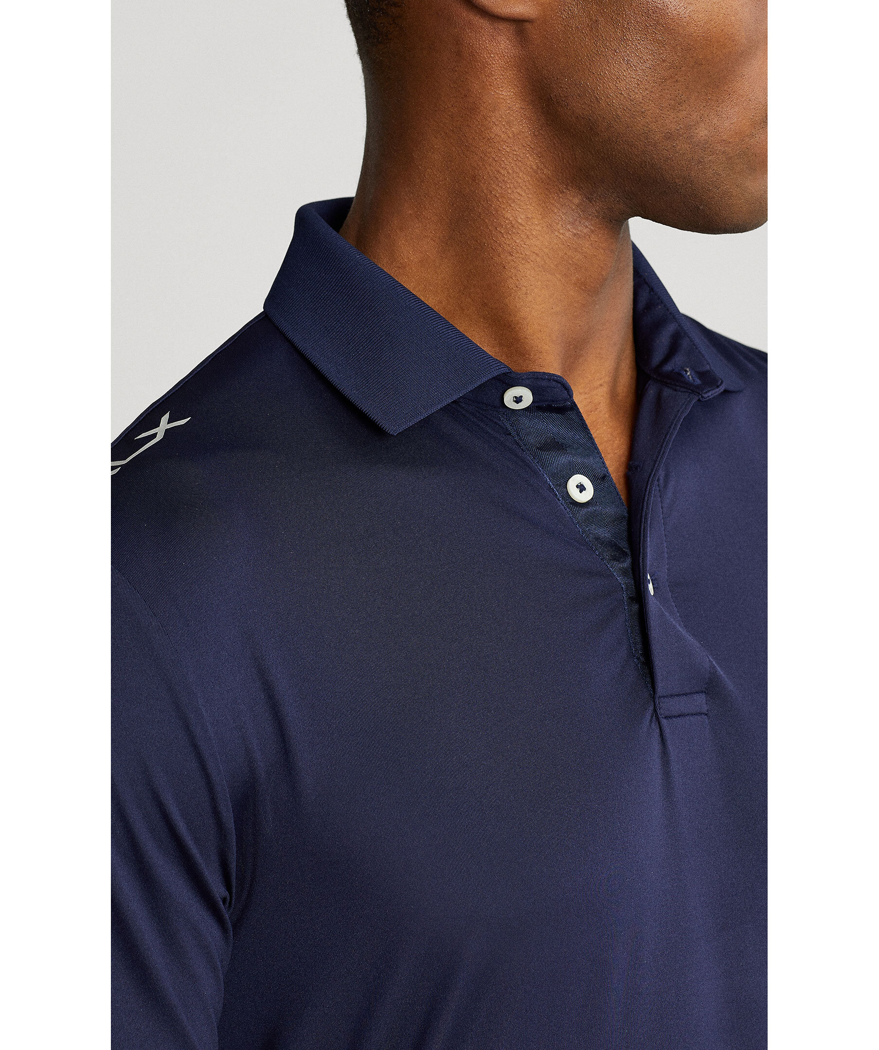 Marinblå lätt golf-pikétröja från Polo Ralph Lauren RLX. Den har fukttransporterande egenskaper för att hålla dig sval och bekväm på banan. Ribbstickad polokrage. Knappslå med tre knappar. "RLX" broderad och tryckt på höger axel, vänster ärm och nacken bak. Dess andningsbara stretchtröja är tillverkad av återvunnen polyester, vilket förstärker Ralph Laurens mål att skapa produkter av högsta kvalitet med minimal skada på miljön.