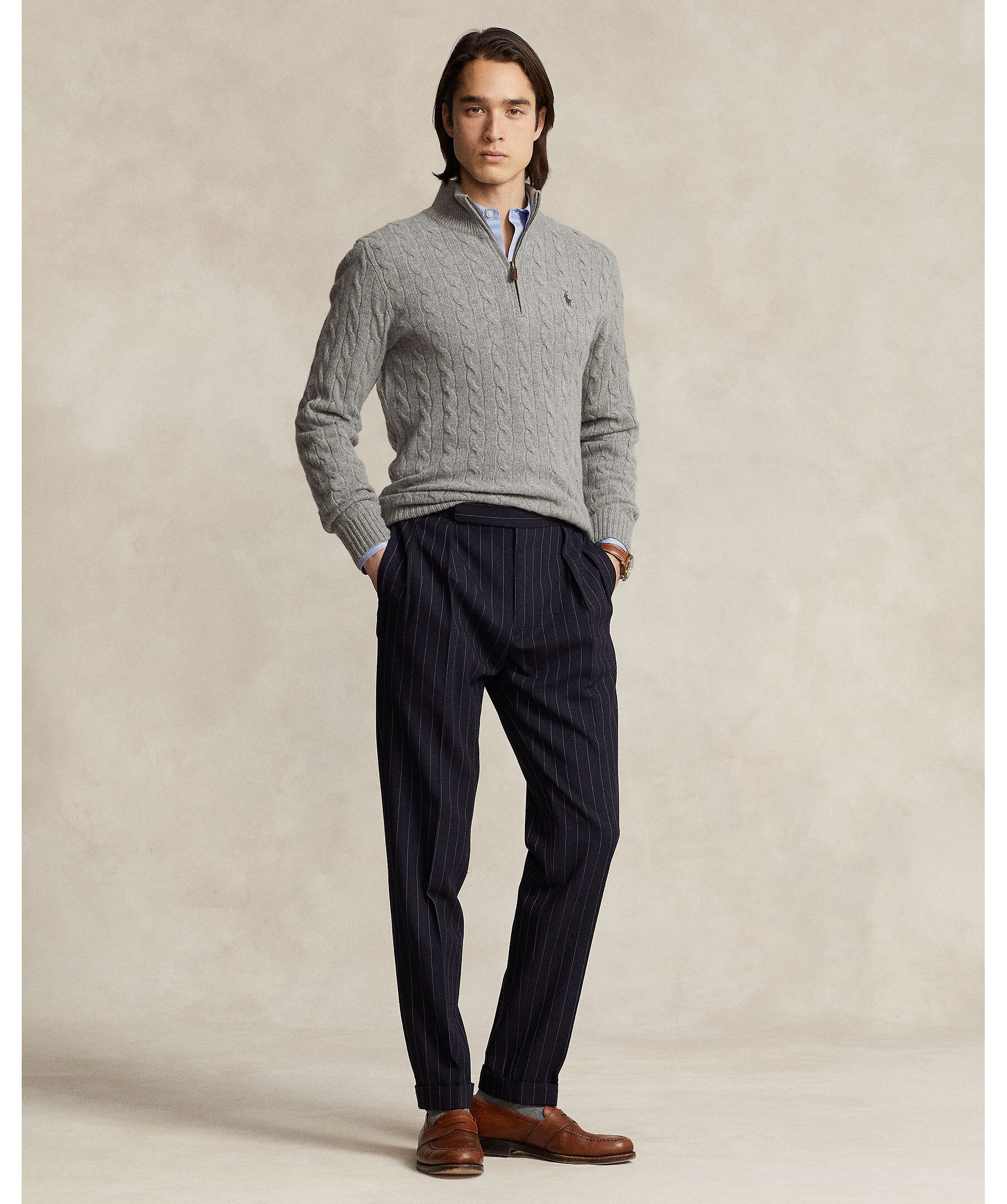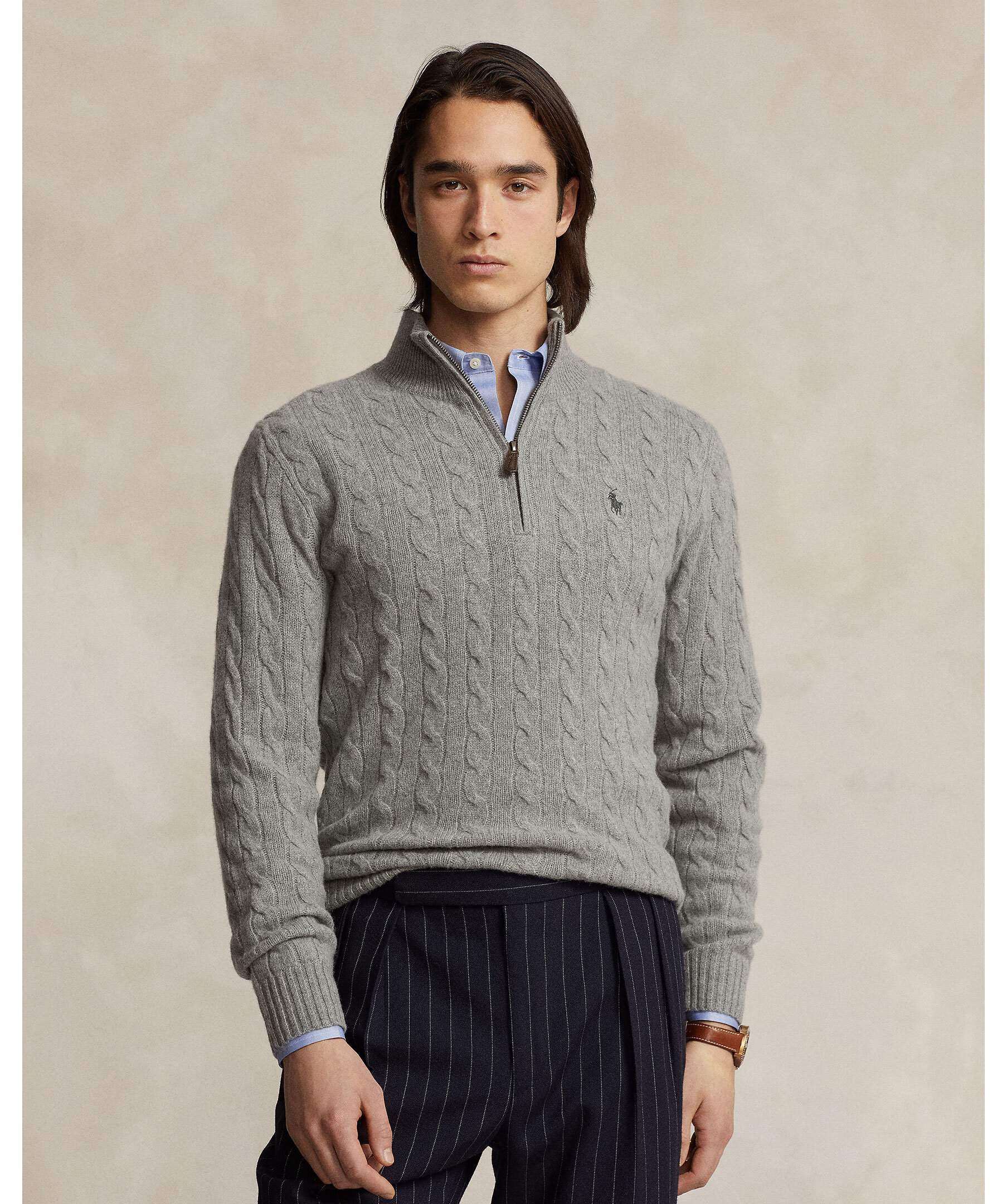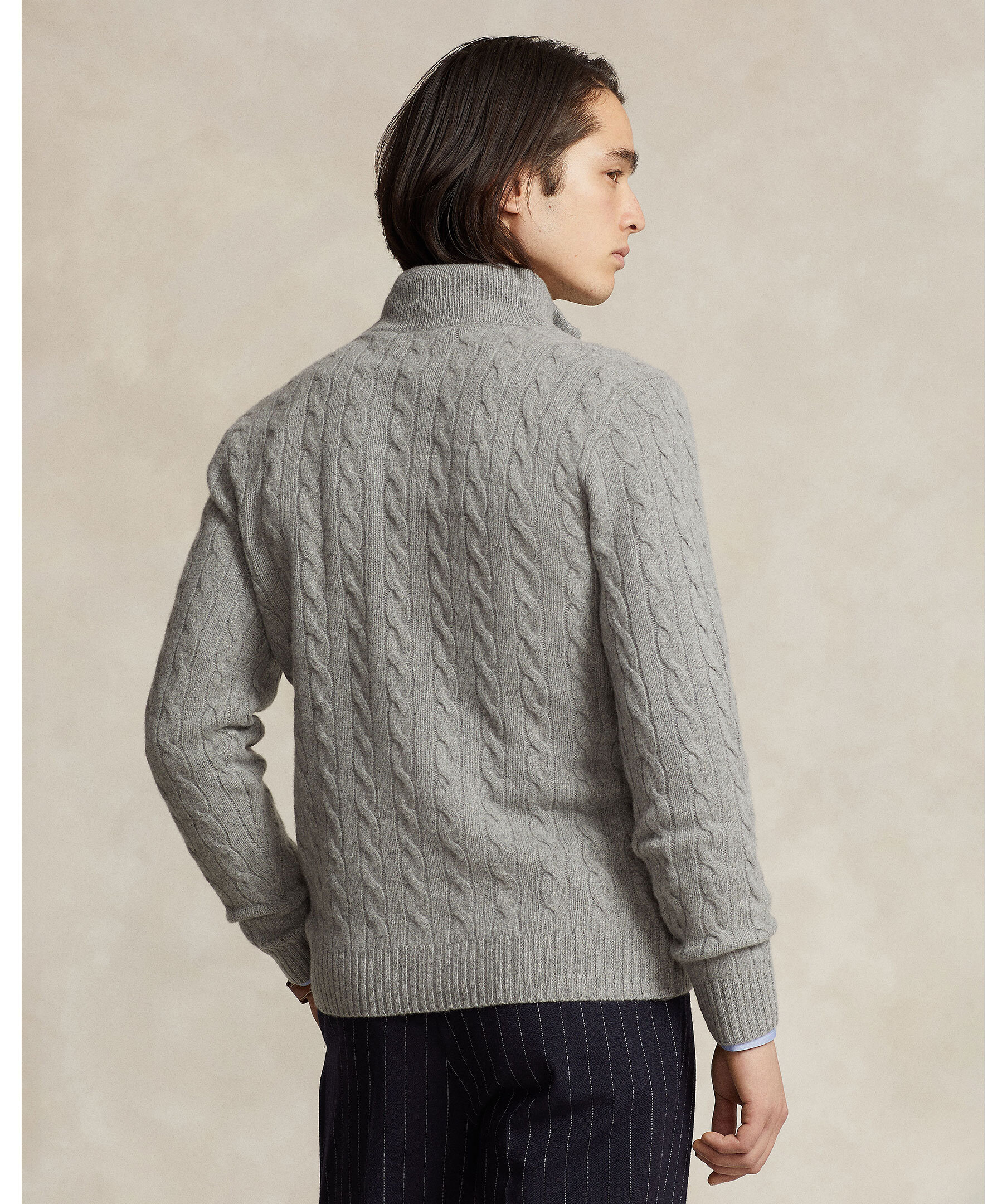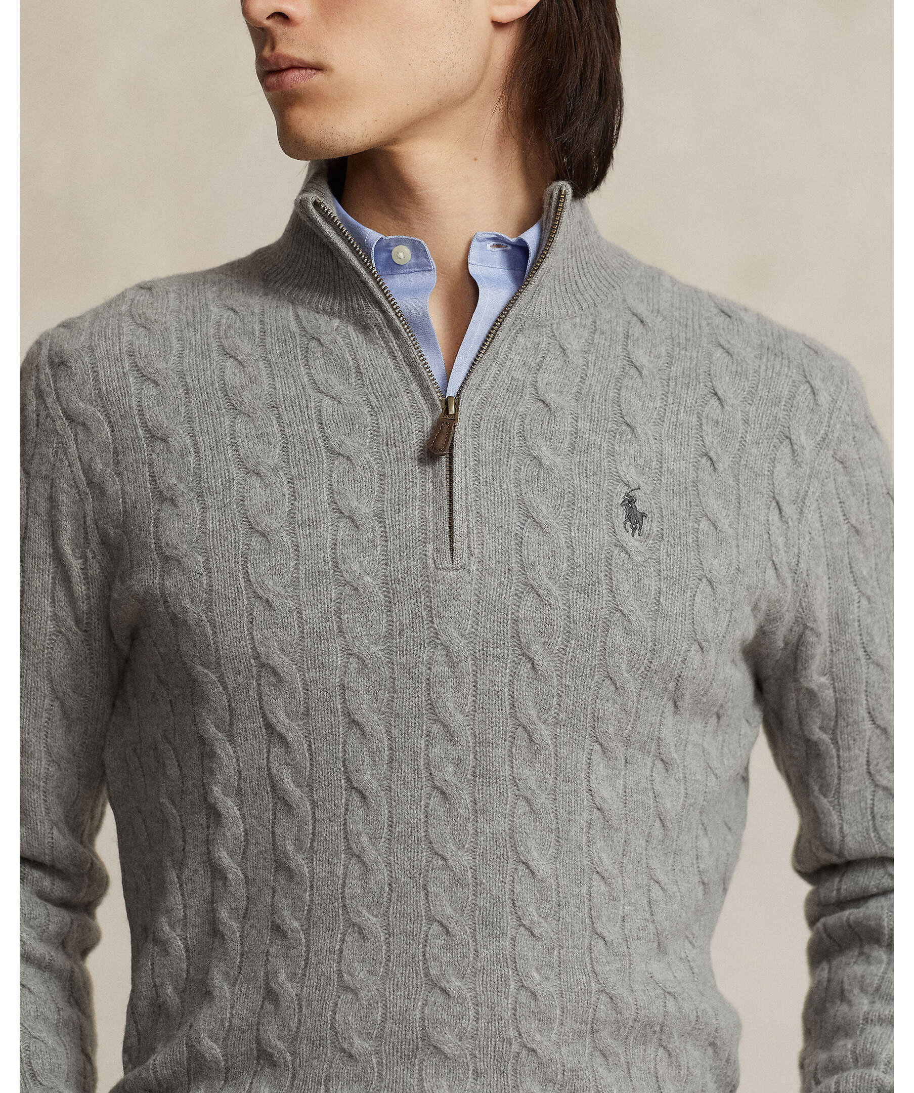 Kabelstickad half-zip från Polo Ralph Lauren. Ribbstickade muddar och broderad polohäst på bröstet. Gjord i en ull och kashmirblandning.