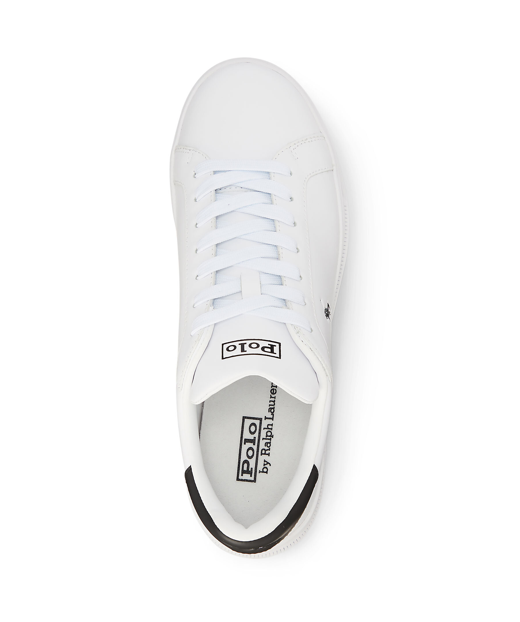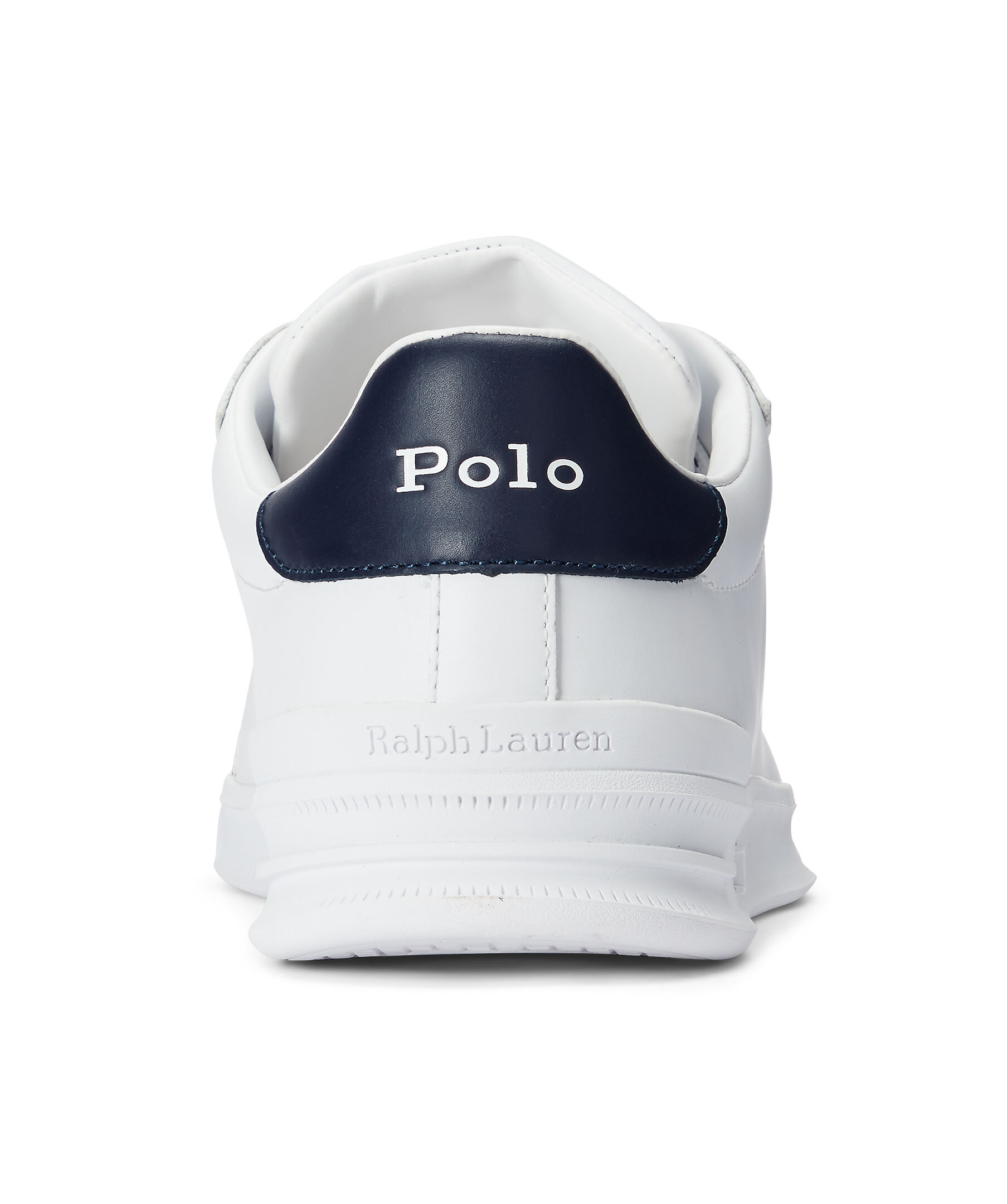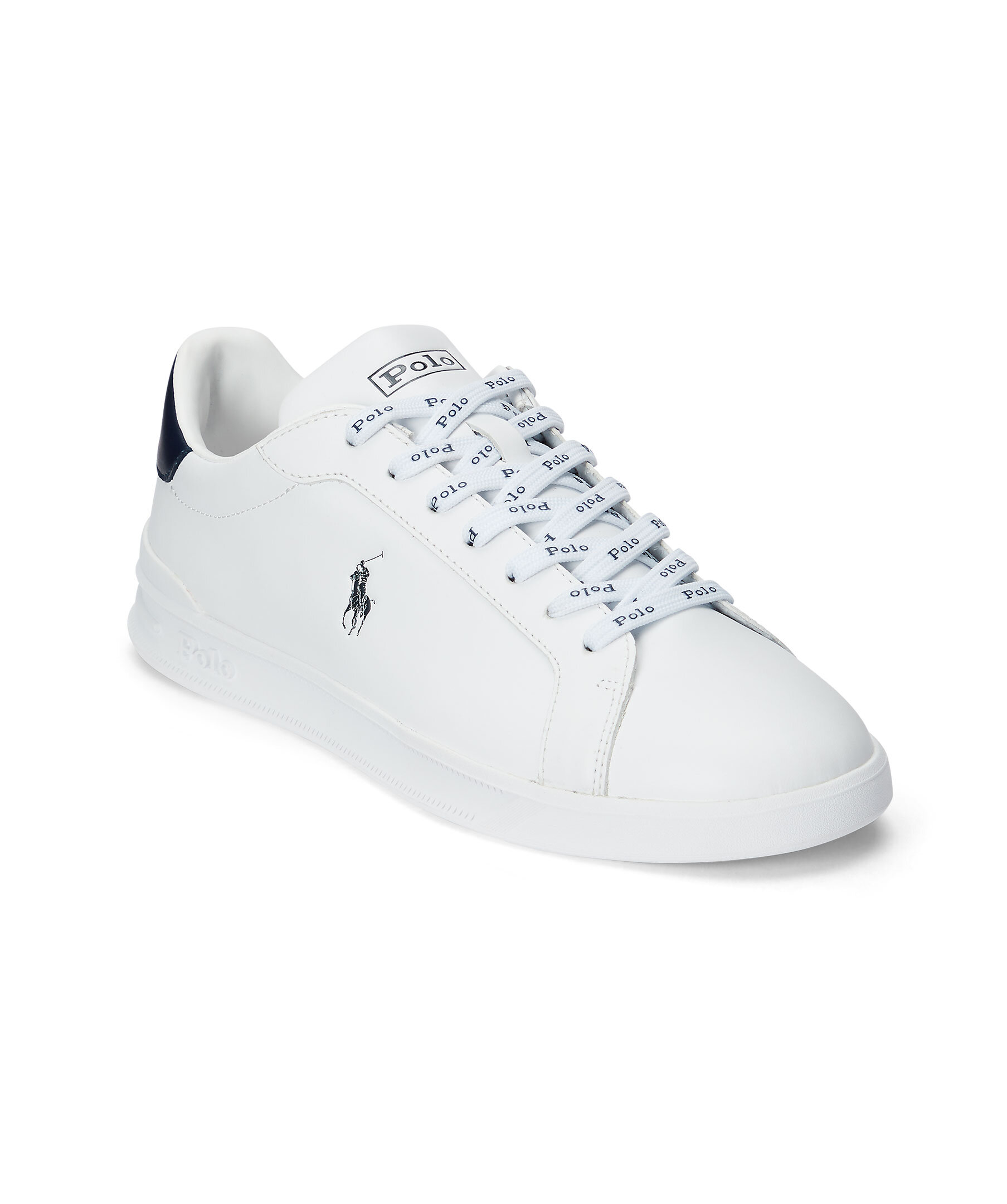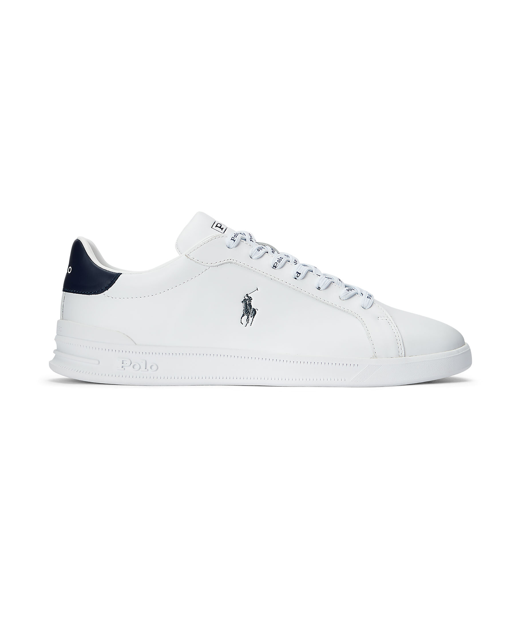 Vita lädersneakers från Polo Ralph Lauren i en matt finish. Liten tryckt logga på sidan och kontrastfärgad detalj i Mörkblått vid hälen. Skosnören med logotyper i blått, tillkommer även helvita skosnören.
