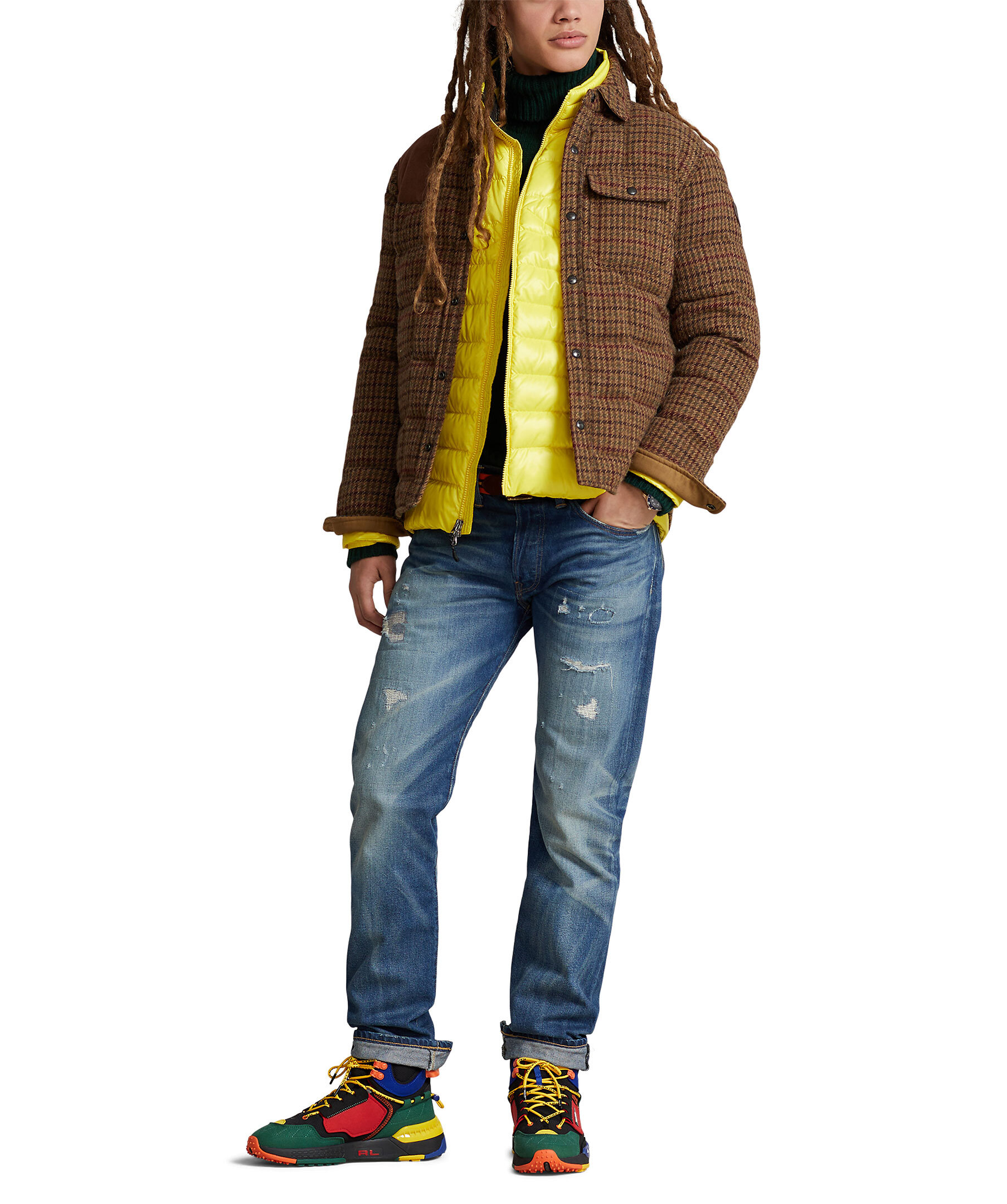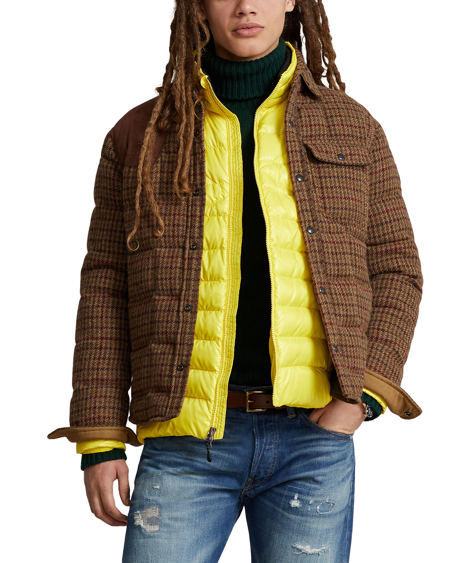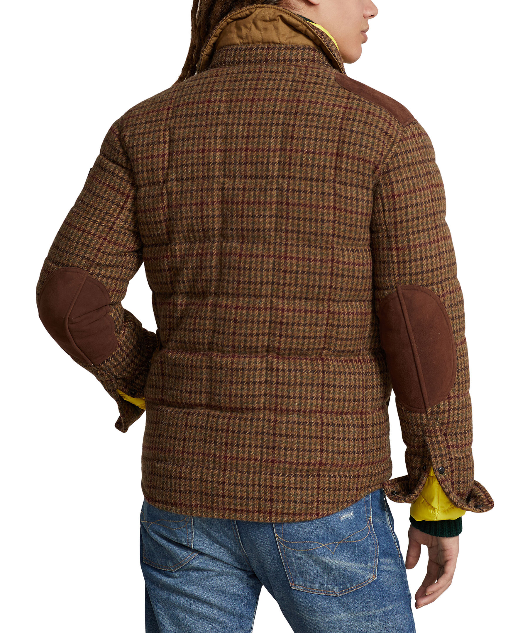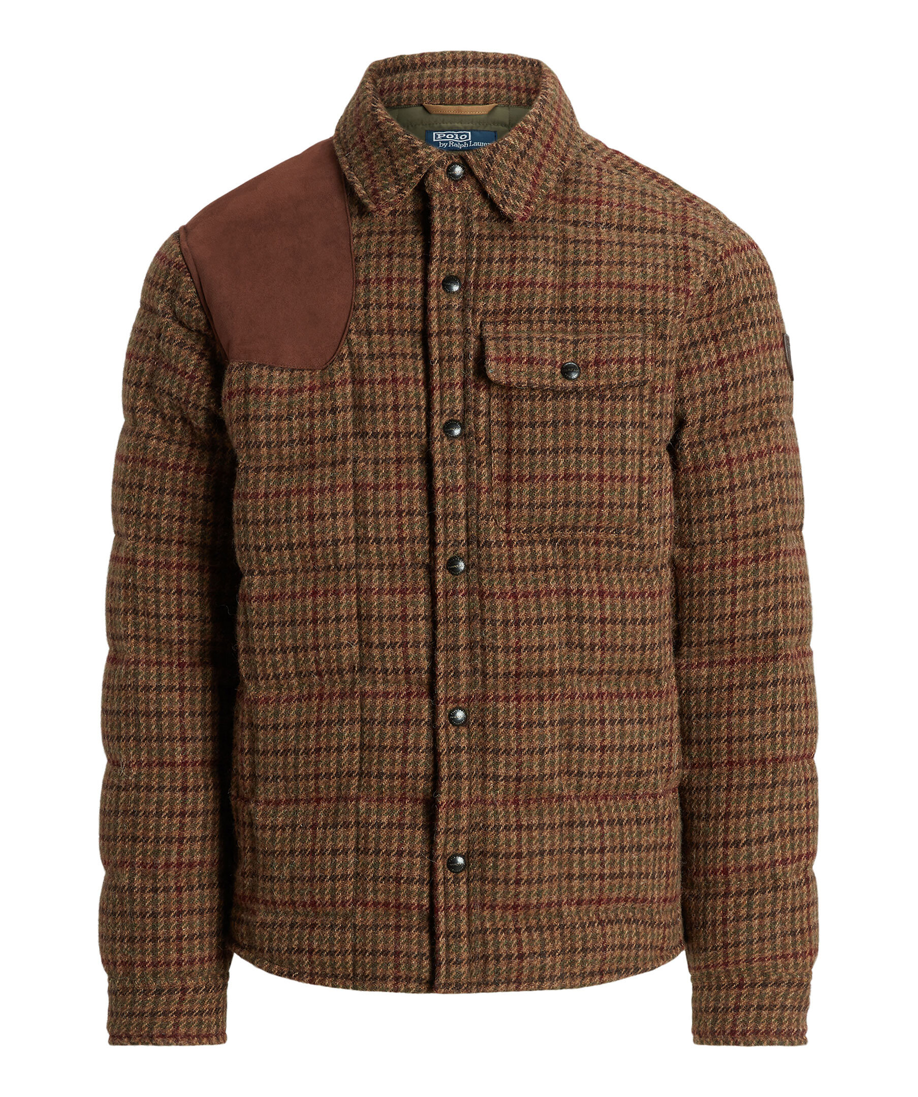 Brun, rutig jacka från Polo Ralph Lauren. Den här jackan med överrutiga tuffa är gjord av ulltyg av sybehörskvalitet som specialutvecklades för Polo Ralph Lauren av Irlands Magee 1866, som grundades på handvävd tweed för mer än 150 år sedan. Den är isolerad med en 750-fill-power down och avslutad med mockalappar. Punktkrage. Knäppt knappslå. Långa ärmar med mocka armbågslappar. Knäppta fatmanschetter. Mockaplåster på höger axel. Vänster bröstficka med knäppning. Två innerfickor i midjan. Läder "Polo Ralph Lauren" sköldlapp med vår signaturponny på vänster ärm.
