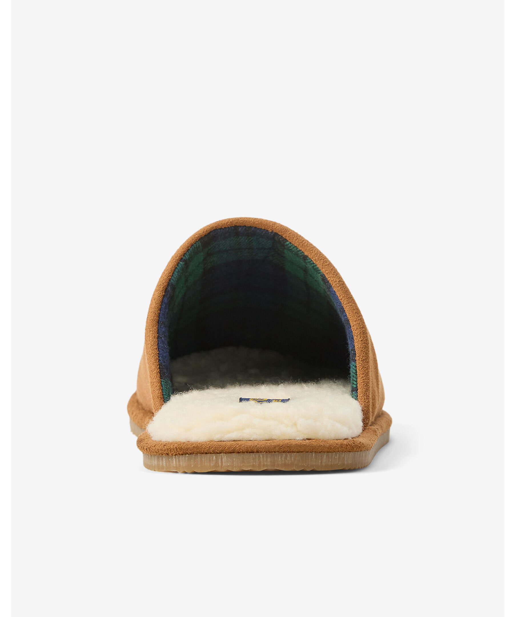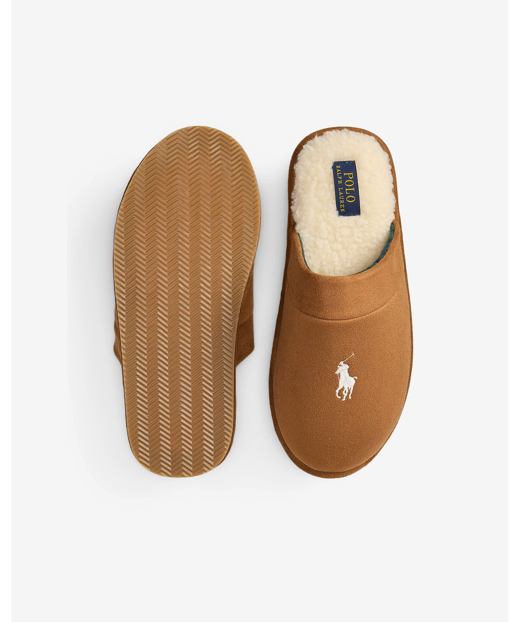 Kamelfärgade tofflor från Polo Ralph Lauren med ett mjuk och fluffigt foder i teddyfleece.