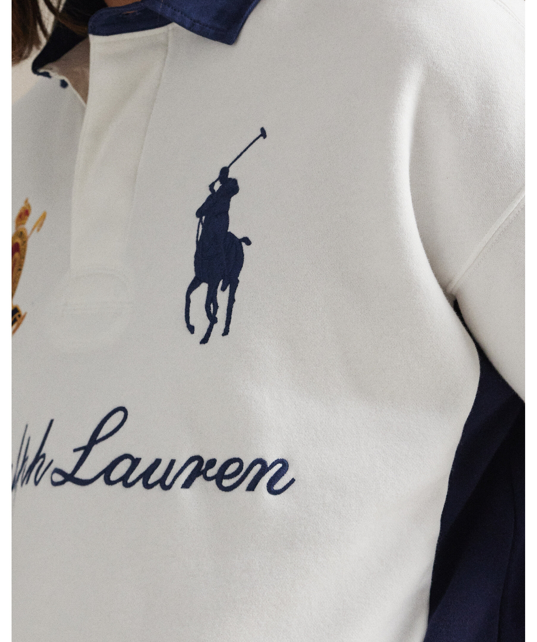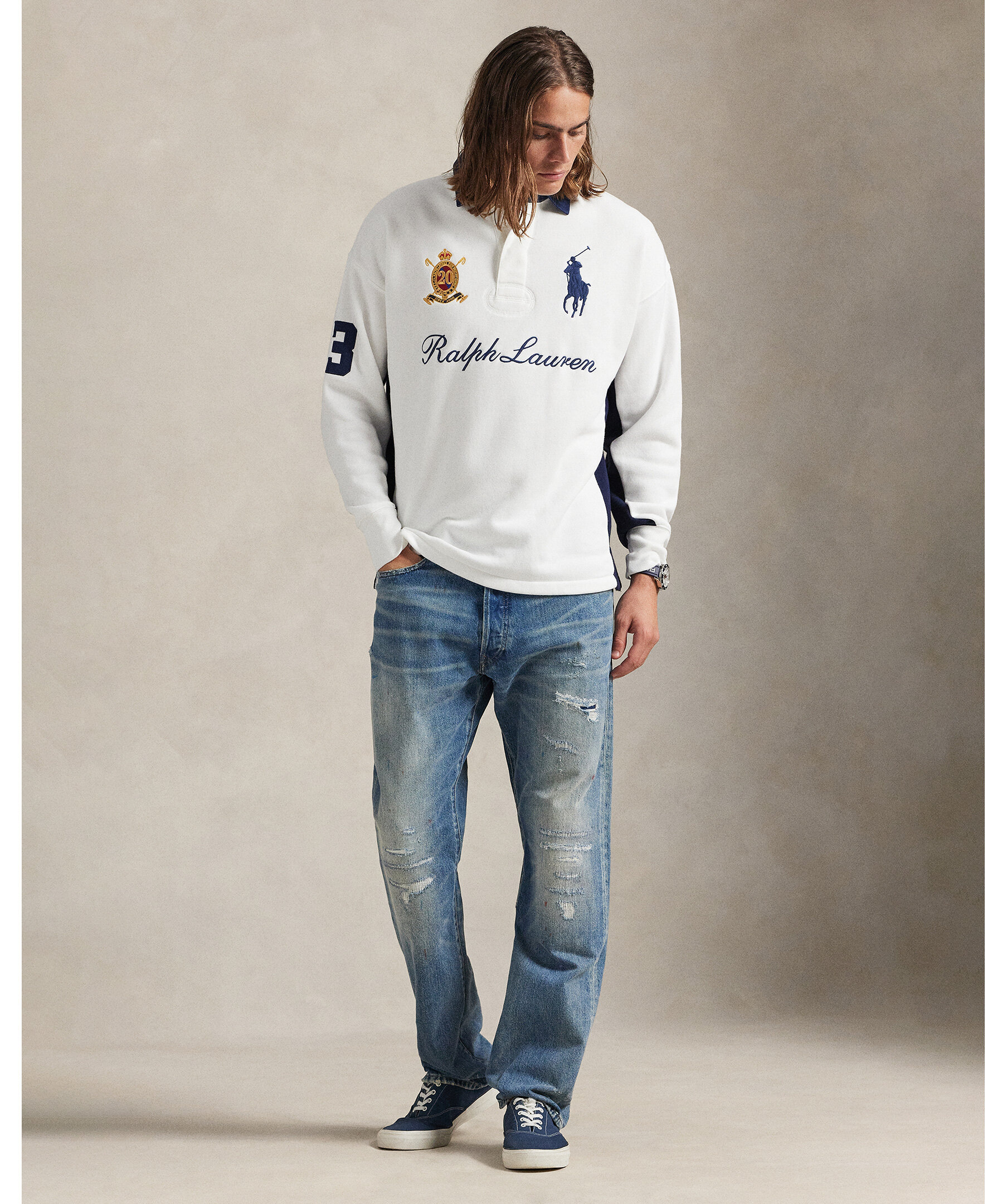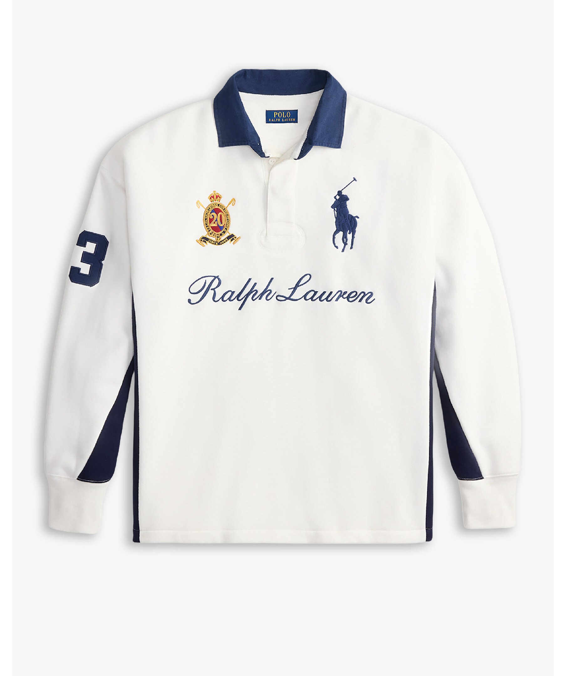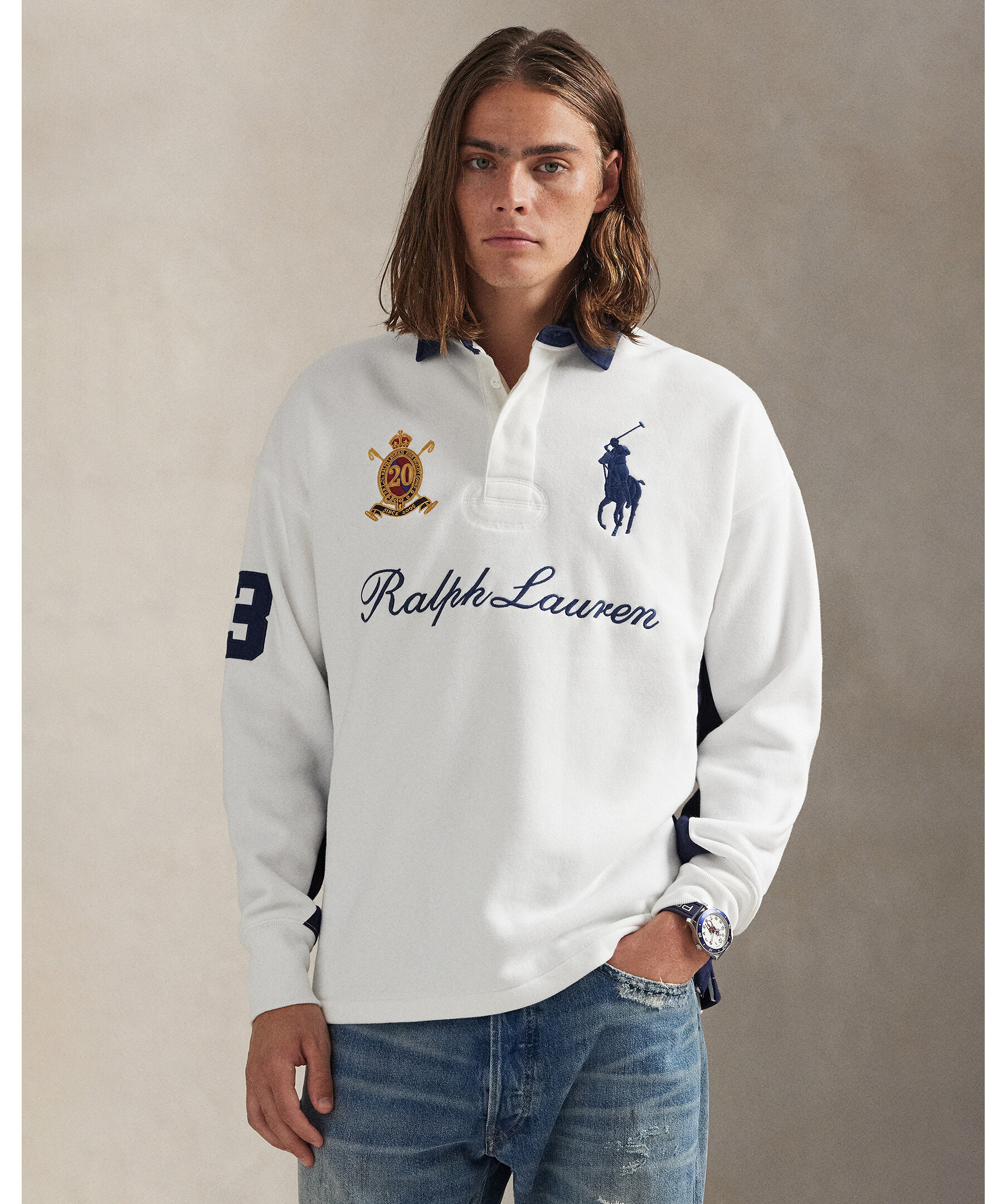 Mjuk sweatshirt från Ralph Lauren med sportig rugby‑inspirerad twist och jubileumsbroderi som hyllar 20 år av Big Pony‑kollektionen. Tröjan har en krage i twill med rubber buttons, ribbade avslut och ett broderat 20‑crestmärke tillsammans med Ralph Laurens logotyp och klassiska Big Pony‑motiv för en tidlös, preppy look.