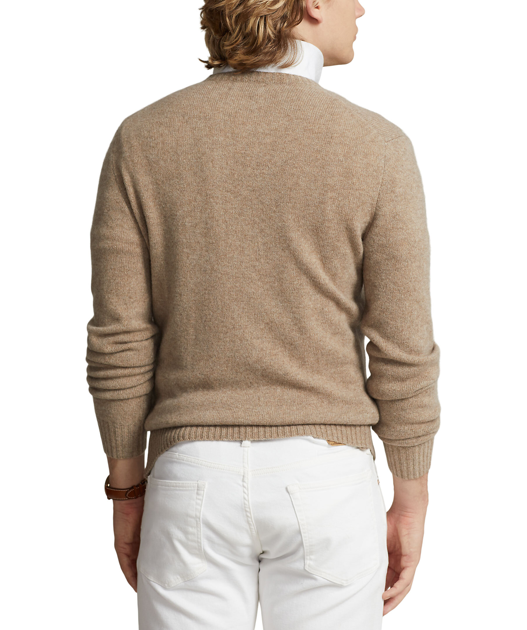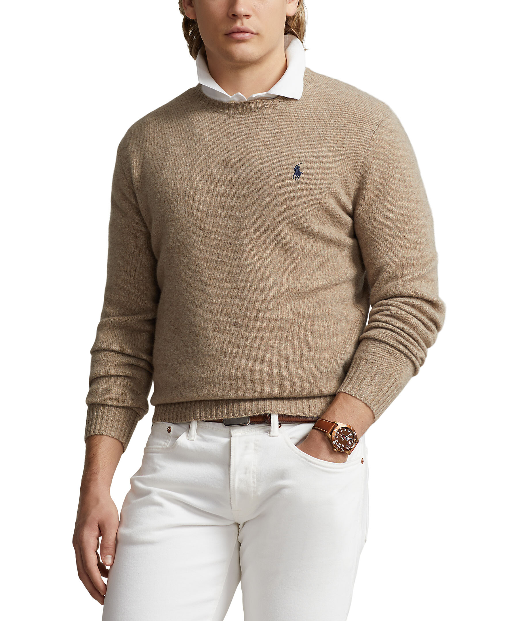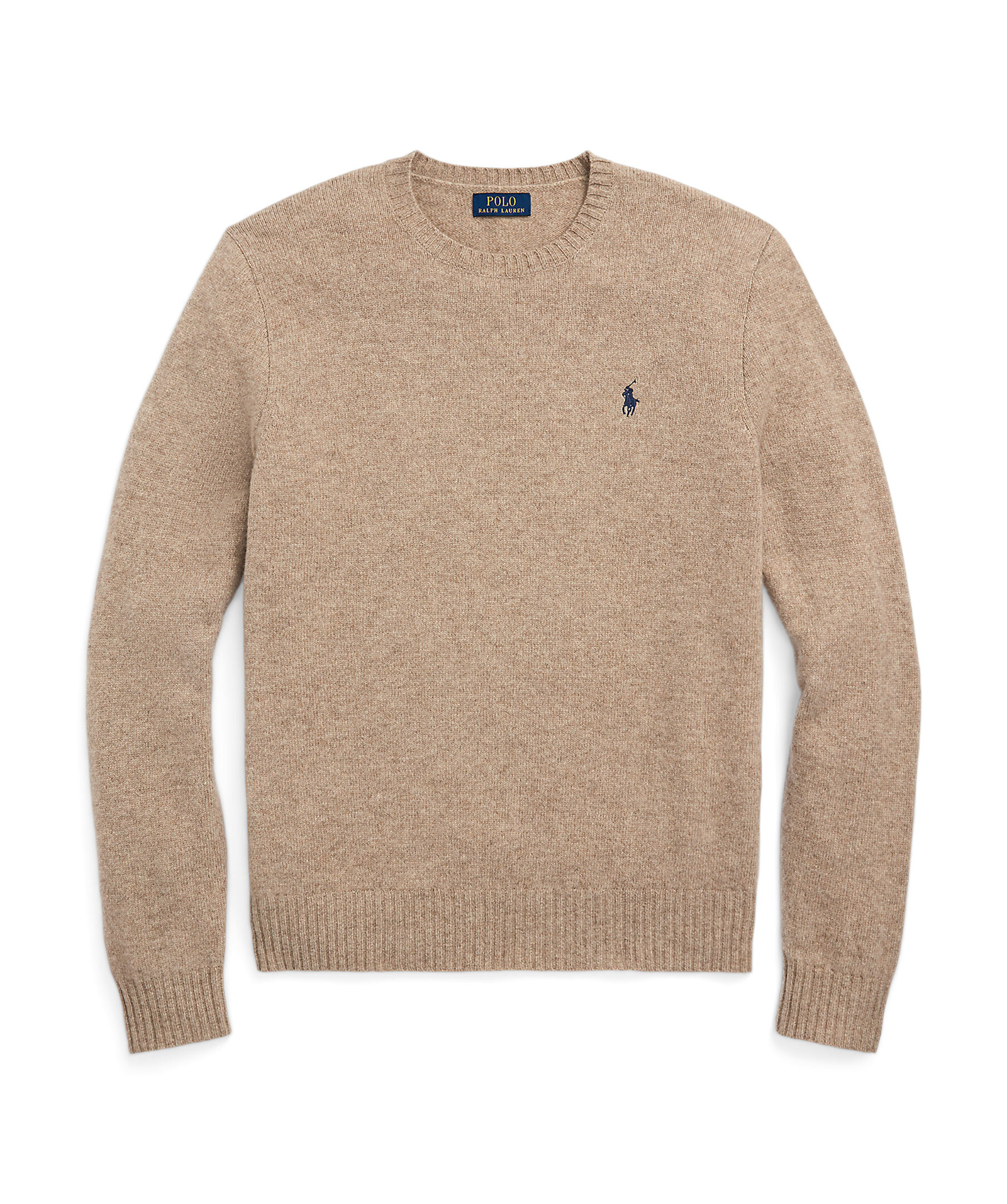 Beige melerad stickad tröja från Polo Ralph Lauren. Runda halsringning. Ribbstickads mudd vid ärm- och plaggslut, kragen. Broderad logotyp på vänster bröst. Tillverkad i ull och kashmirblandning.