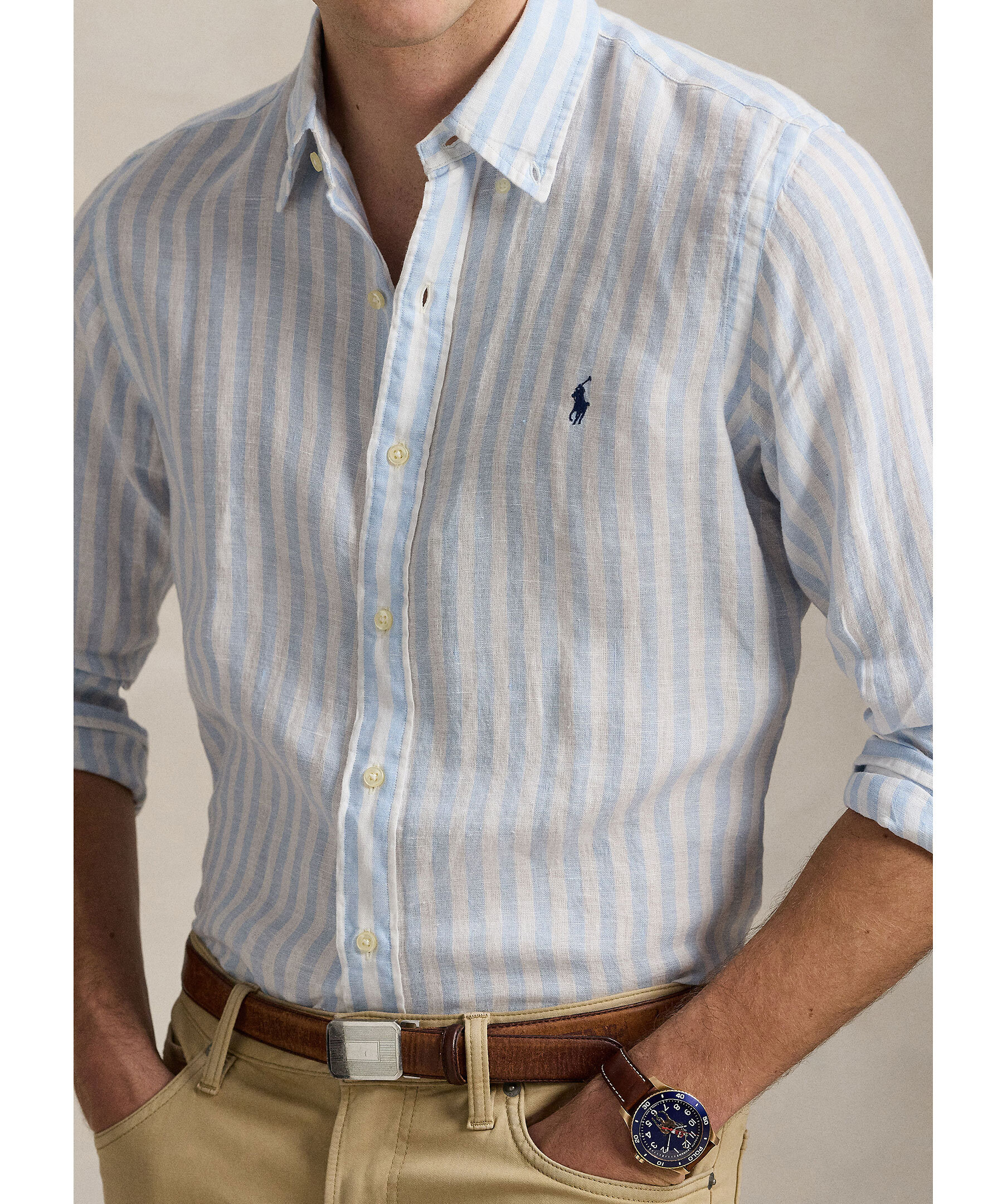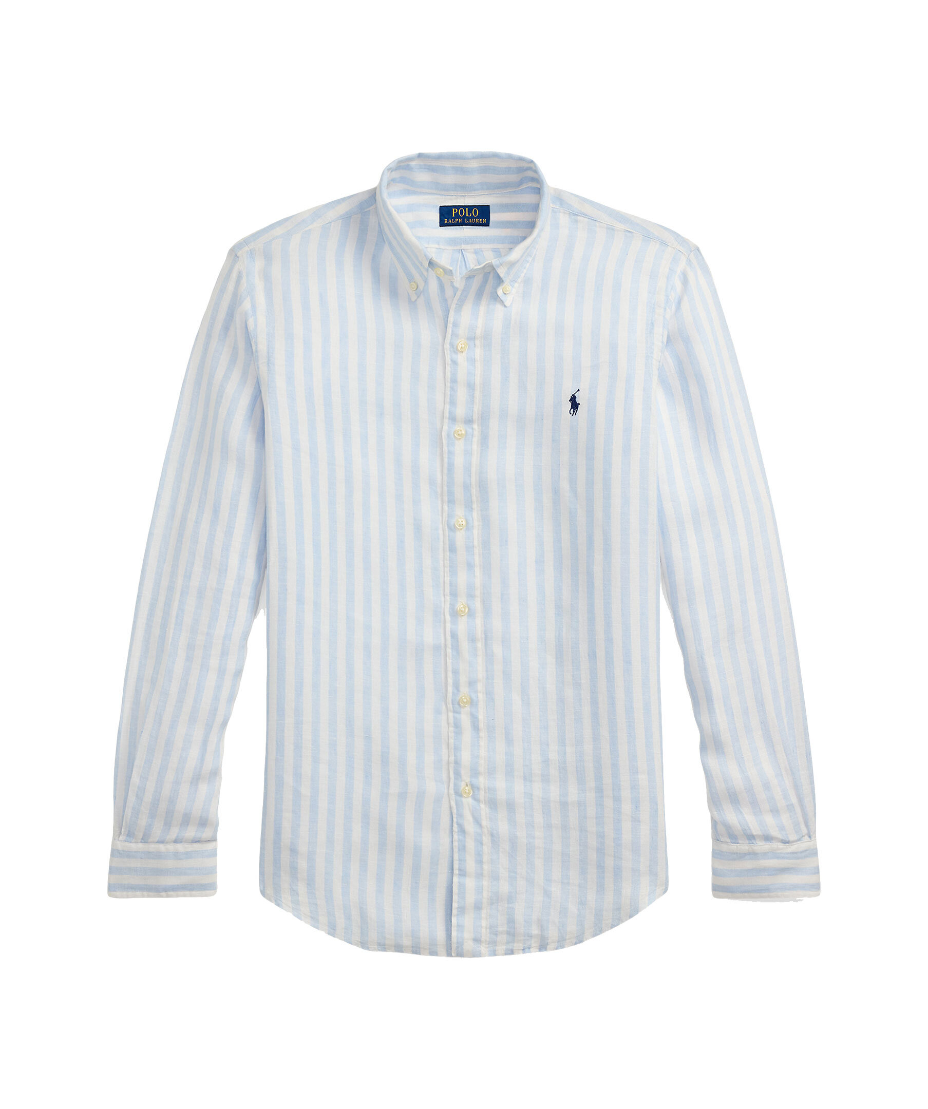 Ljusblå linne skjorta från Polo Ralph Lauren. Skjortan har ett randig mönster i ljusblått och vitt, button down-krage och rundade avslut. Broderad liten logotyp på bröstet. Tillverkad av linne.