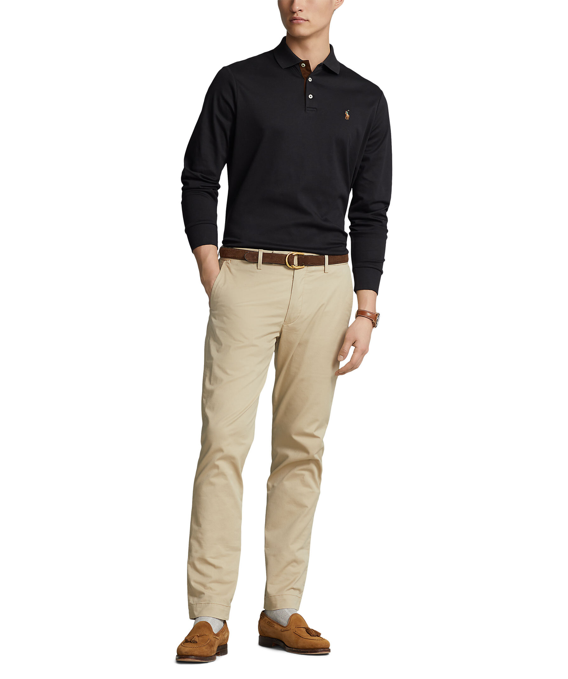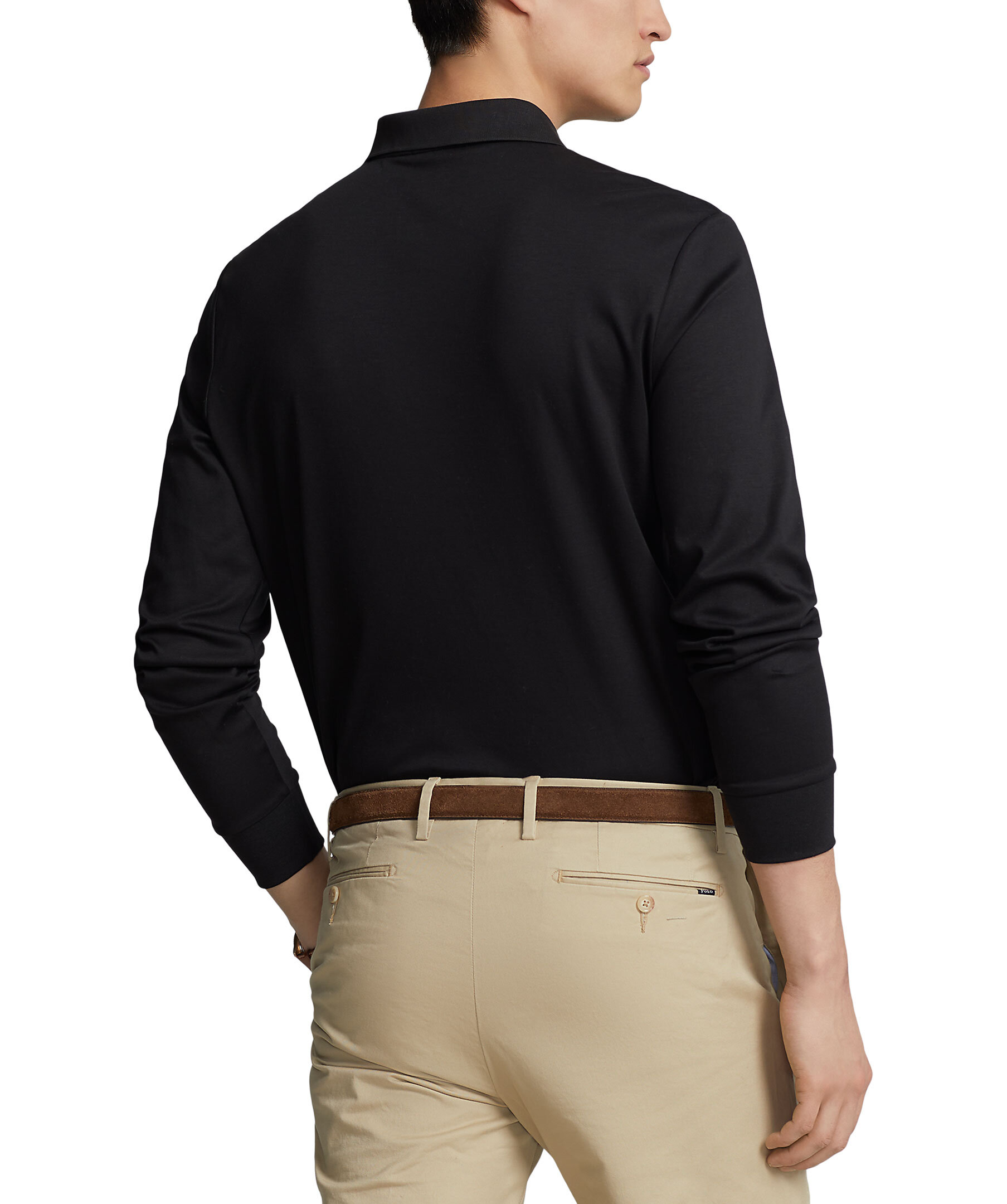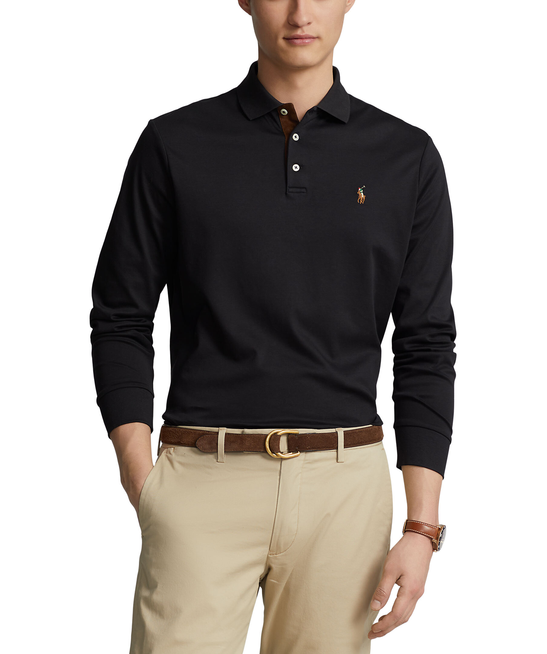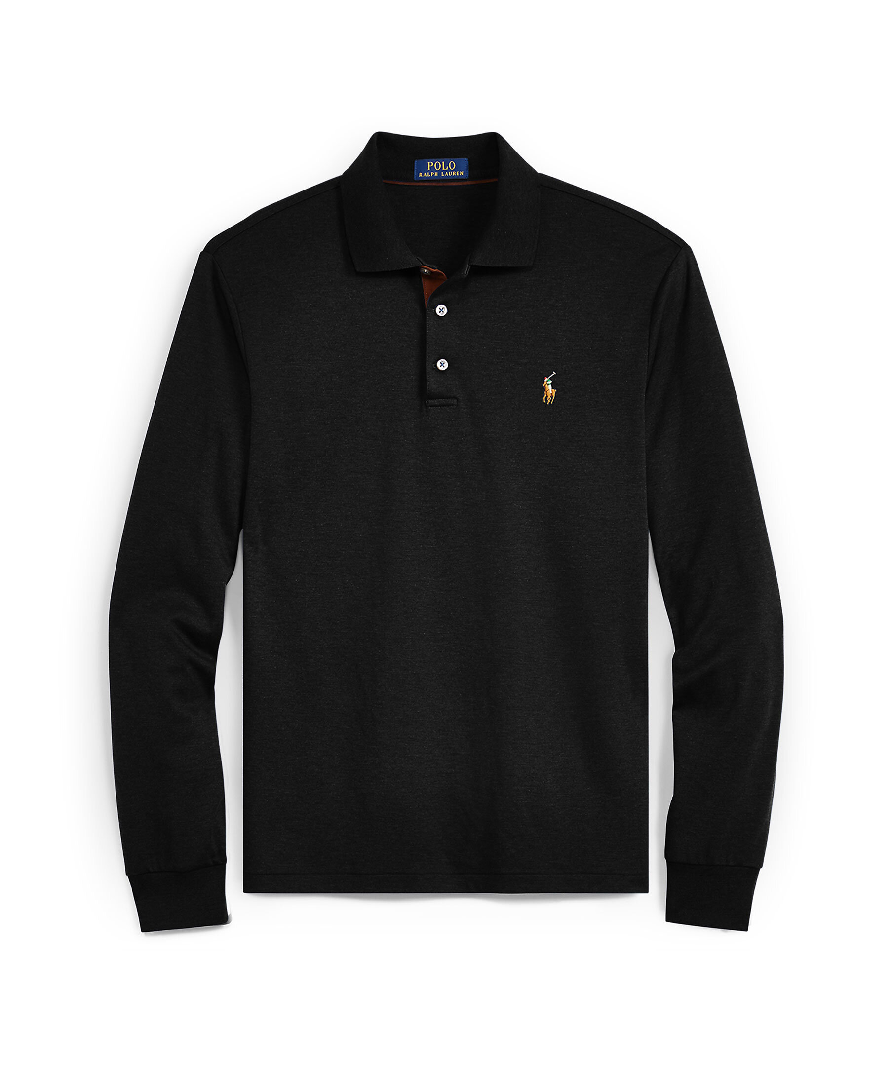 Svart långärmad piké från Polo Ralph Lauren. Elastisk krage, tre knappar. Broderad logotyp på vänster bröst. Tillverkad i 100% bomull. Korta slitsar i sidorna.