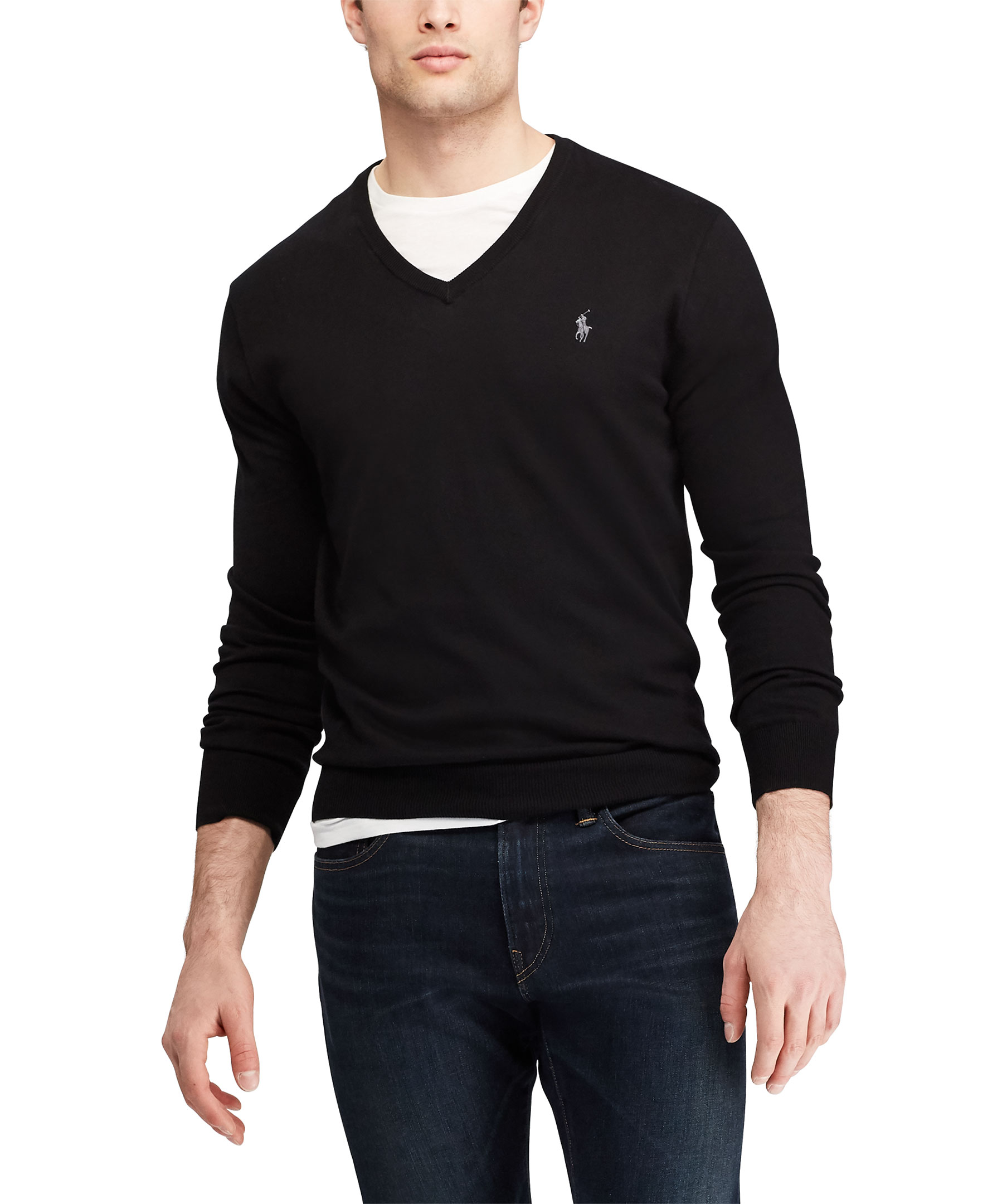 Svart finstickad pullover i smal passform, från Polo Ralph Lauren. Tillverkad i bomullskvalitet. Broderad logotyp på bröstet, v-ringning.