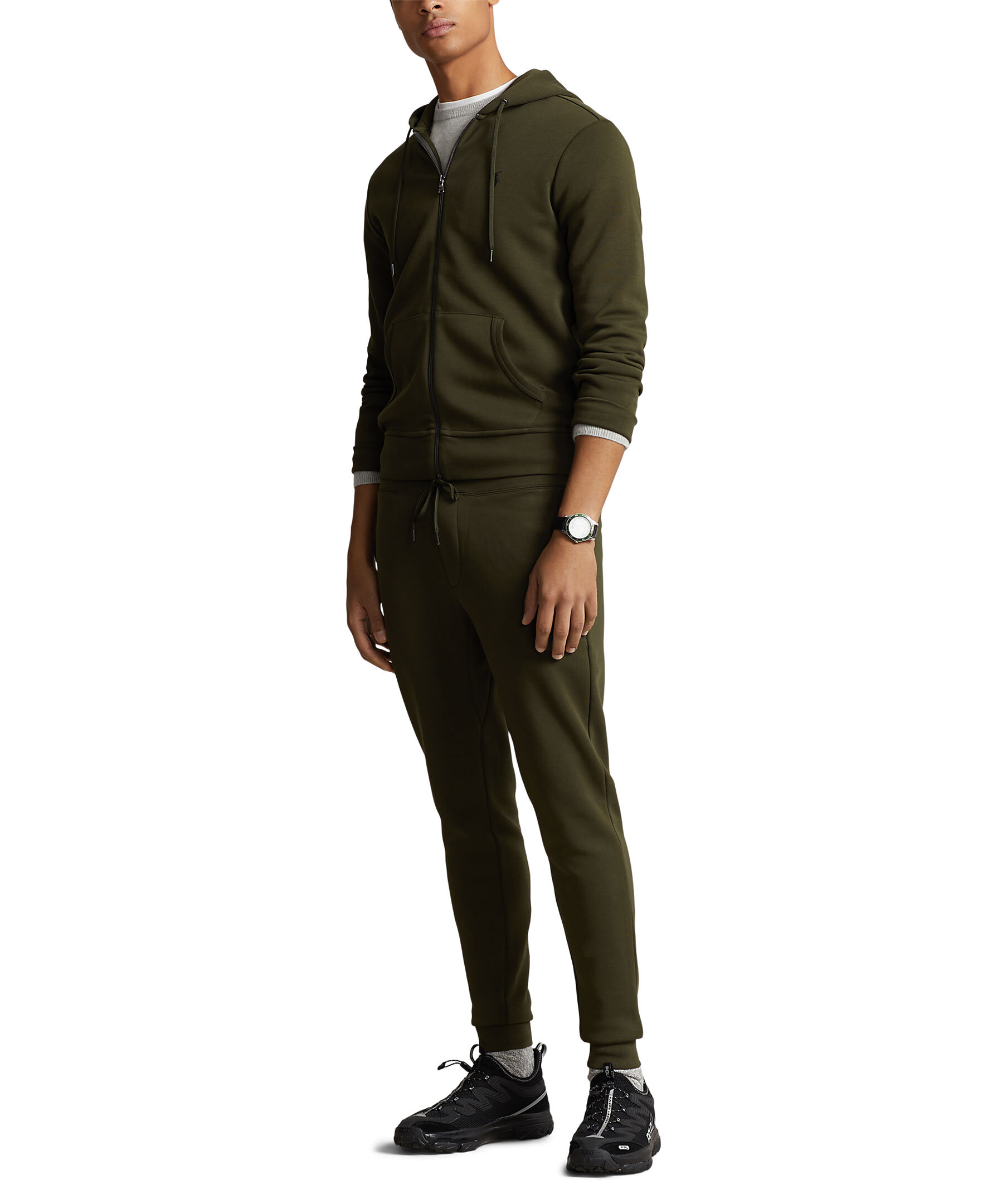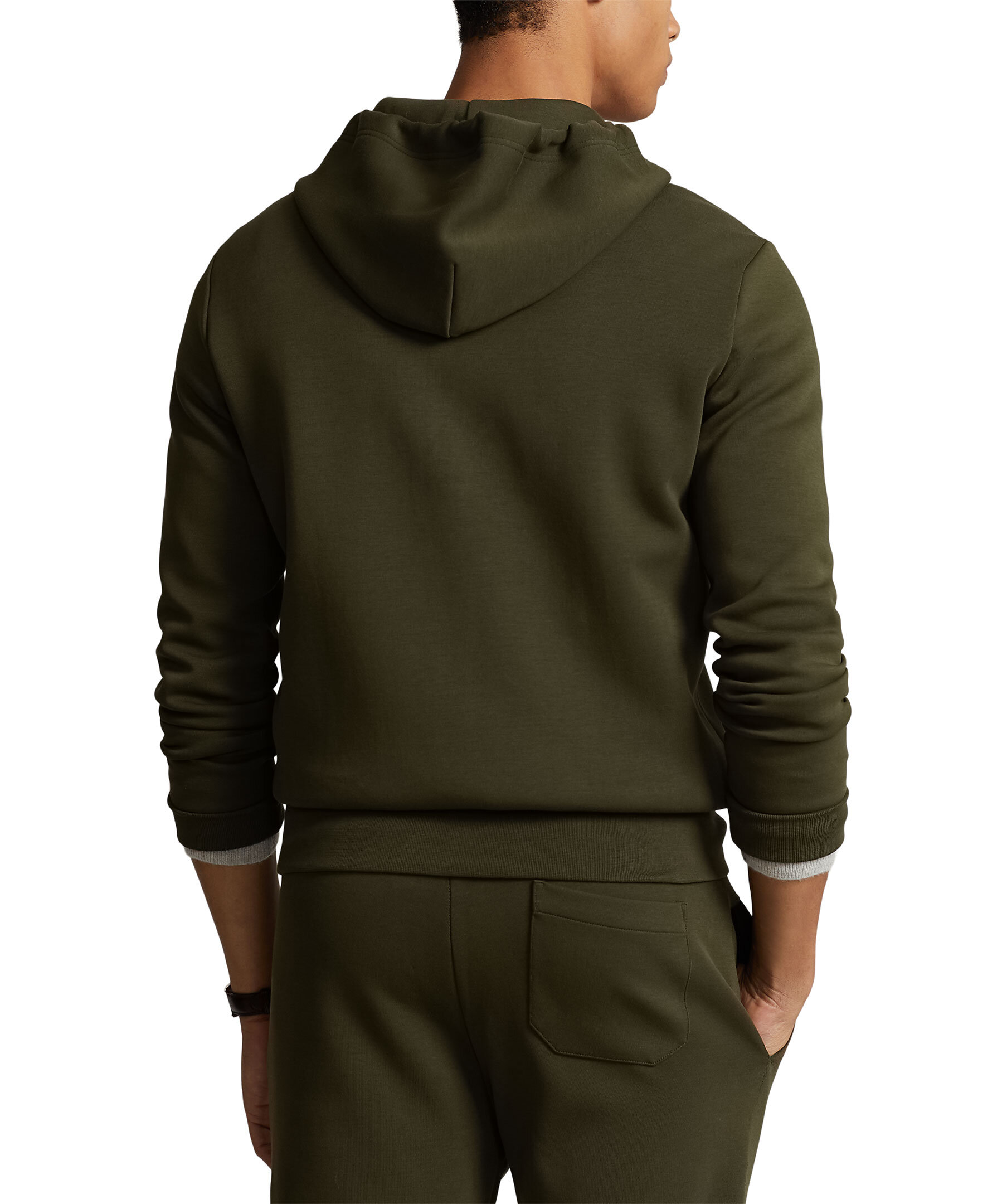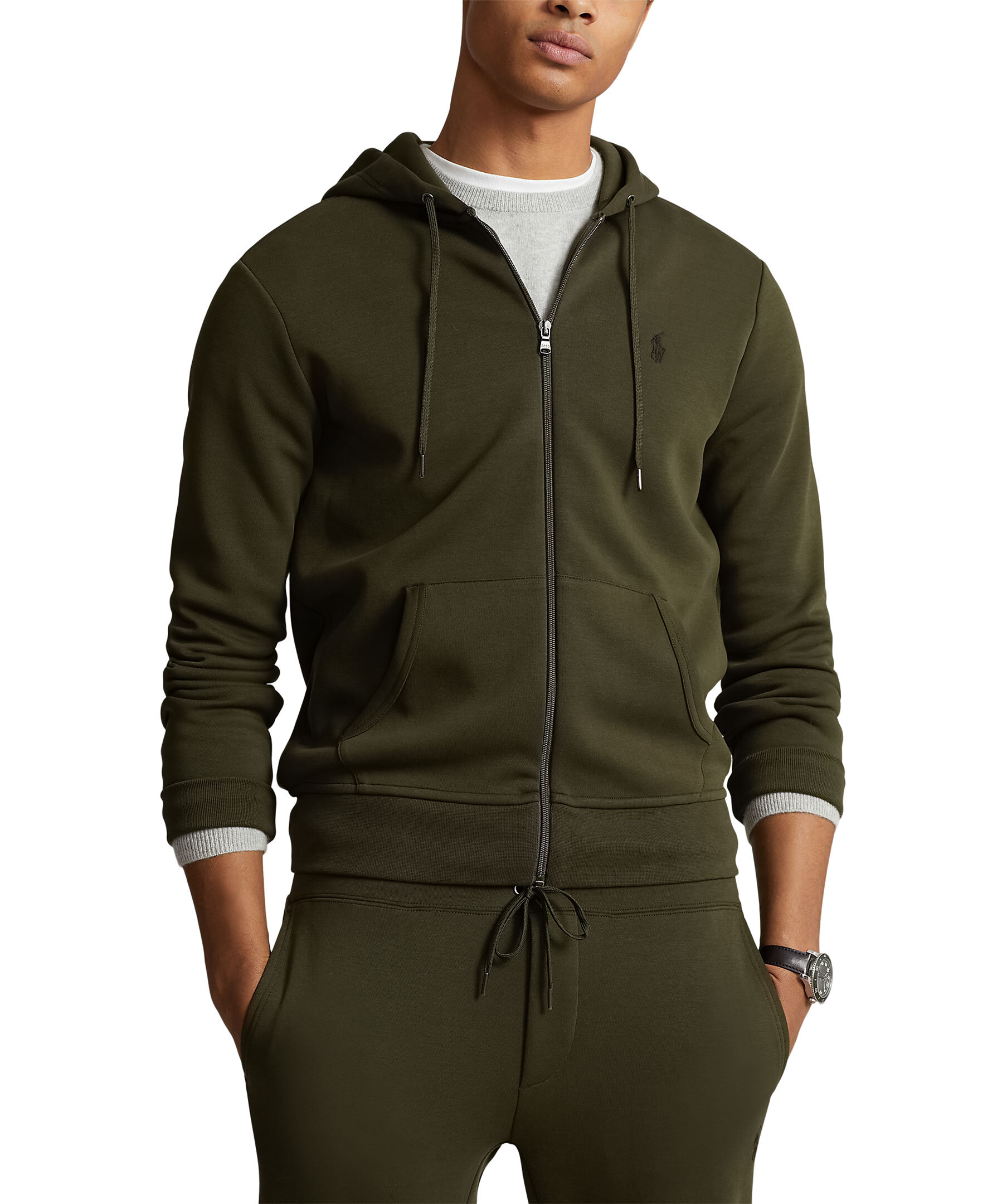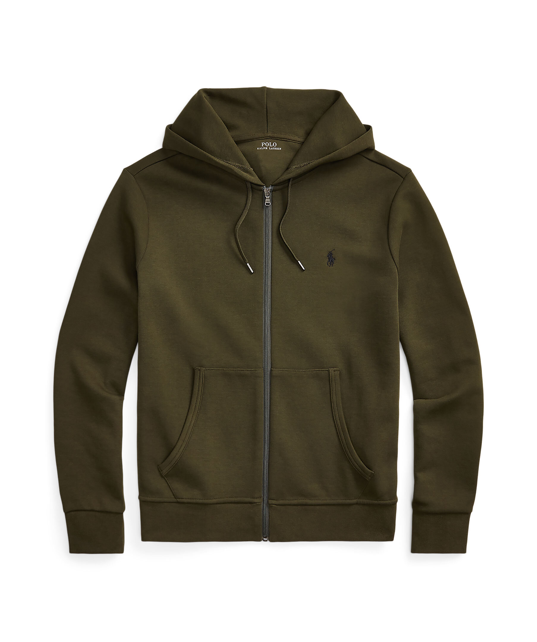 Olivgrön huvtröja med full dragkedja från Polo Ralph Lauren. Tillverkad av en slät bomullsblandning och passar lätt för joggare eller jeans. Tröjan har en liten svart broderad signaturpony på vänster sida av bröstet och två fickor. Storlek M har 68,6 cm kroppslängd, 47 cm axel, 113 cm bröst och 88,9 cm ärmlängd. Ärmlängden tas från mitten bak i nacken och byter 2,5 cm mellan storlekarna.
