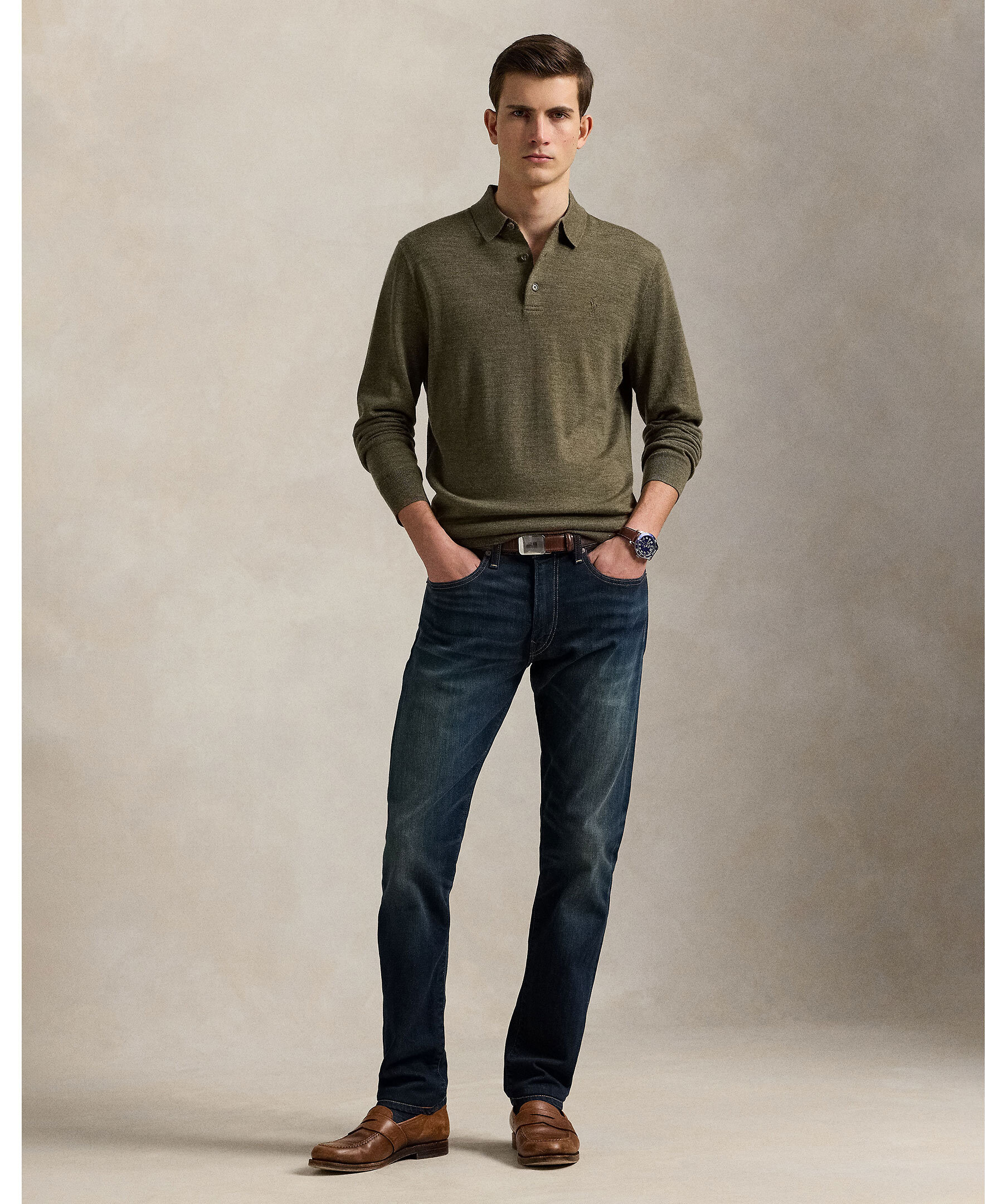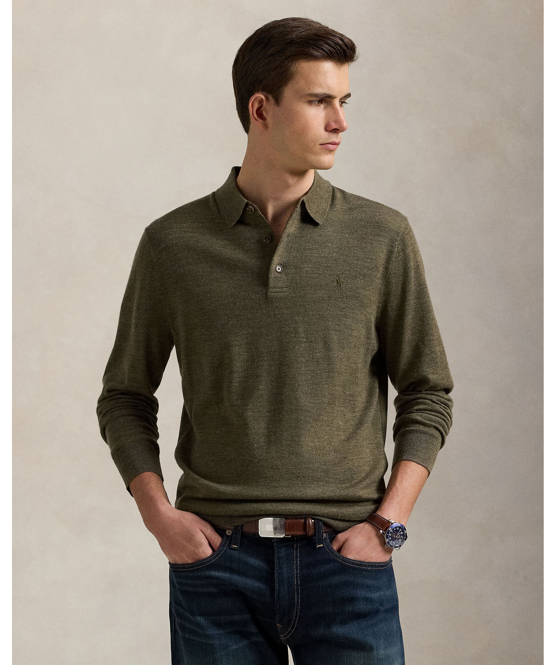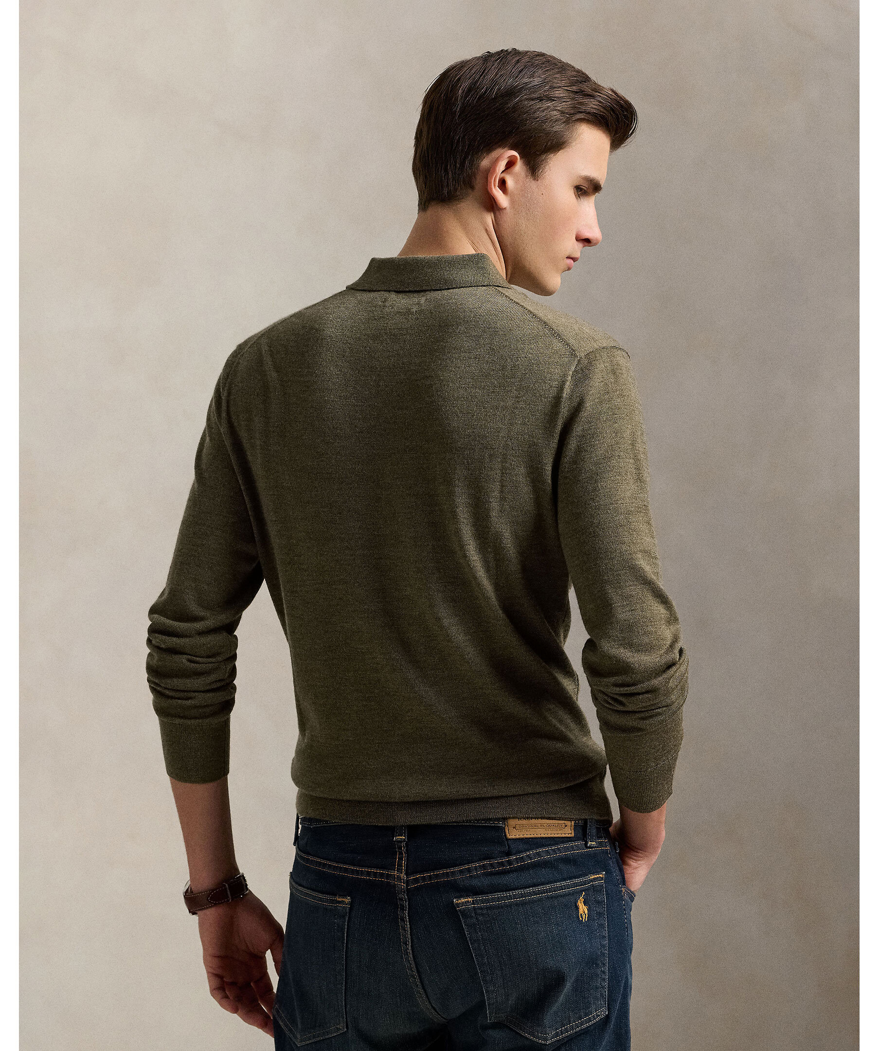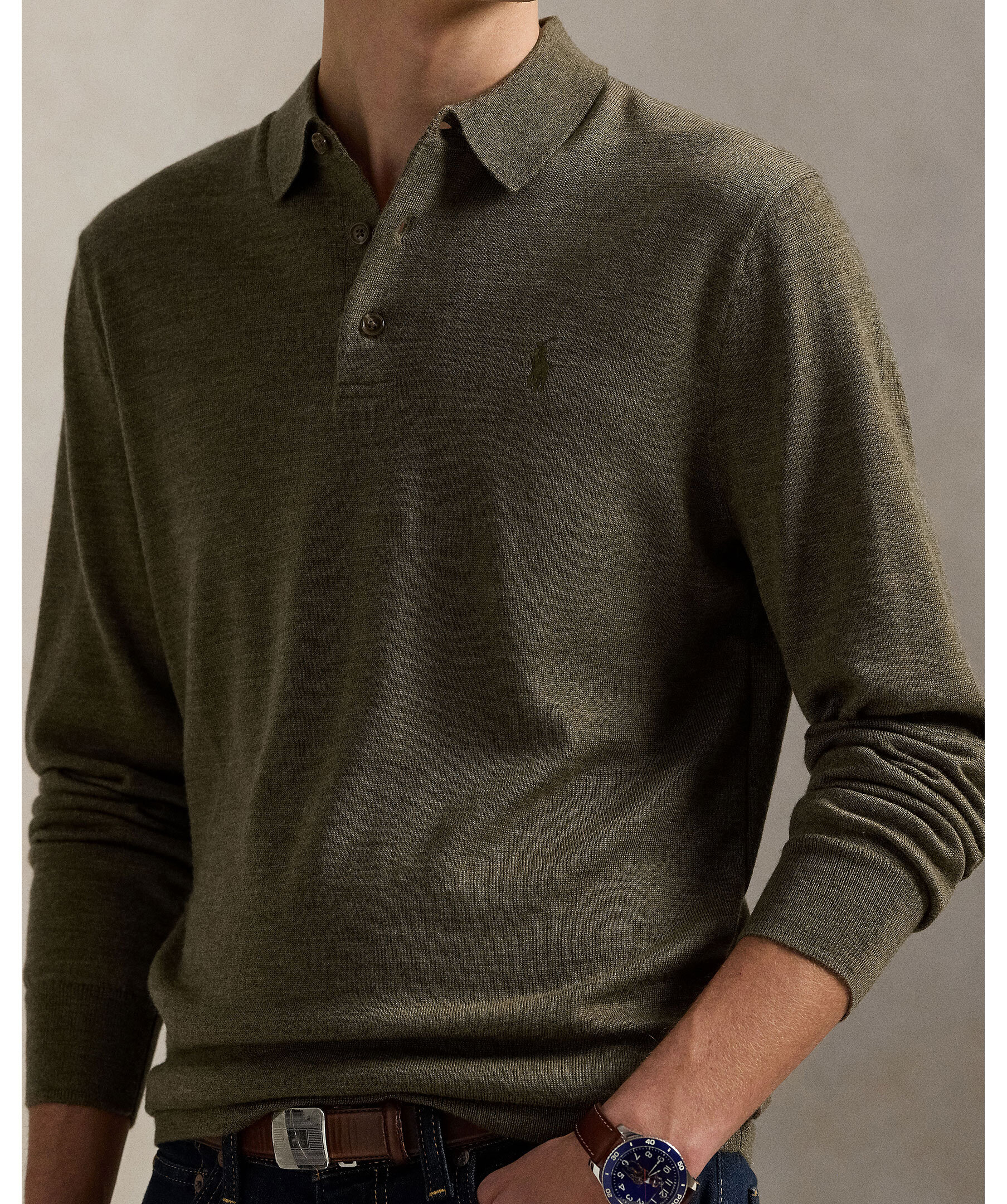 Olivgrön, finstickad tröja i ull från Polo Ralph Lauren. Inspirerad av den ikoniska Polo-skjortan. Utrustad med ribbstickad polo-krage och knappslå, och prydd med den subtila men klassiska Pony-broderingen på bröstet.