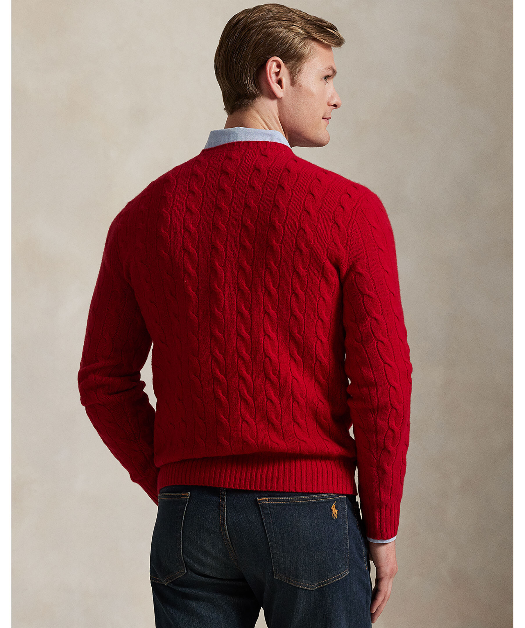Röd, kabelstickad tröja från Polo Ralph Lauren. Denna tolkning av deras ikoniska kabelstickade tröja är gjord av italienskt garn som är spunnet med ull och kashmir. Långa ärmar med ribbstickade muddar samt ribbstickad fåll. Signaturbroderad ponny på vänster bröst. Normal passform.