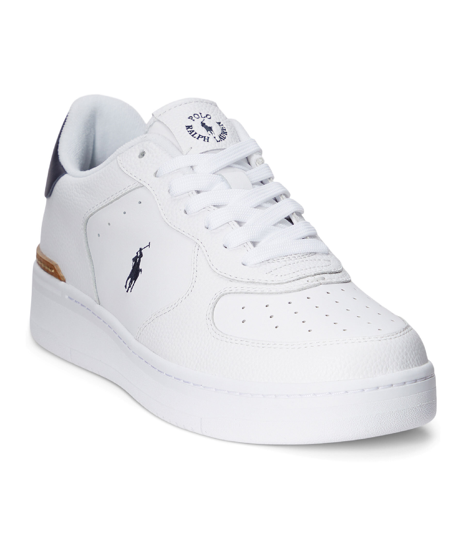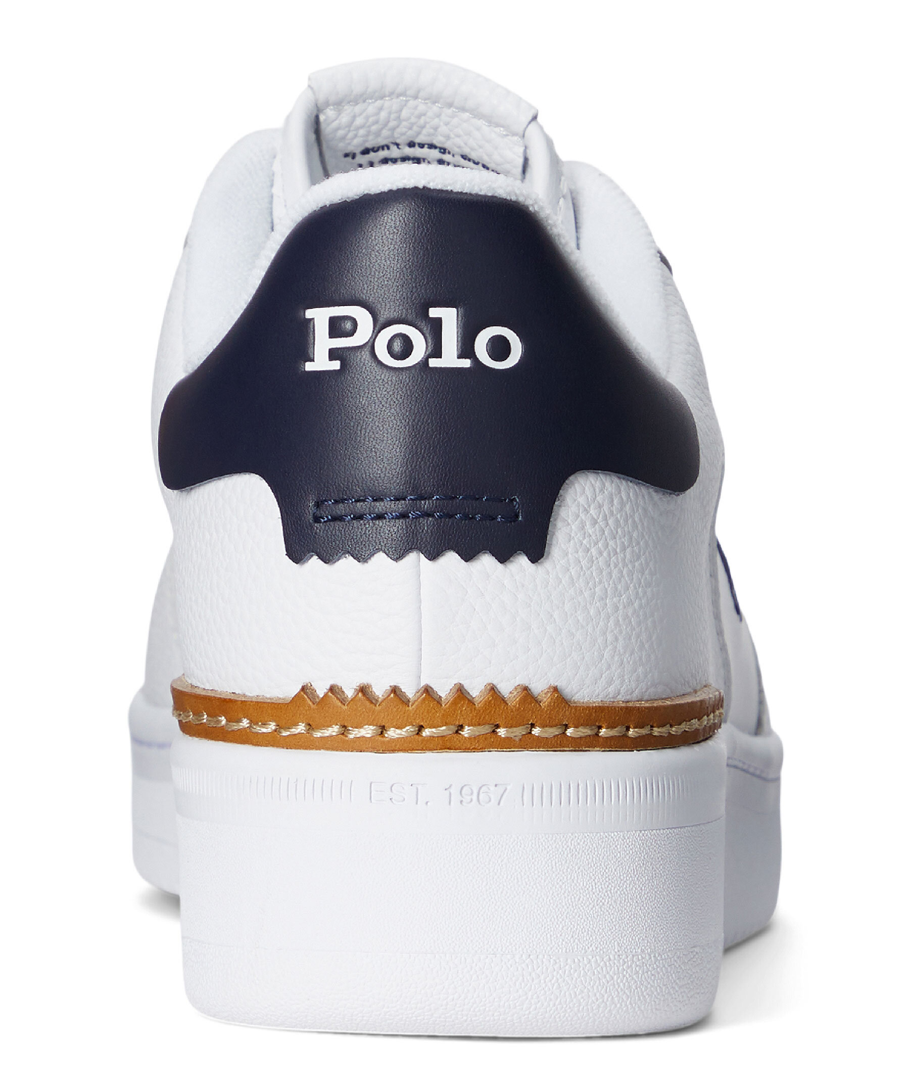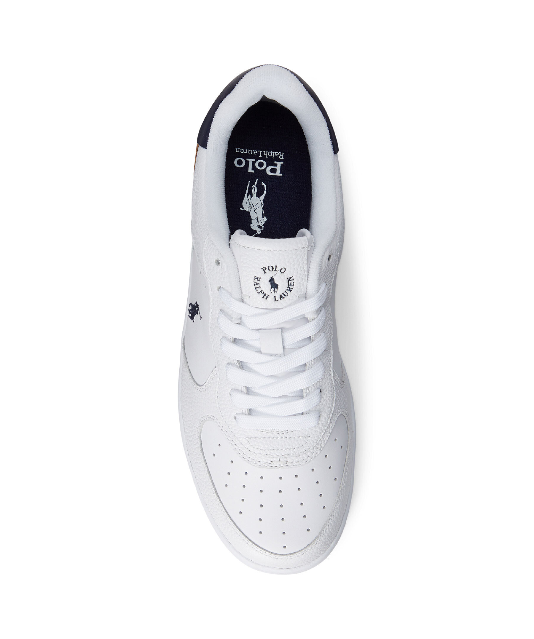 Vita sneakers i läder från Polo Ralph Lauren. Broderade logotyp på skons yttersida. Platta skosnören. Embossad patch med logotyp på plösen. Hög sula i gummi. Svart Detalj på hälen med embossad logotyp, läder färgad detalj på hälen.