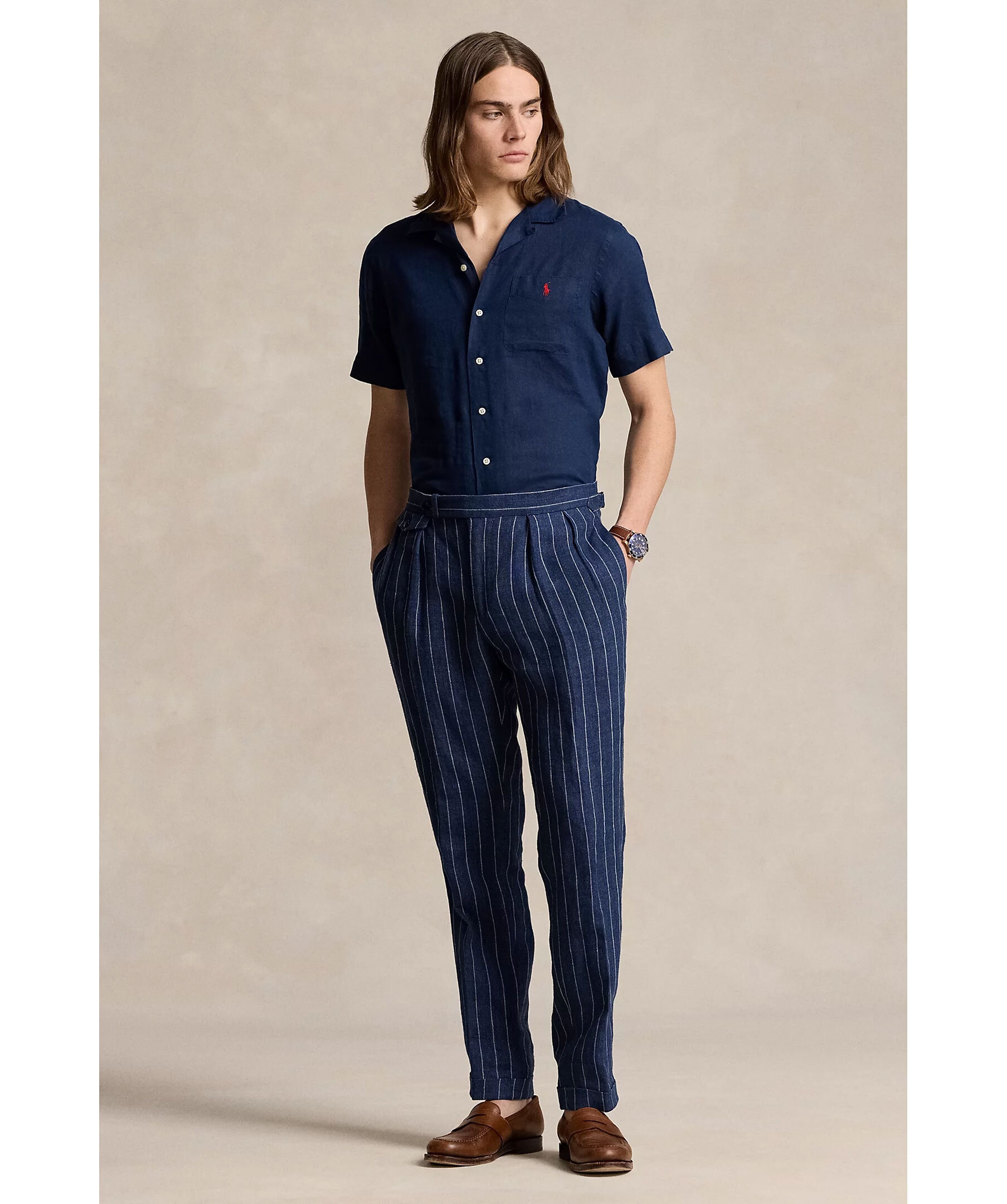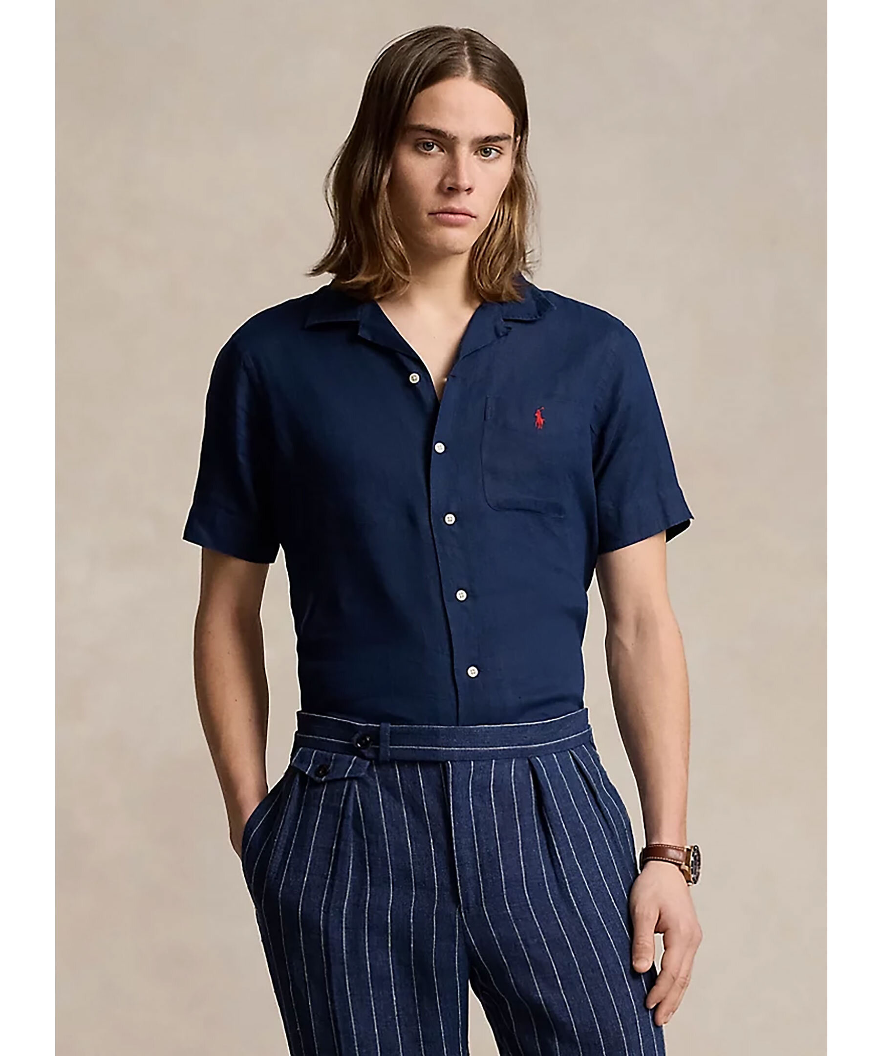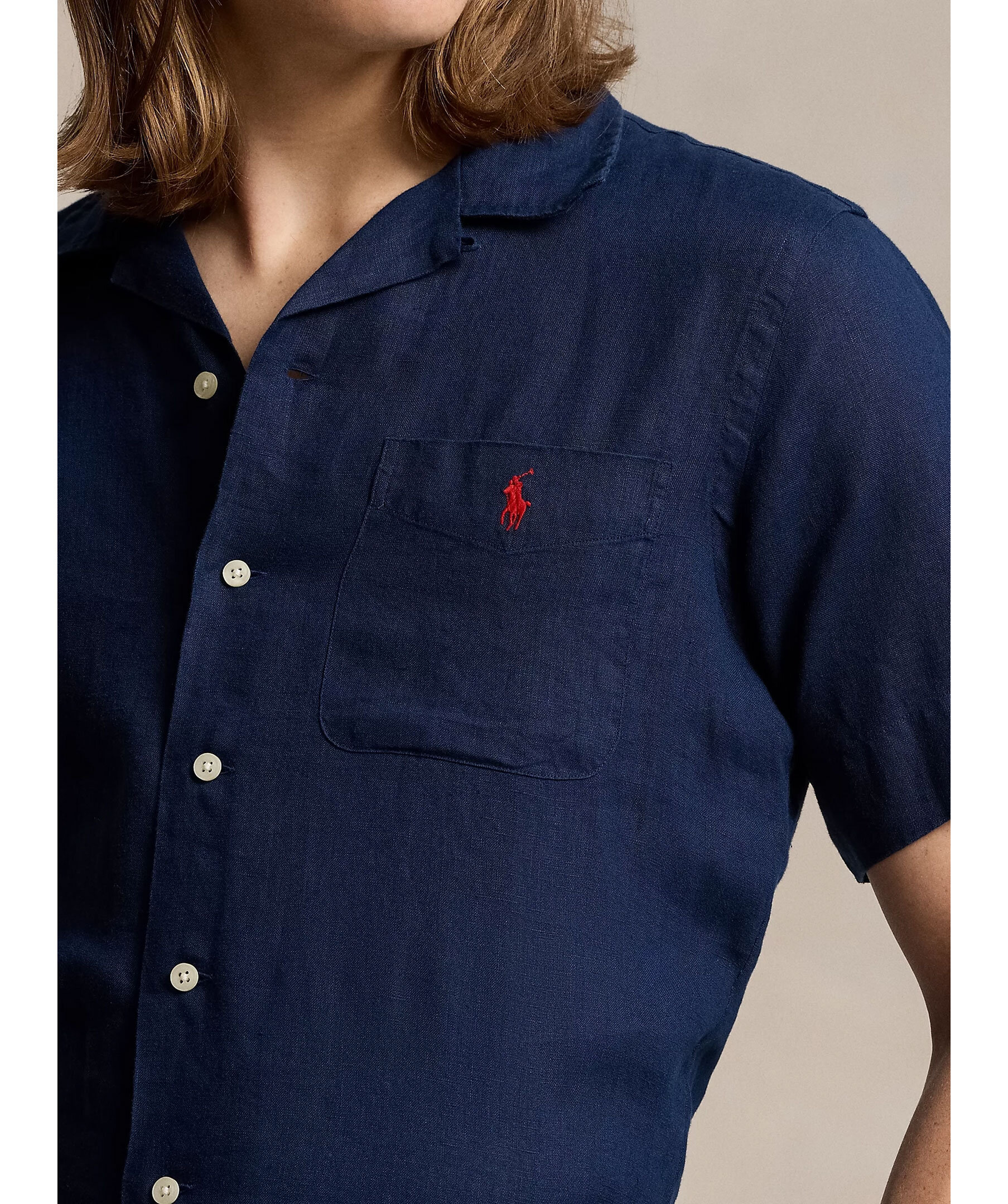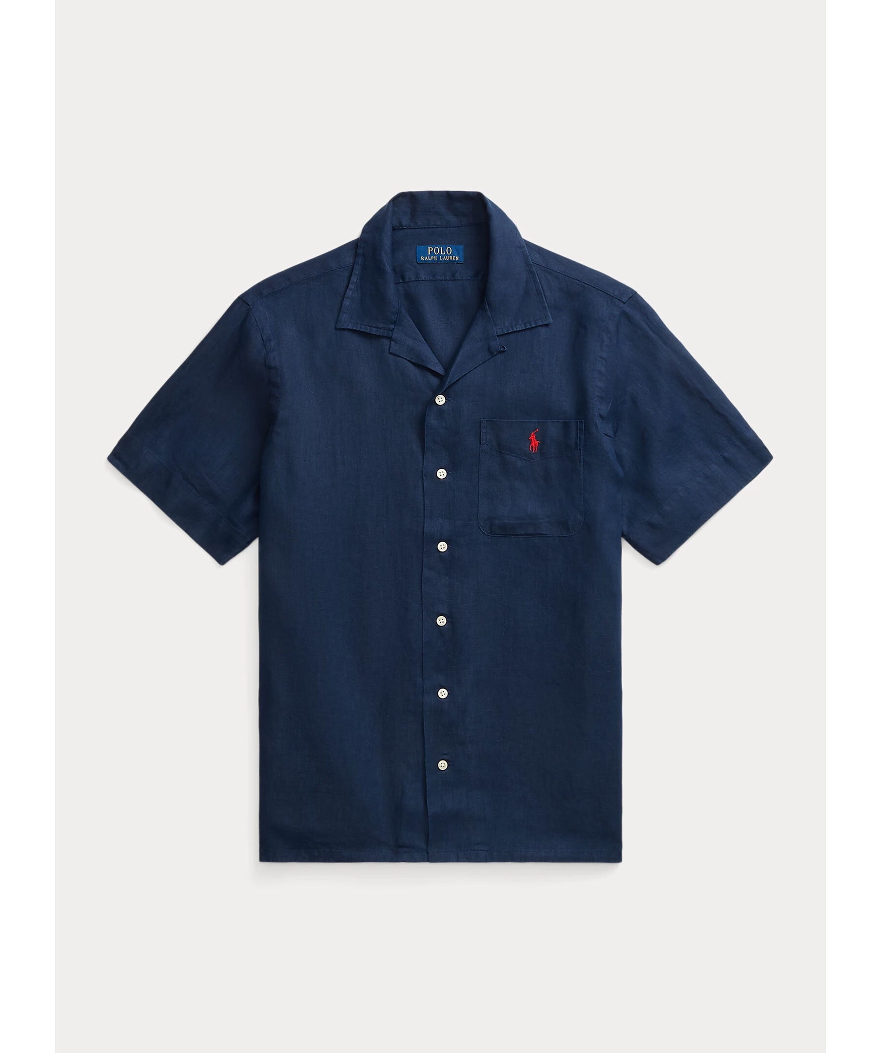 Mörkblå kortärmad skjorta från Polo Ralph Lauren. Bowlingkrage. Stängs med knappar framtill. Bröstficka med broderad logotyp i rött. Tillverkad i 100% linne.