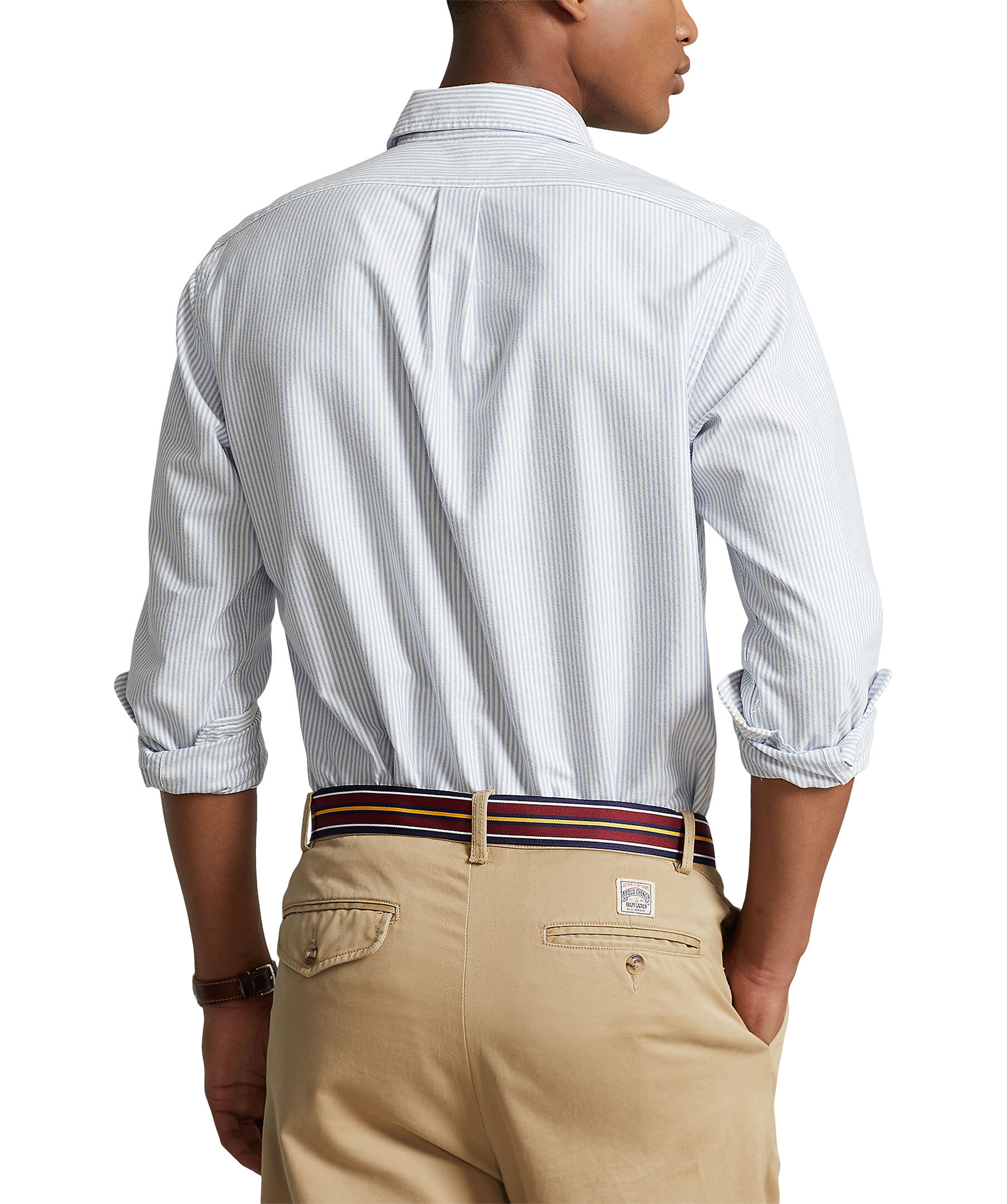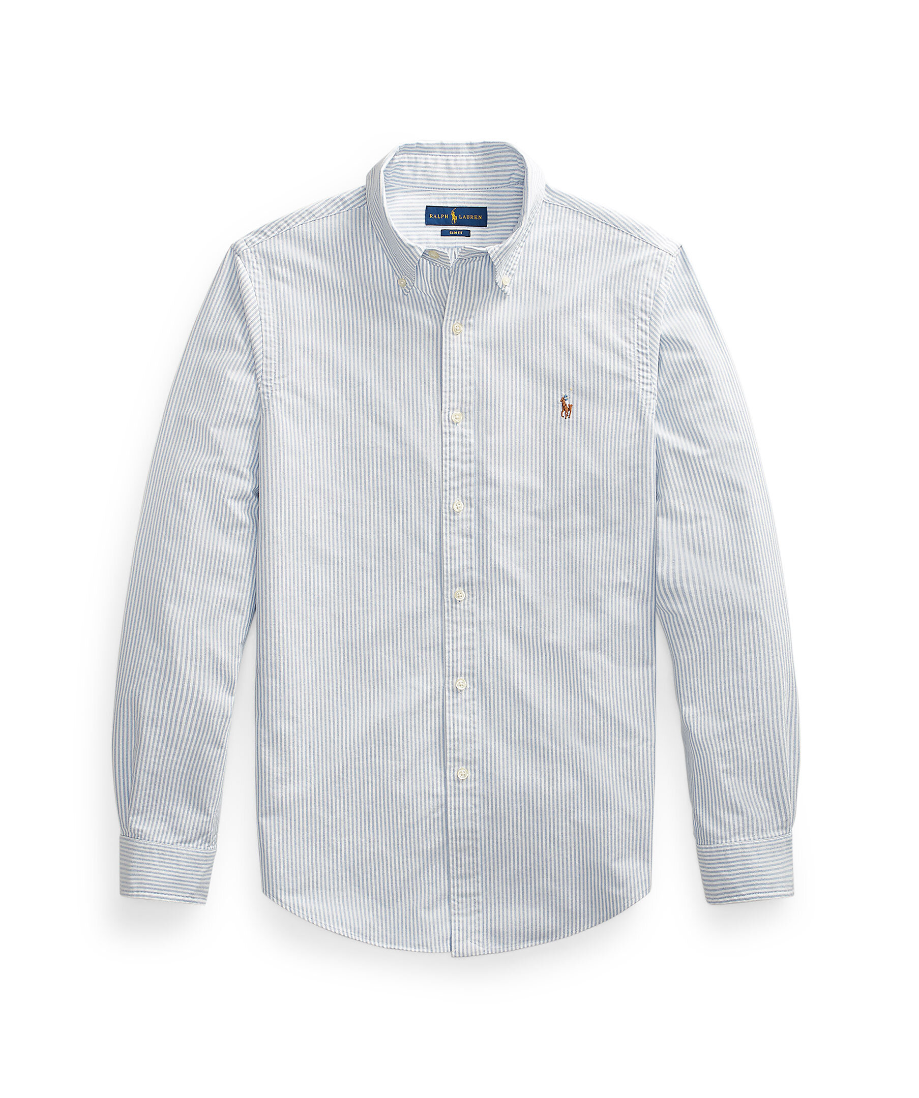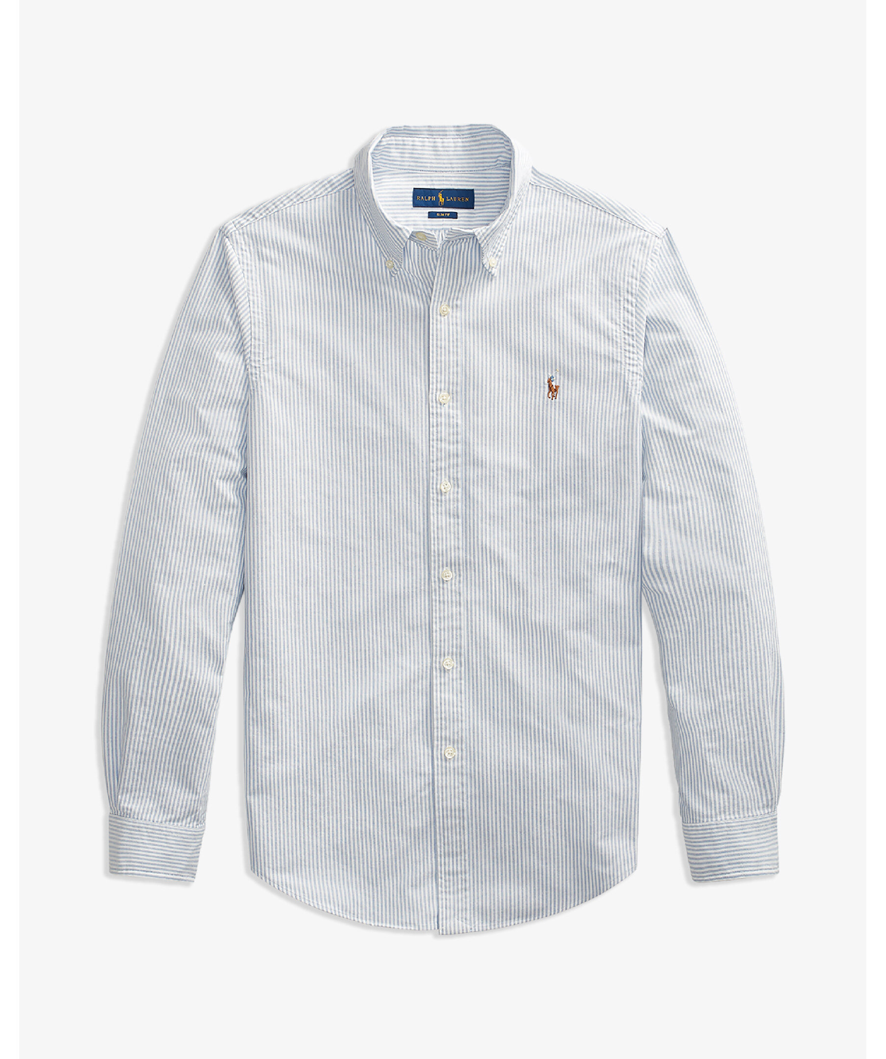 Ljusblå och vit randig oxfordskjorta från Polo Ralph Lauren i slim fit. Button-down krage. Långa ärmar med manschetter med knäppning. Delat bak ok med ett veck ger en bekväm passform och ett större rörelseomfång. Broderad signaturponny på vänster bröst. Tillverkad i bomull.