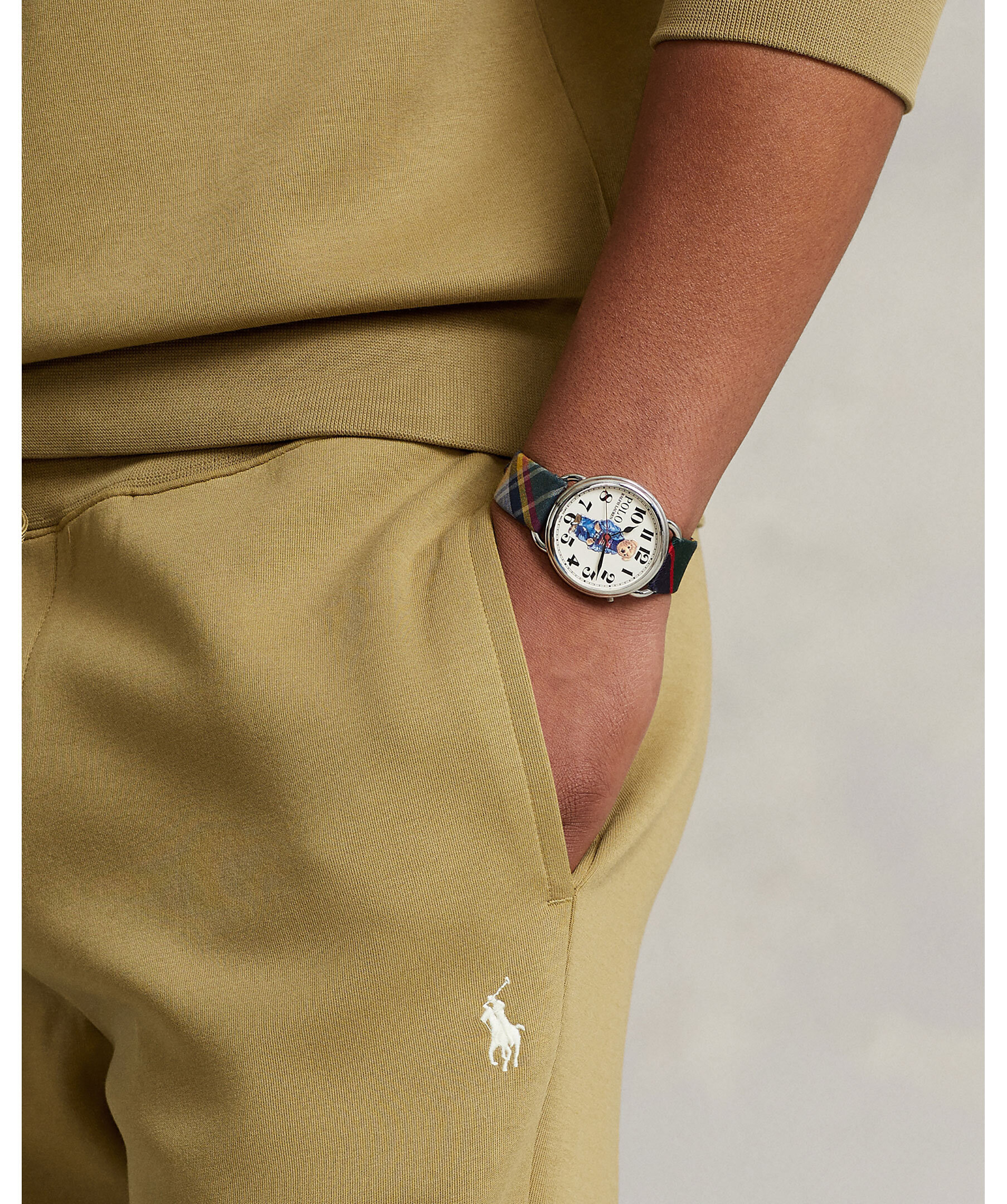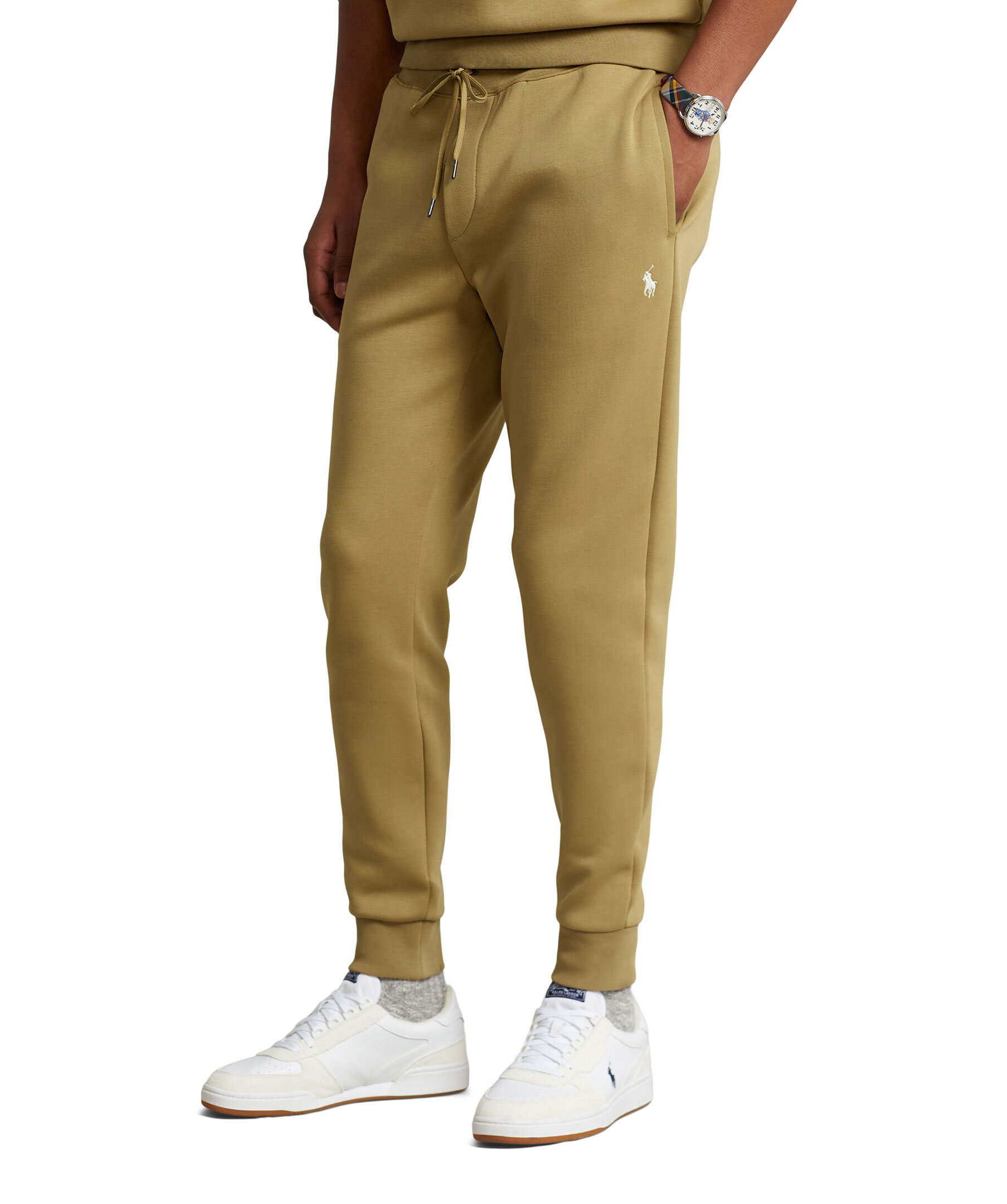 Khakifärgade mjukisbyxor från Polo Ralph Lauren. Mudd med snörning i midjan, två framfickor och en bakficka. Tillverkad i bomullsblandning och har en broderad logotyp på vänster sida under fickan.