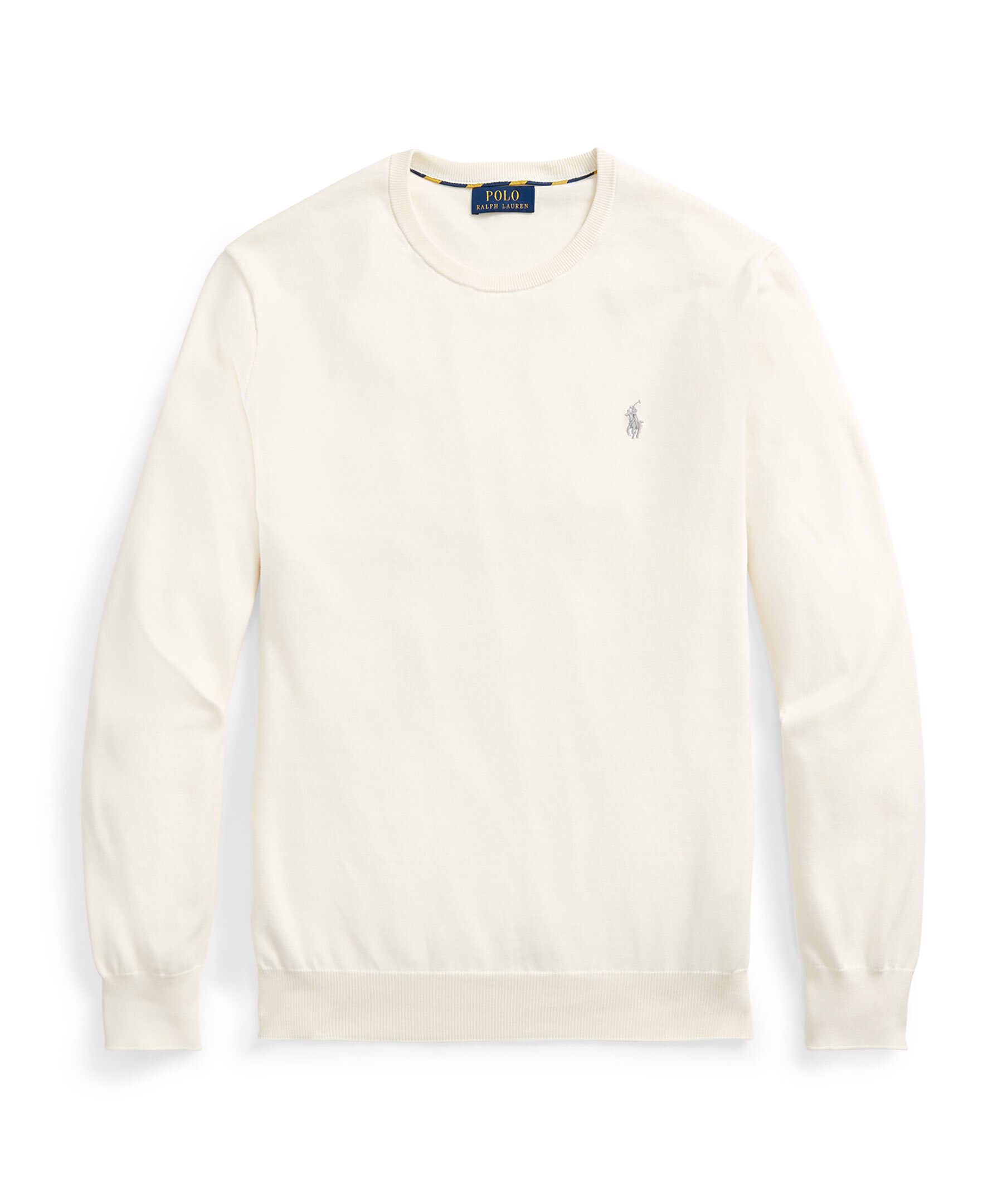 Krämvit, finstickad tröja från Polo Ralph Lauren. Grå, broderad logga på bröstet, slim fit-modell och rundad halsringning. Smal ribbad halsringning och bredare ribbade muddar i ärmslut och plaggslut. Tillverkad i 100% bomull.