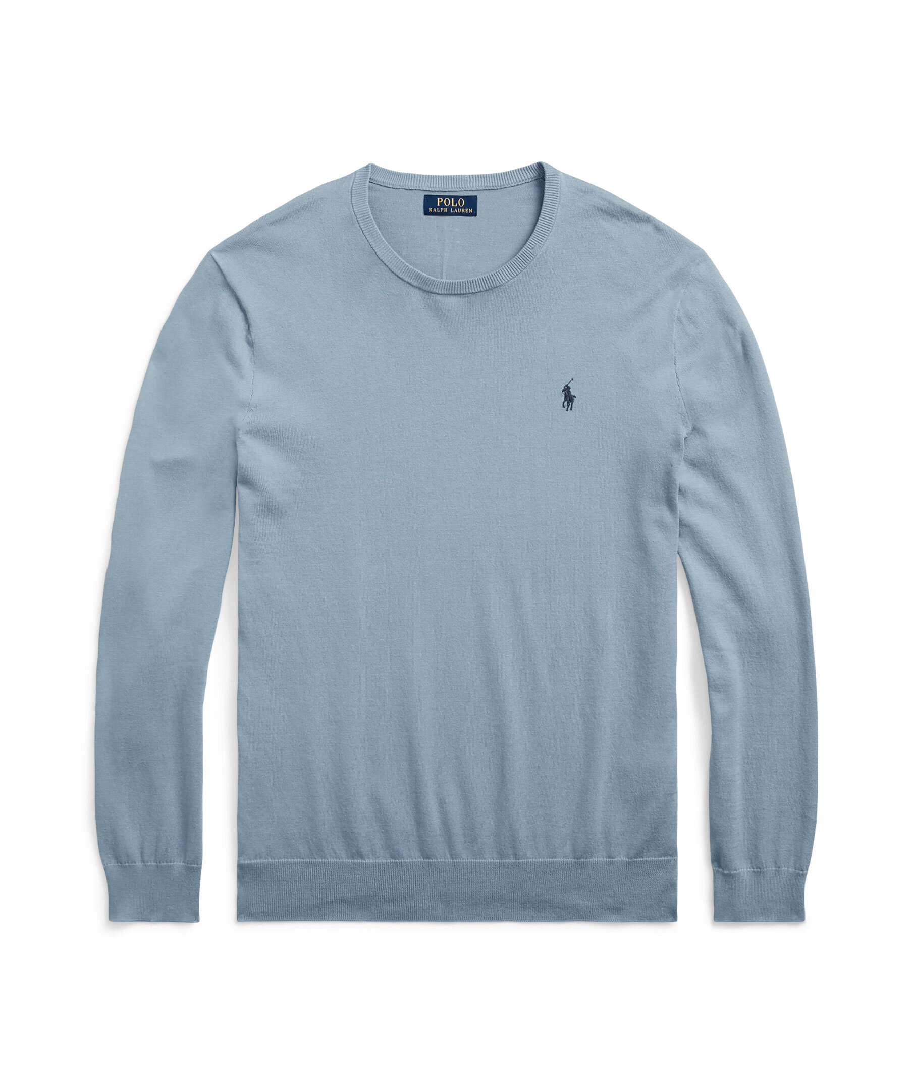 Blå finstickad pullover från Polo Ralph Lauren gjord i mjuk bomull. Mudd vid halsringen, ärm och plaggslut. Broderad logotyp på bröstet. Slim fit passform.