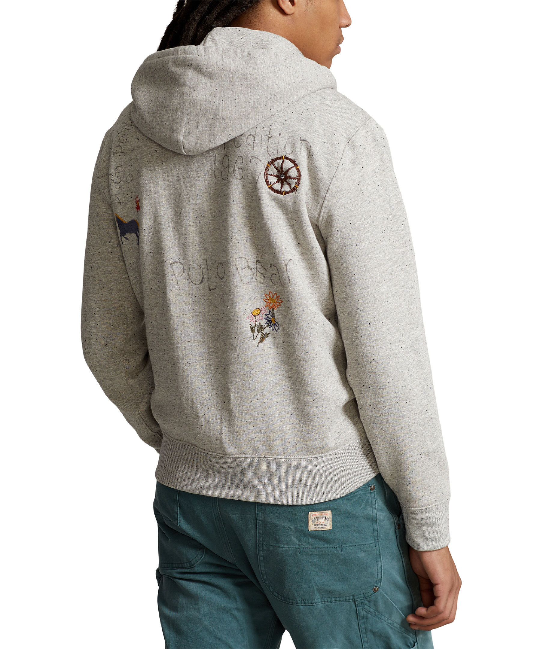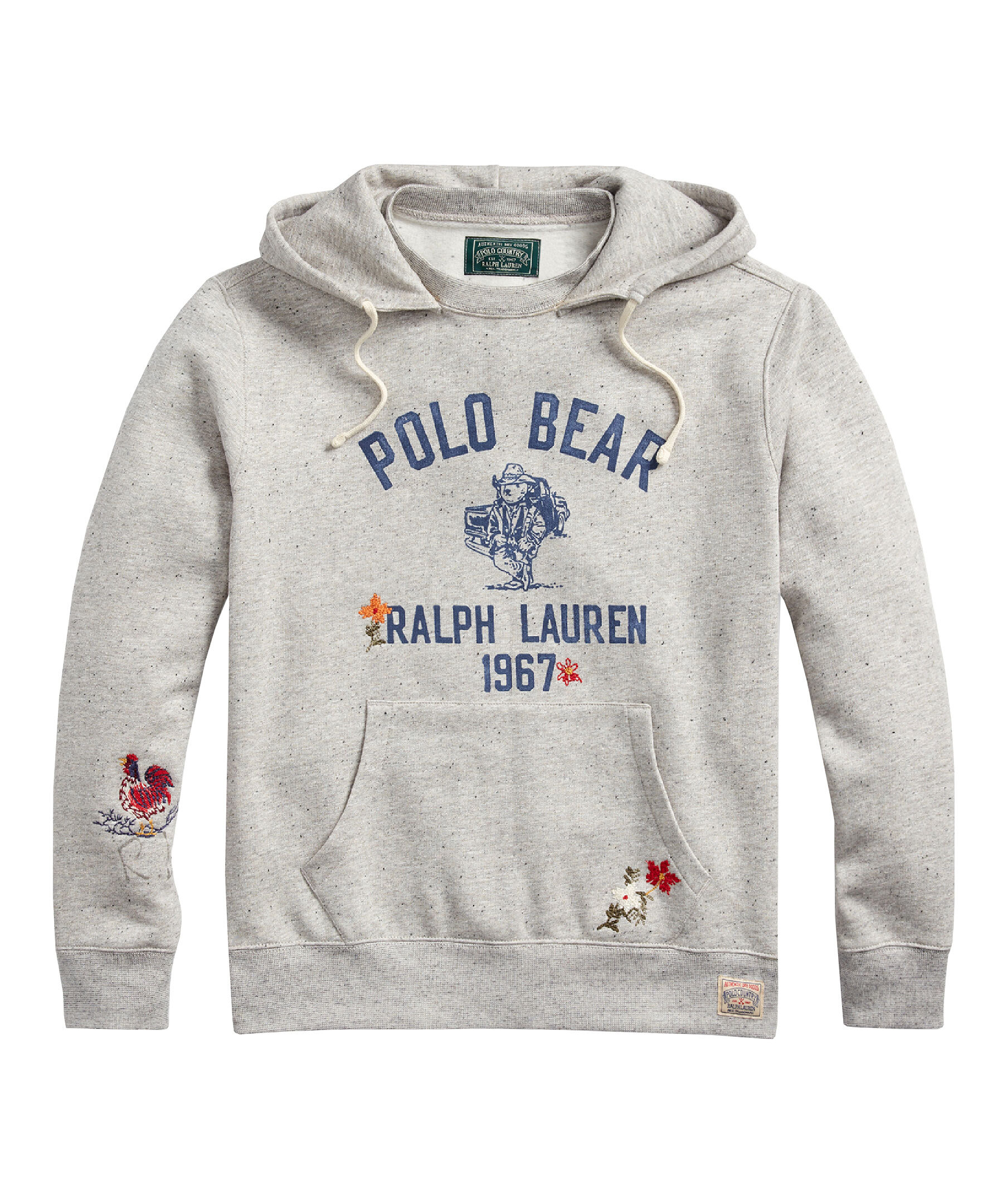 Gråmelerad hoodie från Polo Ralph Lauren. Tillverkad i en mjuk bomullsblandning med borstad insida. Tröjan har en luva med snörning och känguru ficka på magen. Marinblått tryck med nalle och logotyp över framsidan och broderade blommor i olika färger spridda över hela tröjan. Muddar i ärmslut och plaggslut.