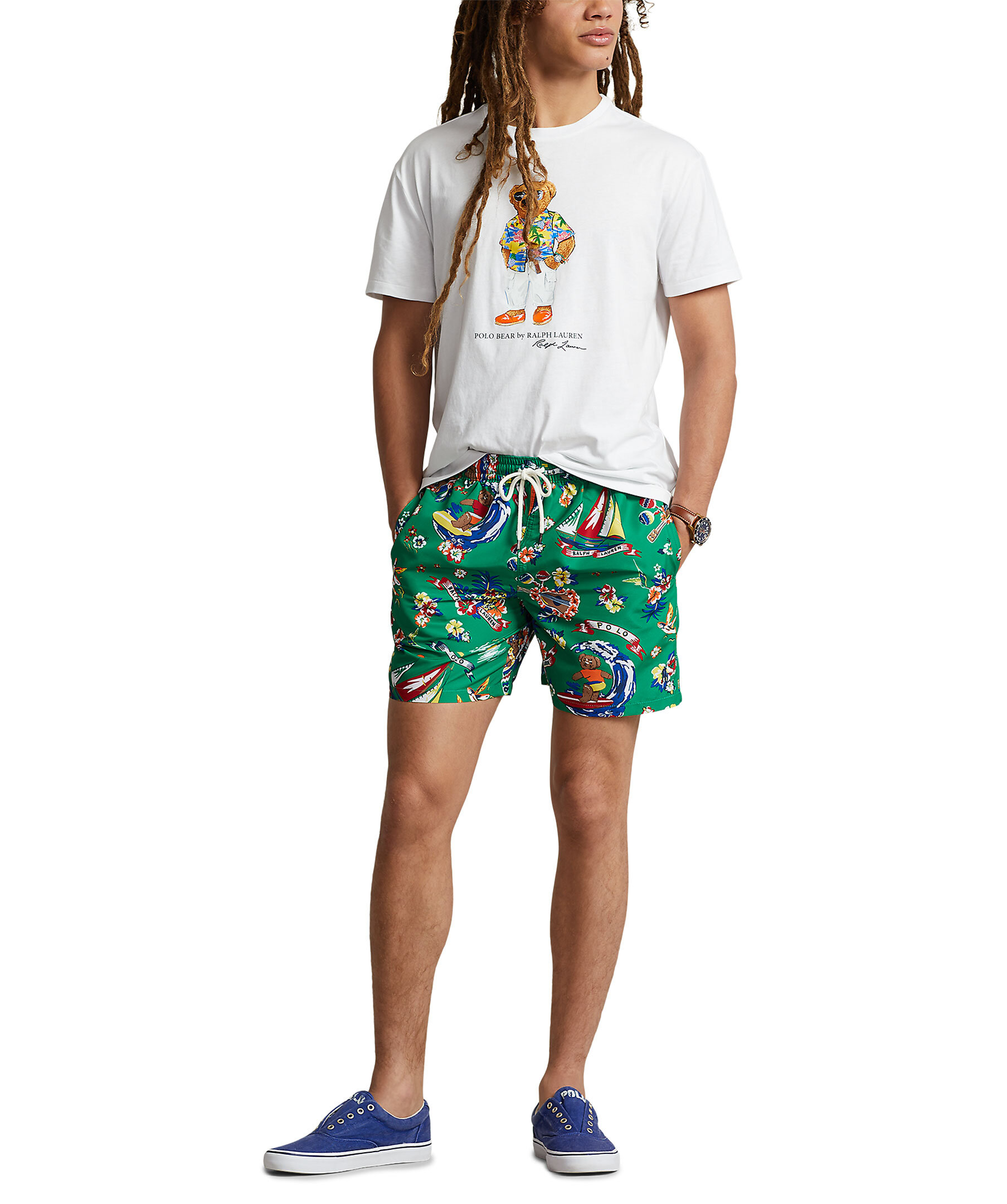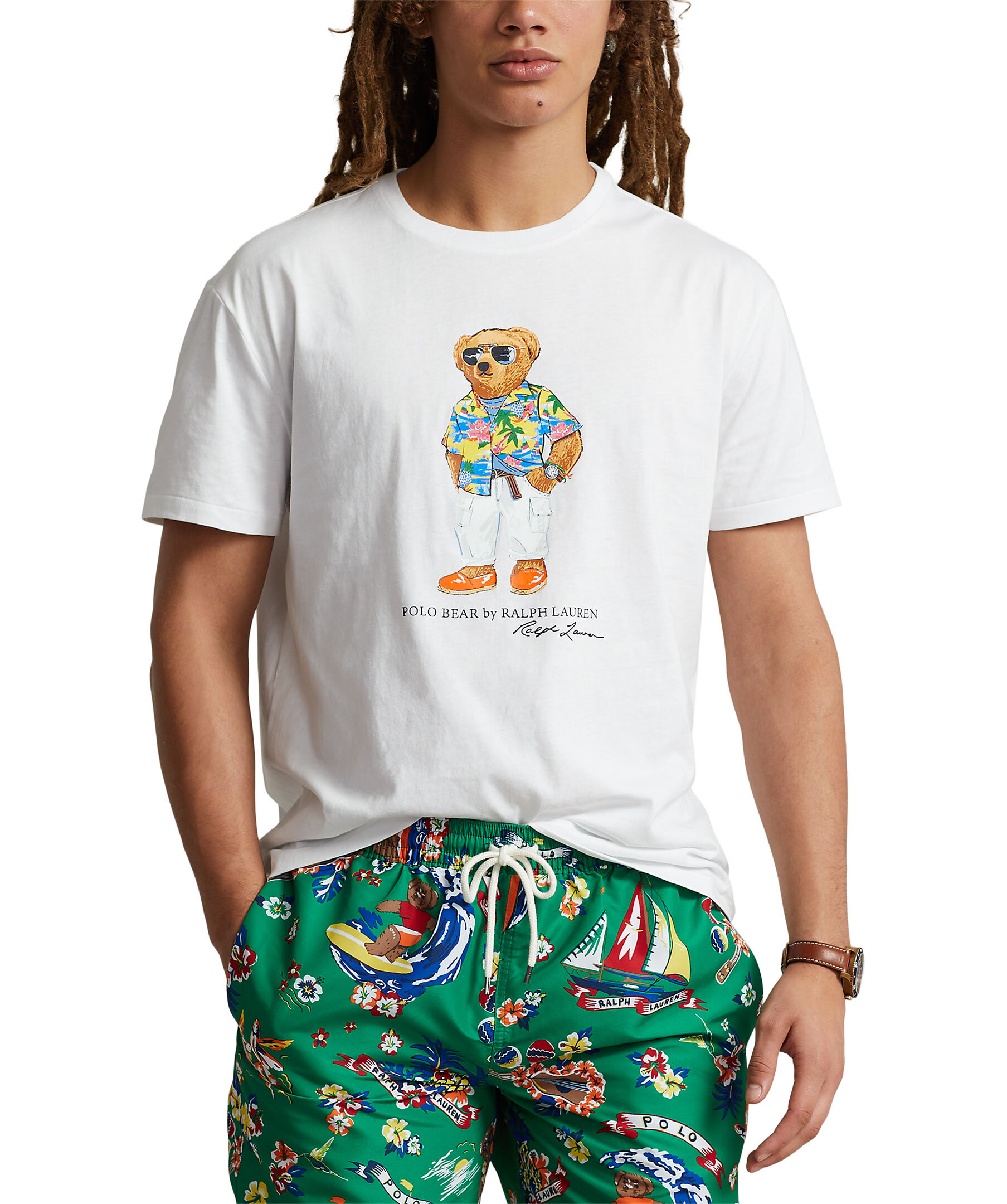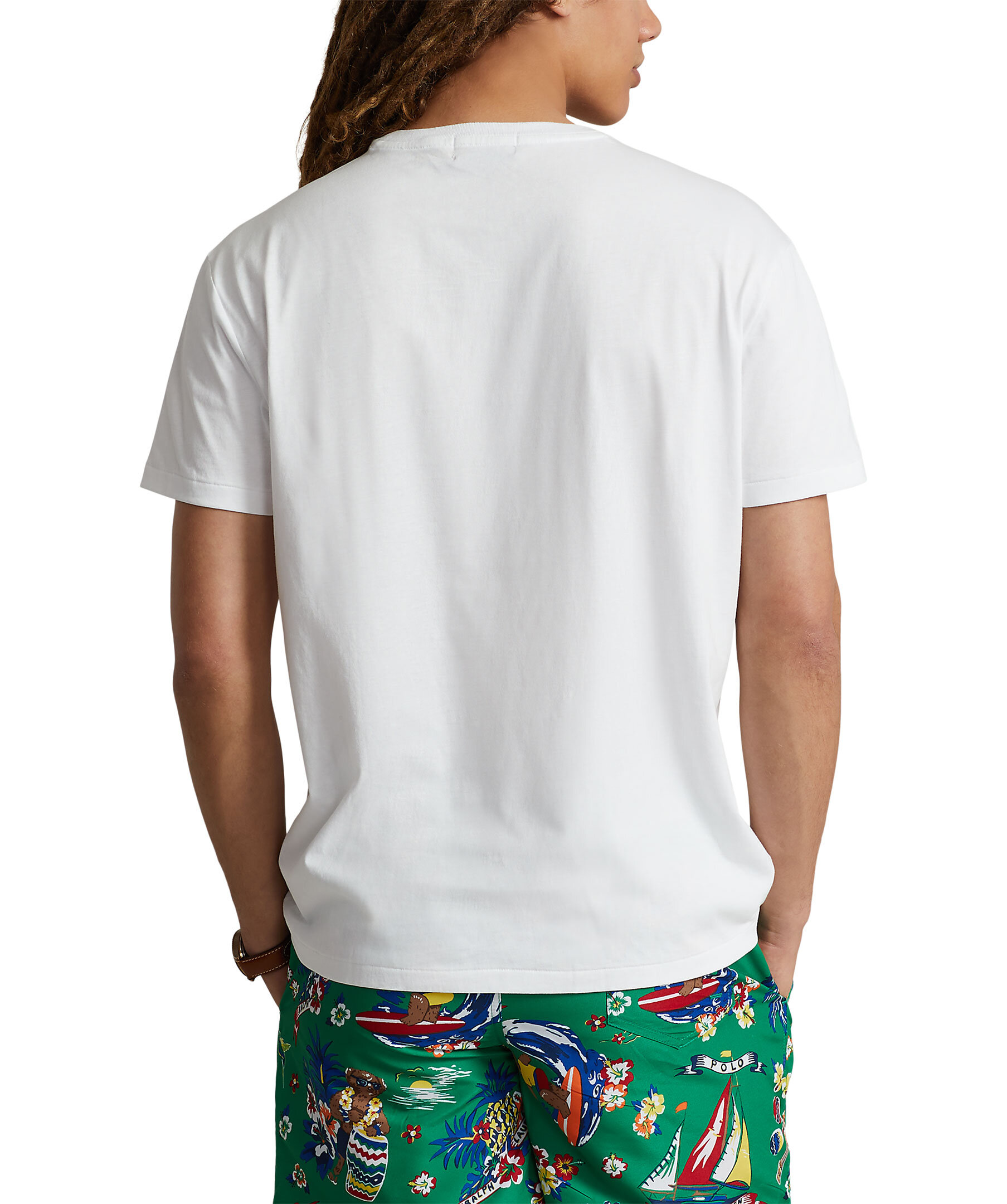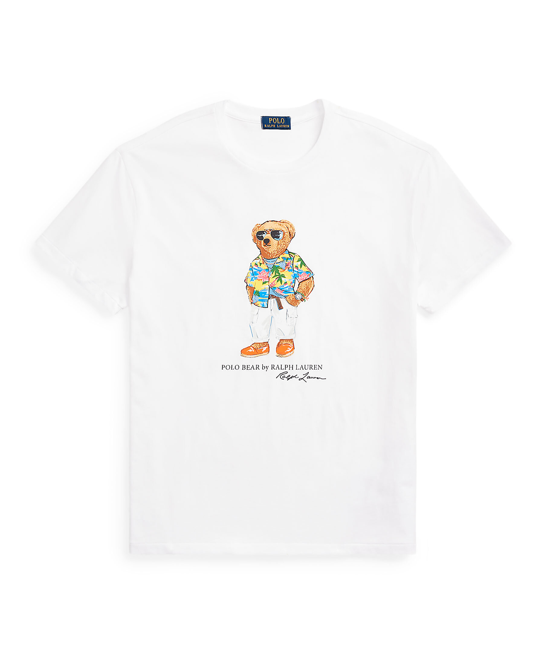 Vit T-shirt från Polo Ralph Lauren med tryck på framsidan. Trycket är deras maskot, världens bäst klädda björn. Polo Bear, "Polo Bear by Ralph Lauren" och "Ralph Lauren" tryckta på mitten fram. T-shirten har normal passform och är tillverkad av 100% bomull. Storlek M har en kroppslängd på 72,4 cm (fram och bak), 50,8 cm axel och 111,8 cm bröst.