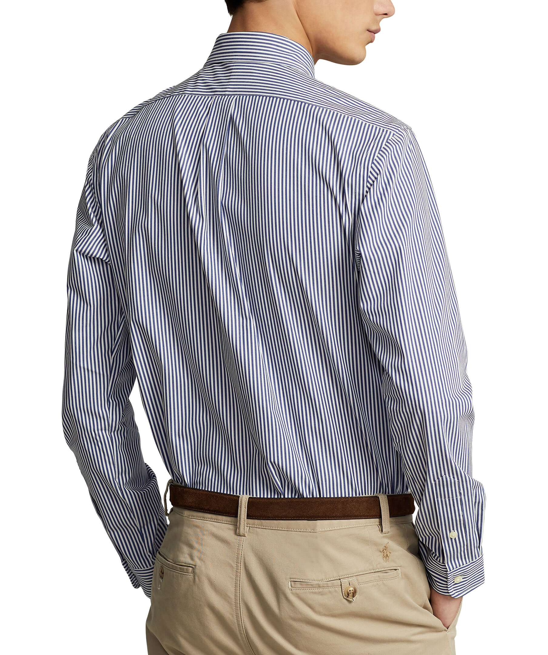 Blå/vit randig skjorta från Polo Ralph Lauren. Button down krage, custom fit, blå broderad logga på bröstet. Modellen är 185 cm lång och bär storlek medium.
