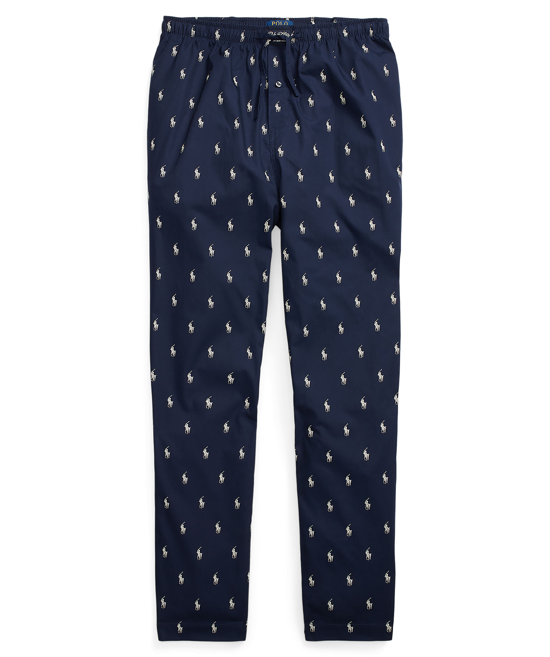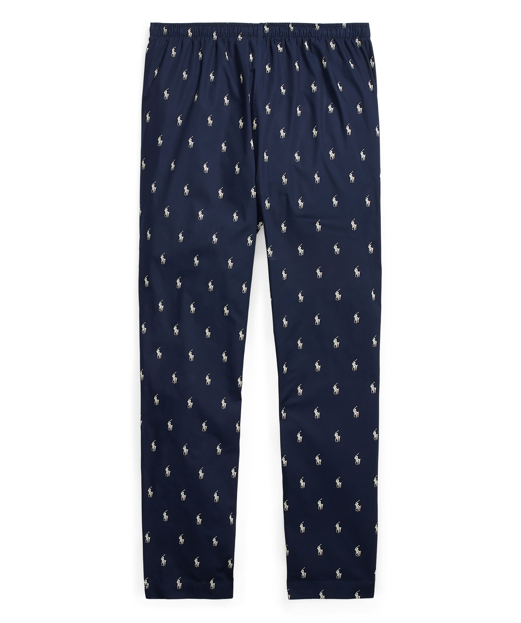 Marinblåa pyjamasbyxor från Polo Ralph Lauren. Tillverkade i 100% bomull och har ett genomgående logotyptryck över hela byxorna. Resår och snörning i midjan samt en knapp vid gylf. Två sidfickor.