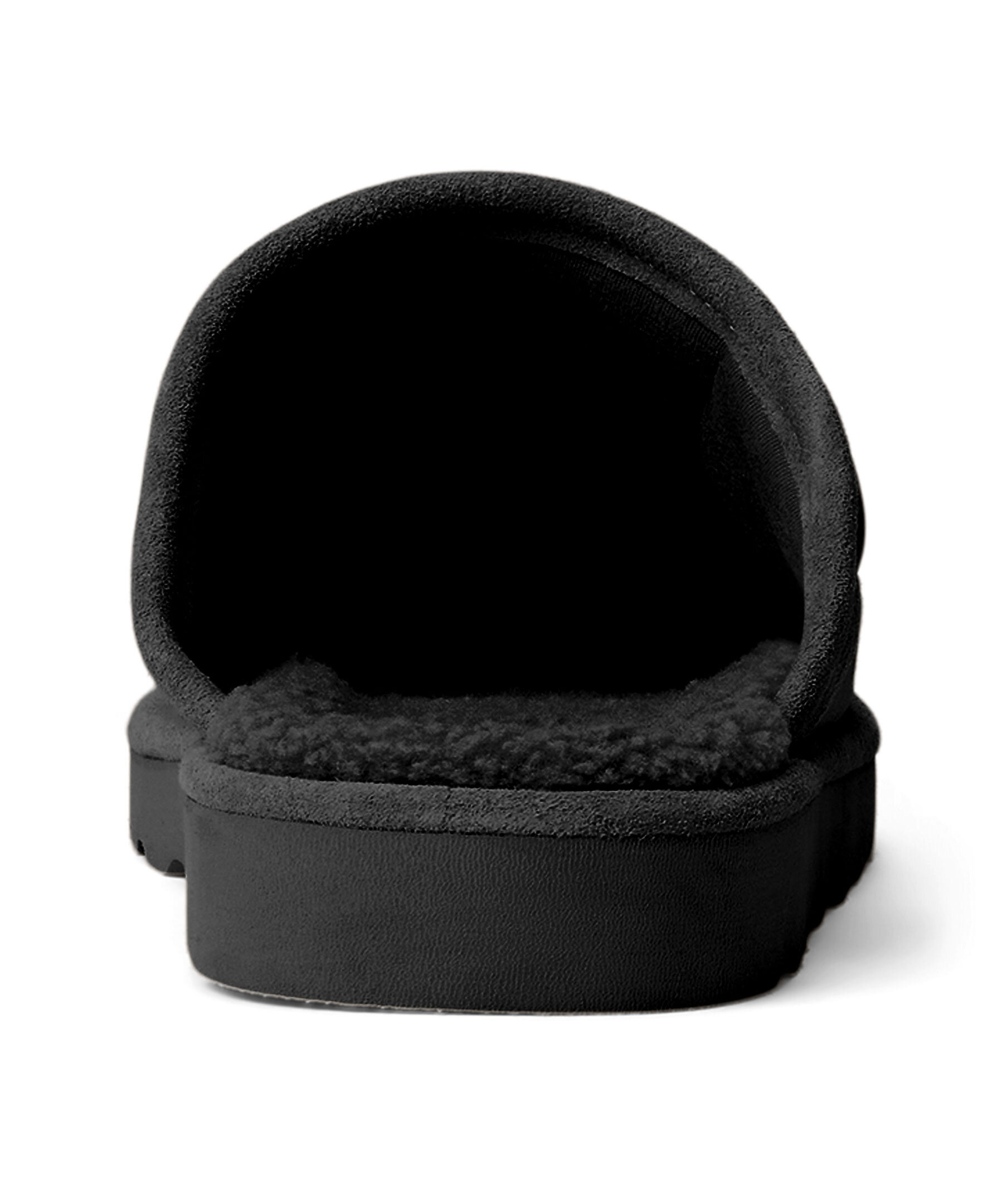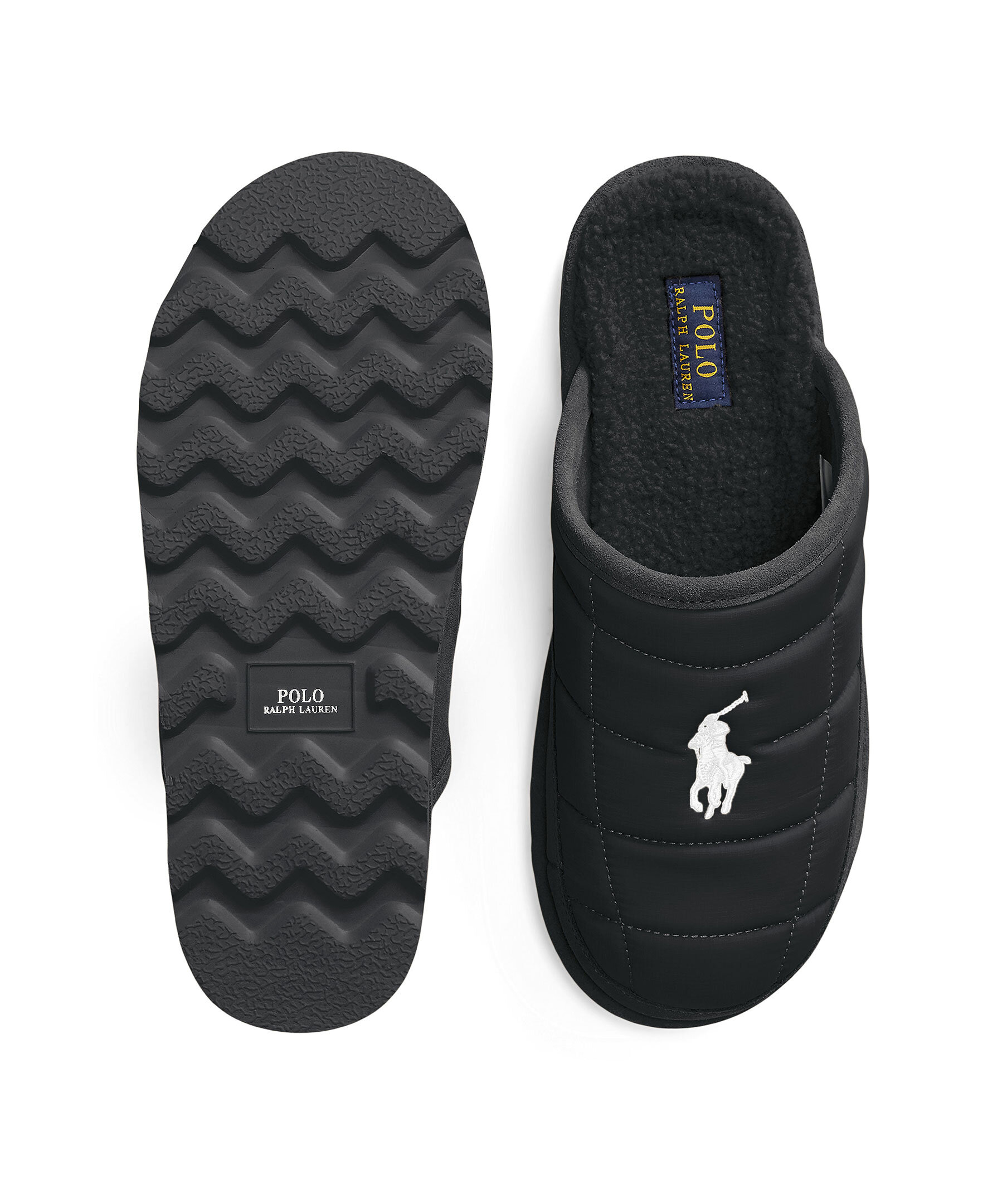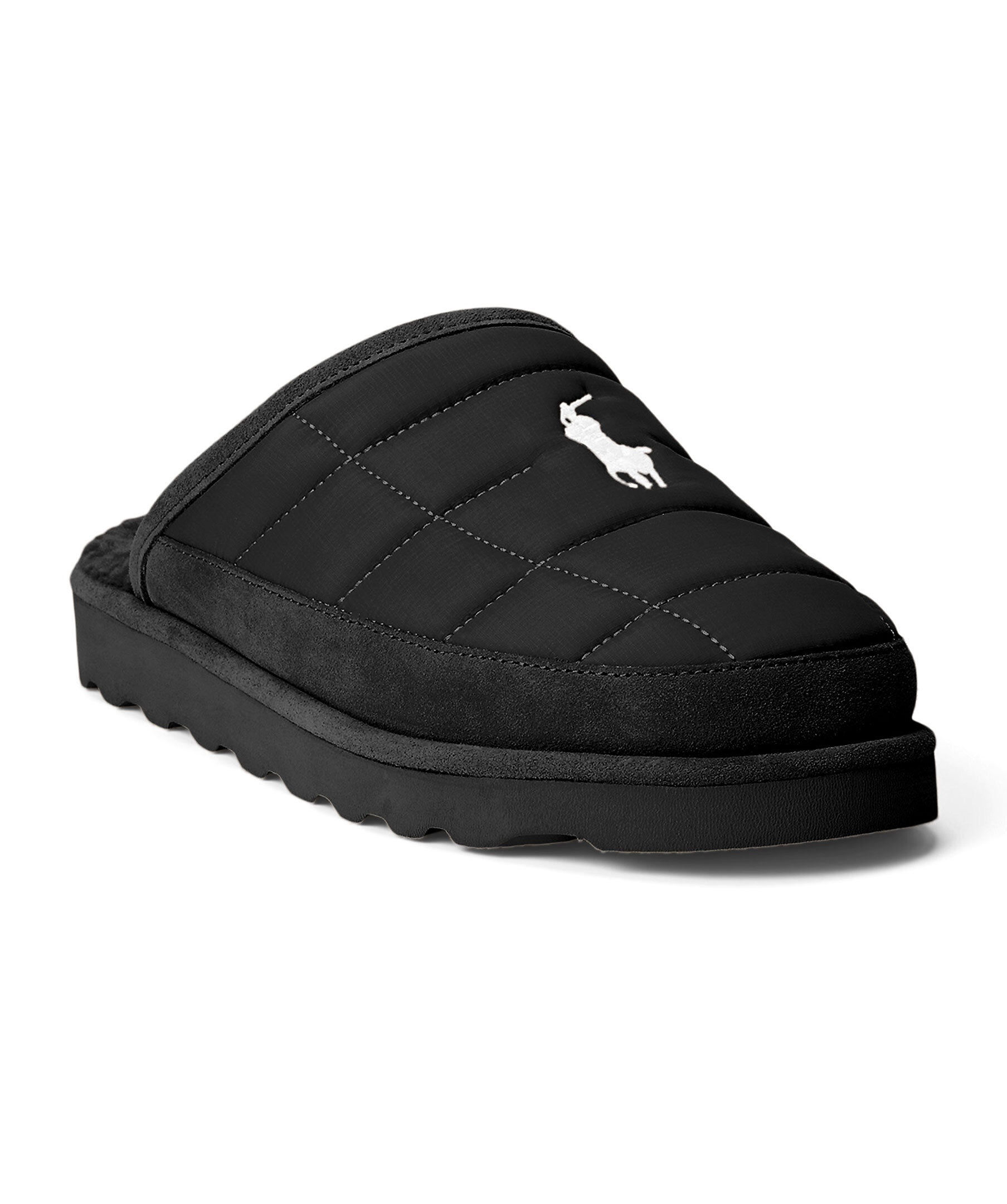 Svarta slippers från Ralph Lauren. Detaljer i mocka imitation, fleece innersula, quiltad ovansida med större broderad vit logotyp. Sula tillverkad av gummi.