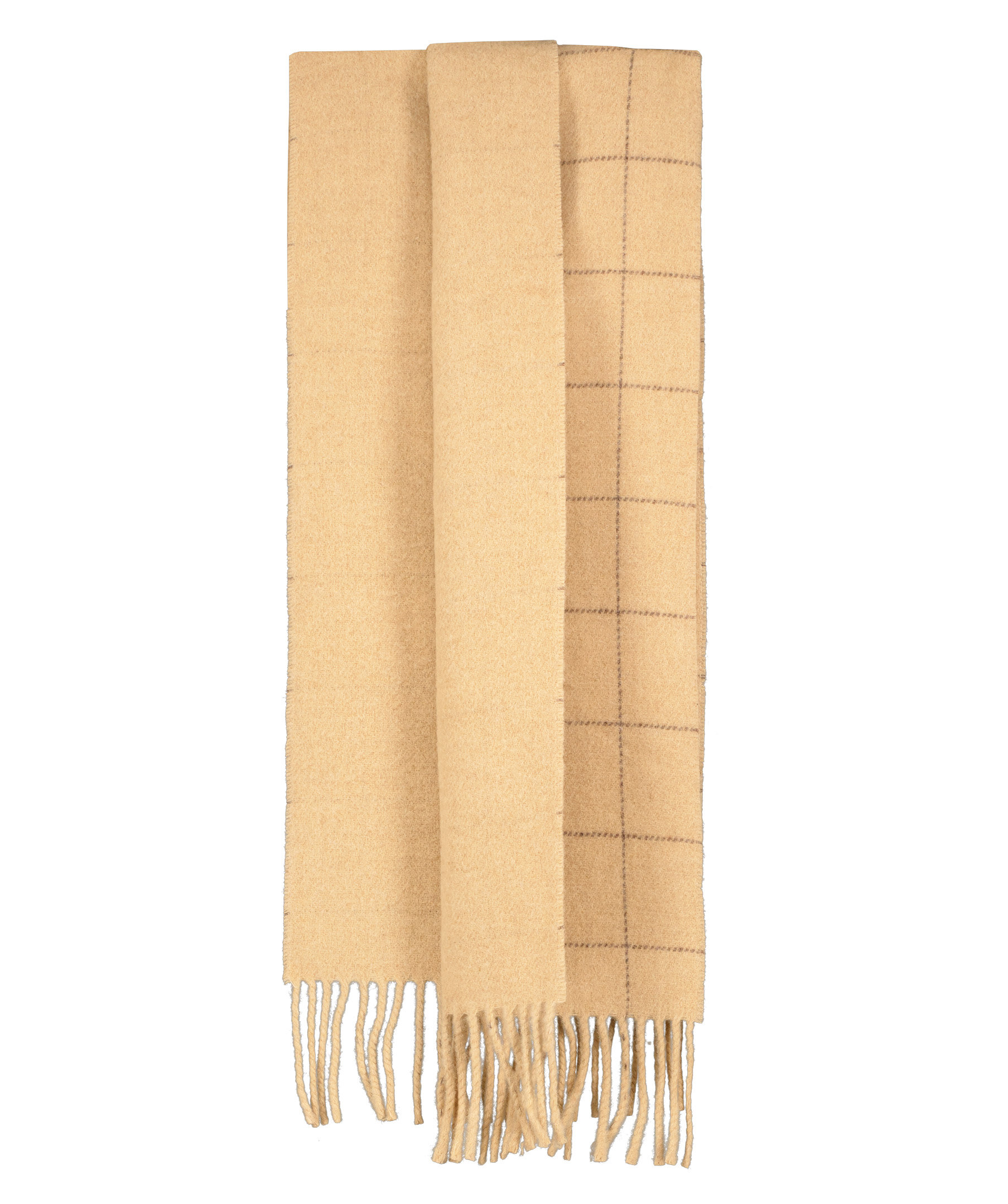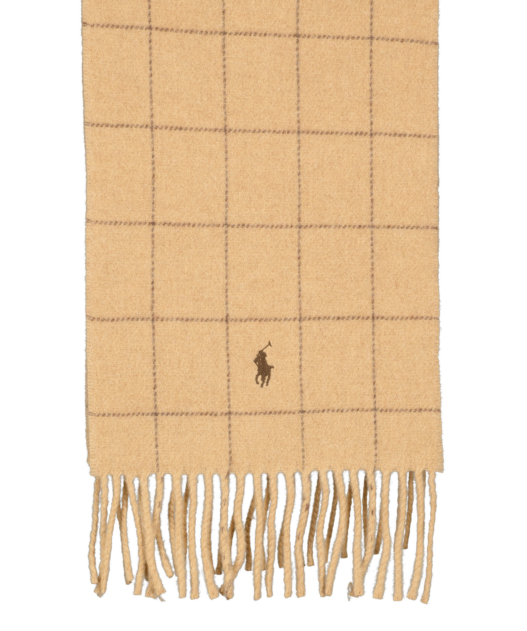 Kamelfärgad halsduk i ull från Polo Ralph Lauren. Ena sidan är enfärgad och den andra sidan har ett tunnt rutmönster. Fransar i kanterna och broderad klassisk häst på ena kortsidan på båda sidorna. Tillverkad i ullblandning. Mått: 26 cm bredd, 170 cm längd.