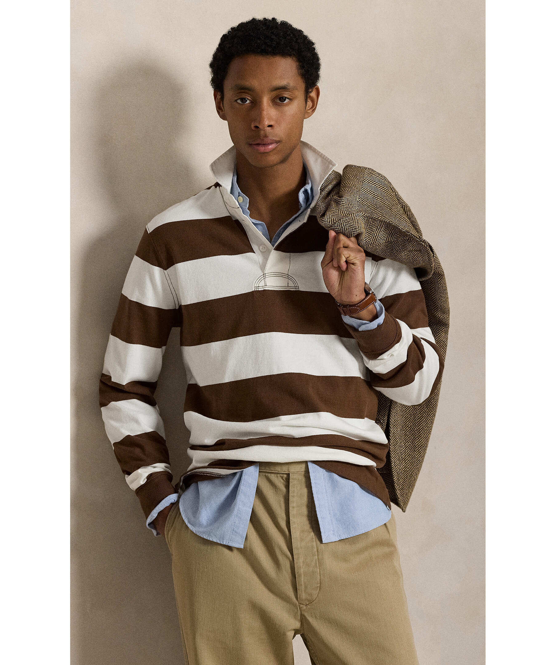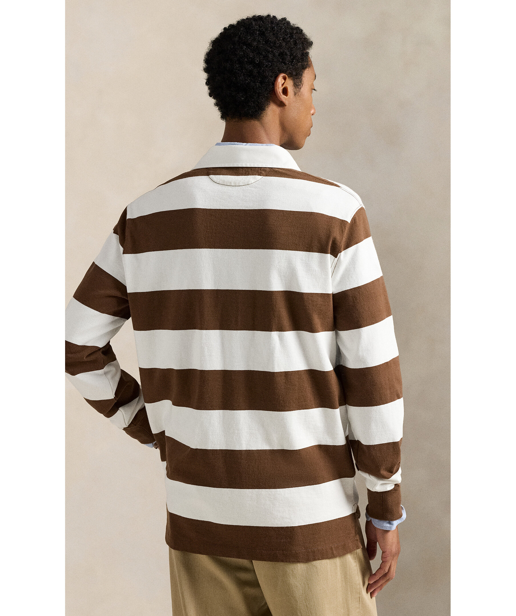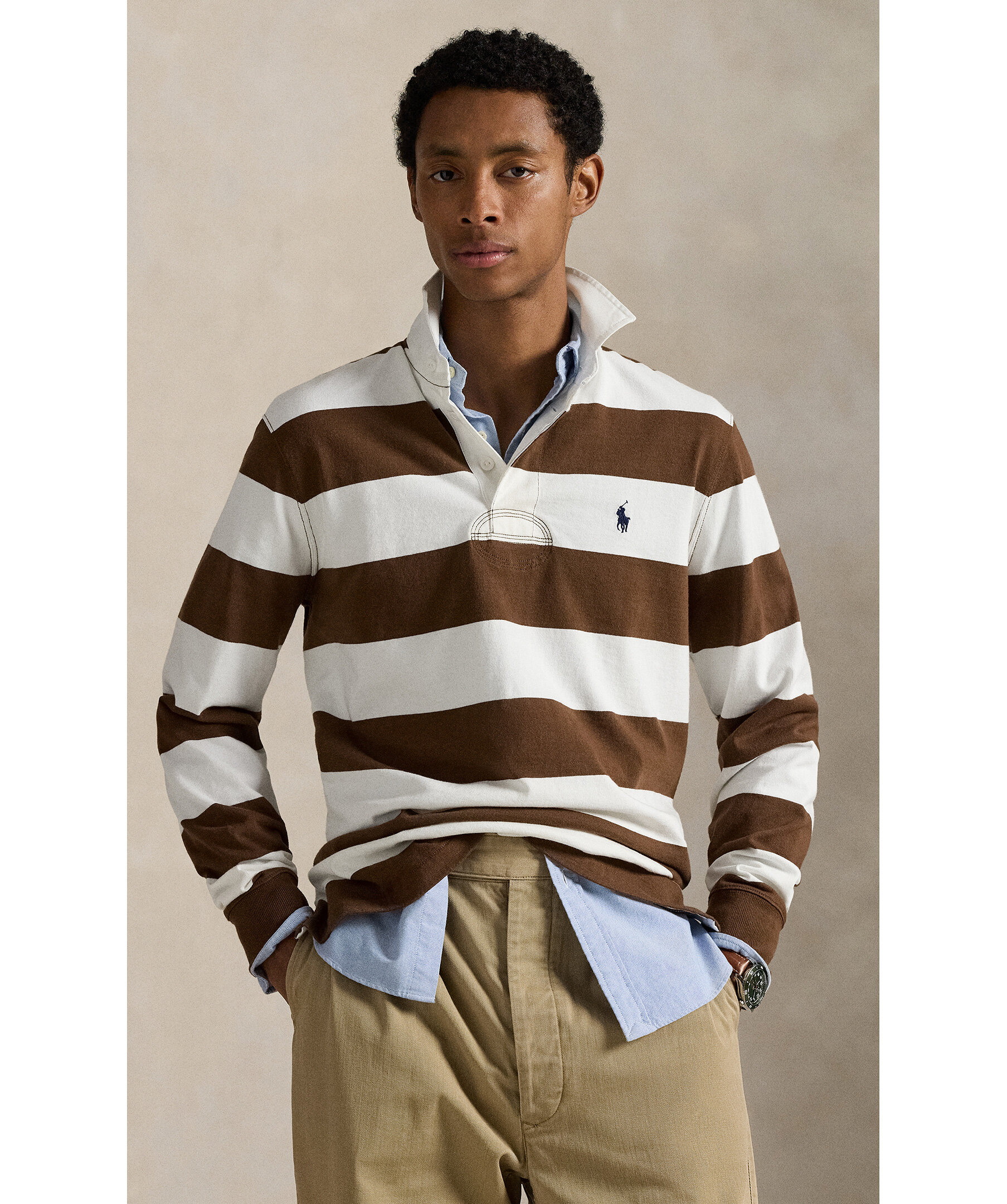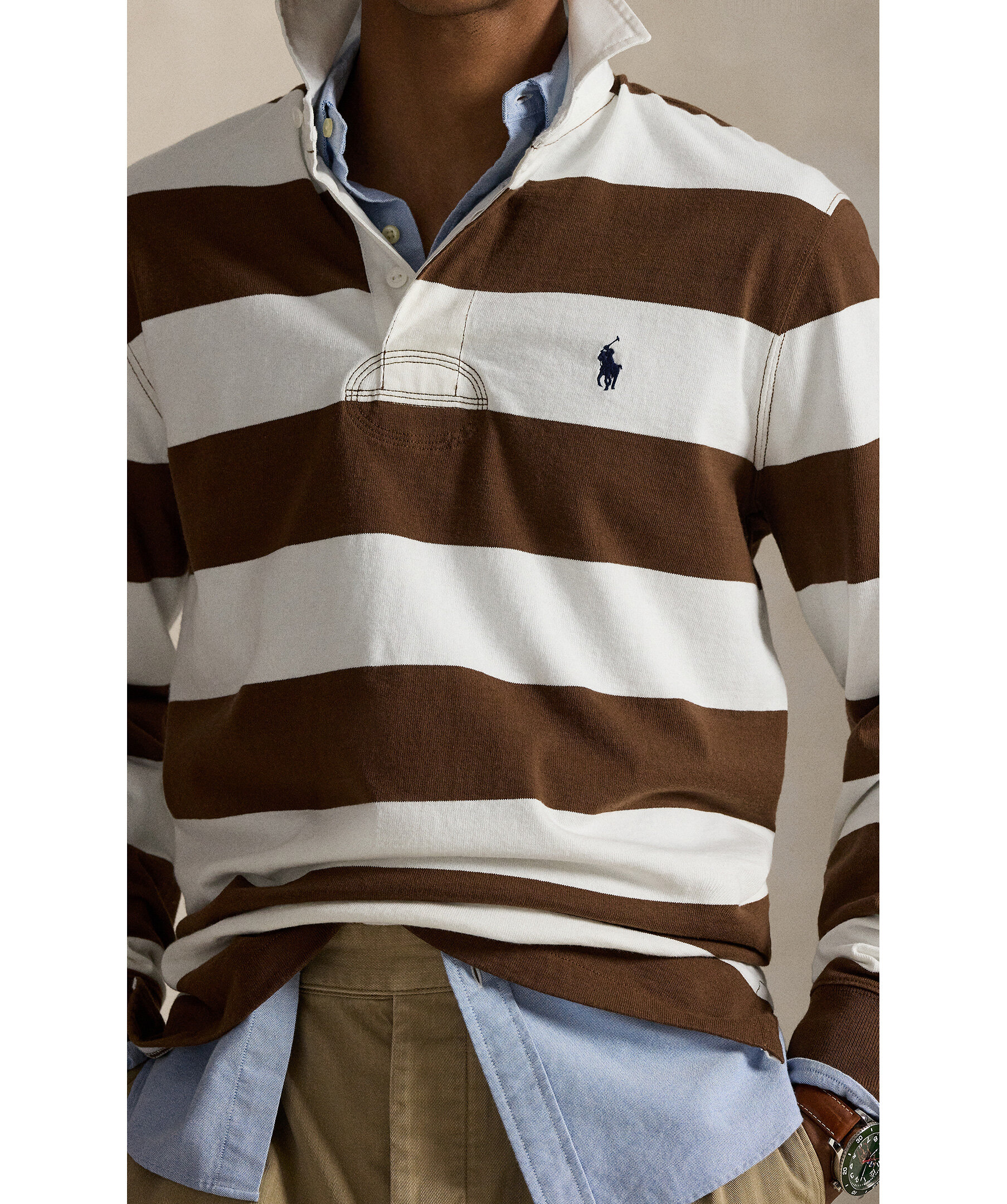 Randig rugbytröja i vinrött och vitt från Polo Ralph Lauren. Broderad polo-logotyp på bröstet. Gjord i kraftigt bomull. Vit krage.